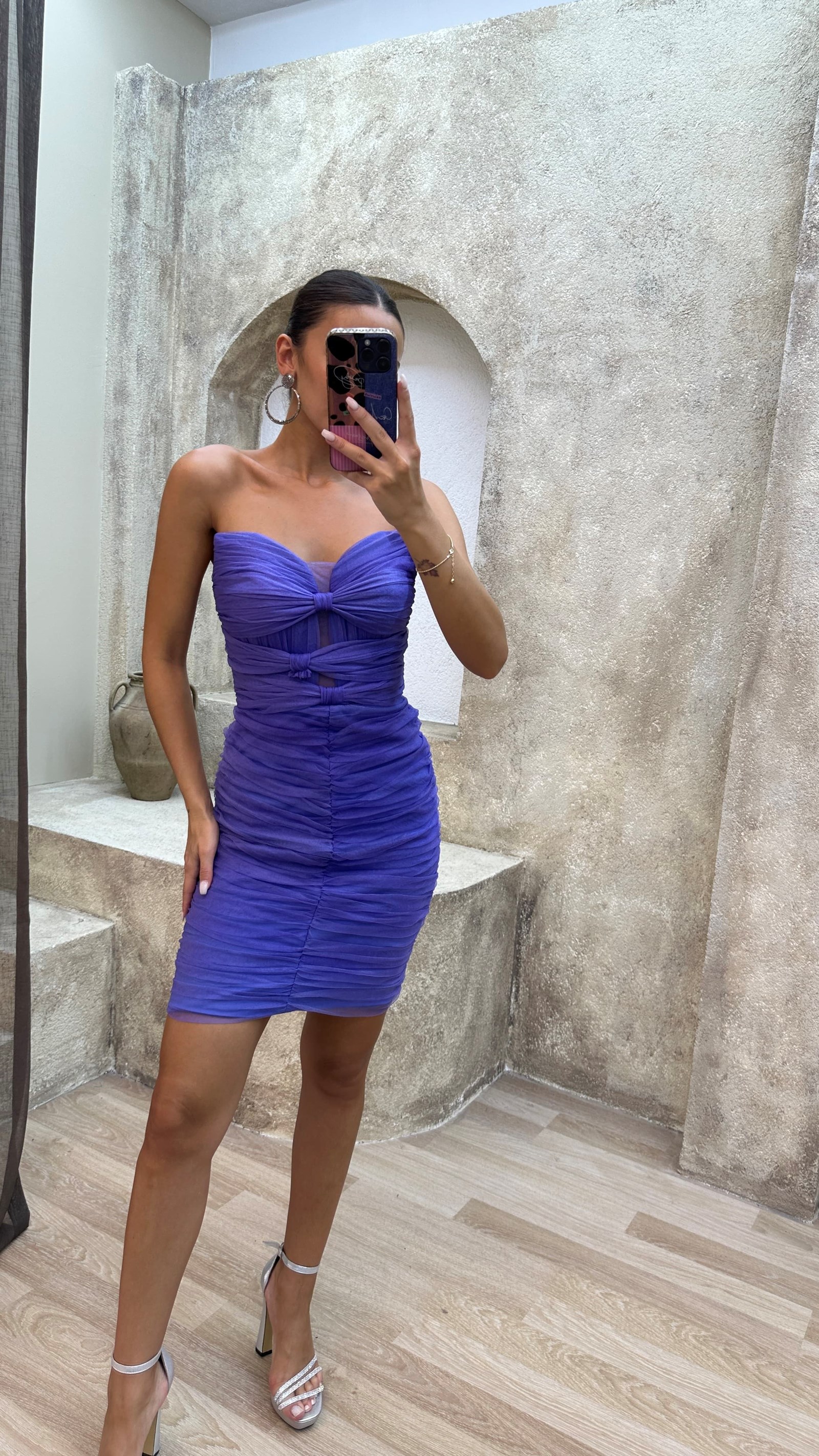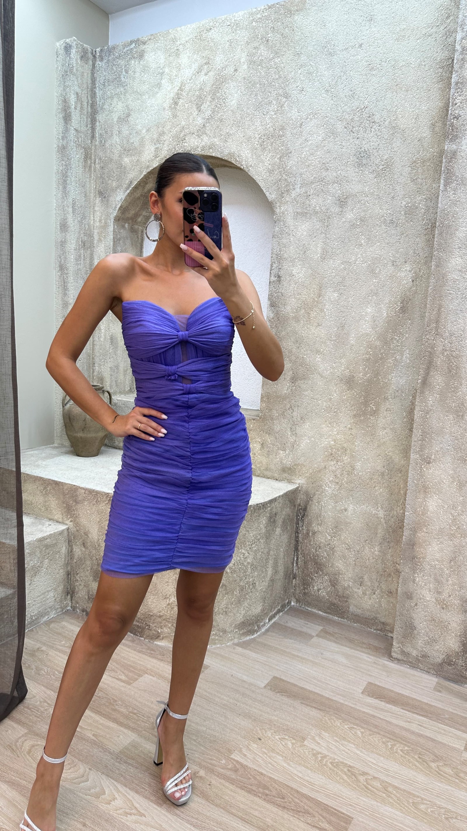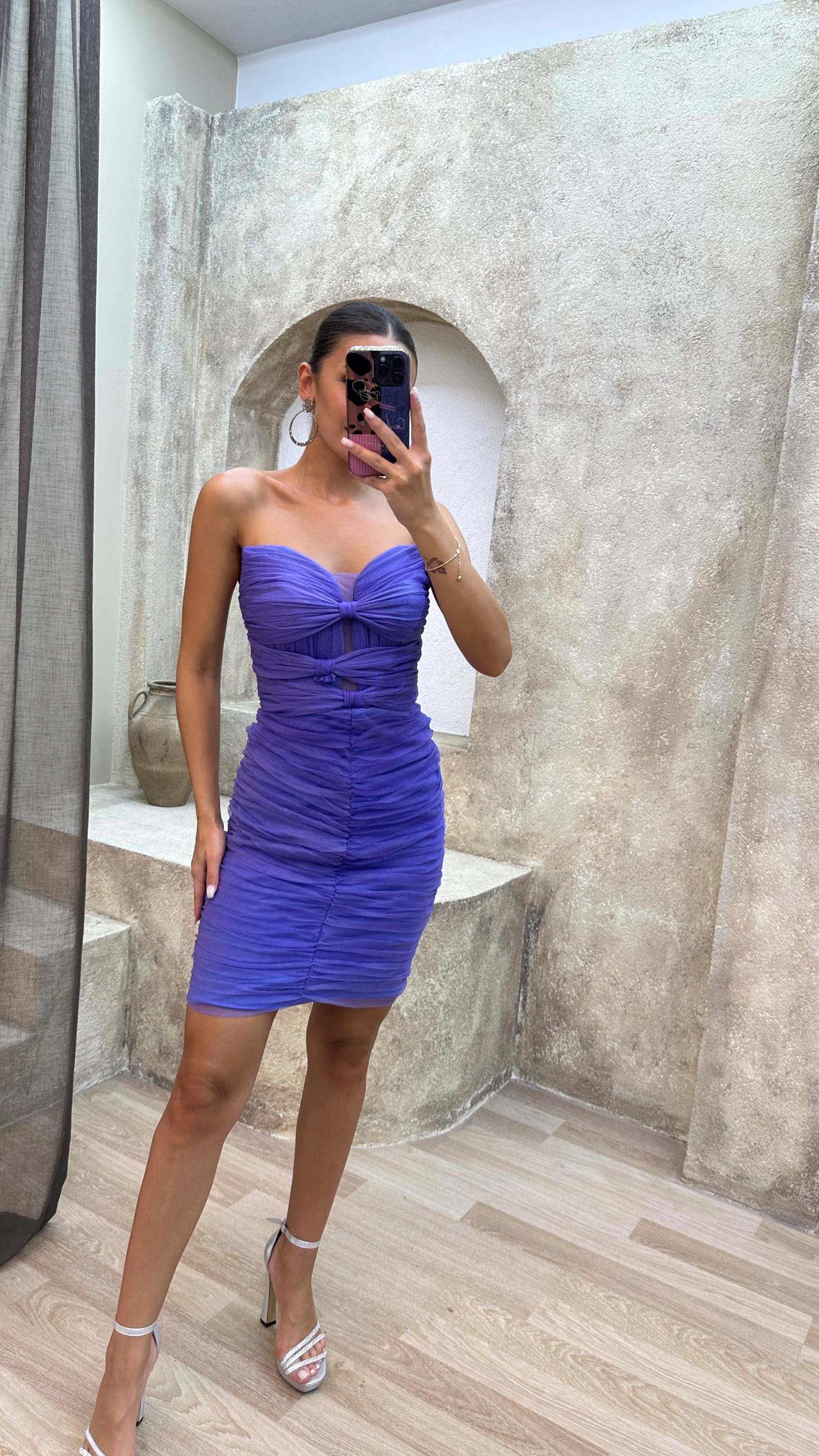 • Lila Straplez Göğsü Fiyonk Detay Mini Tül Elbise