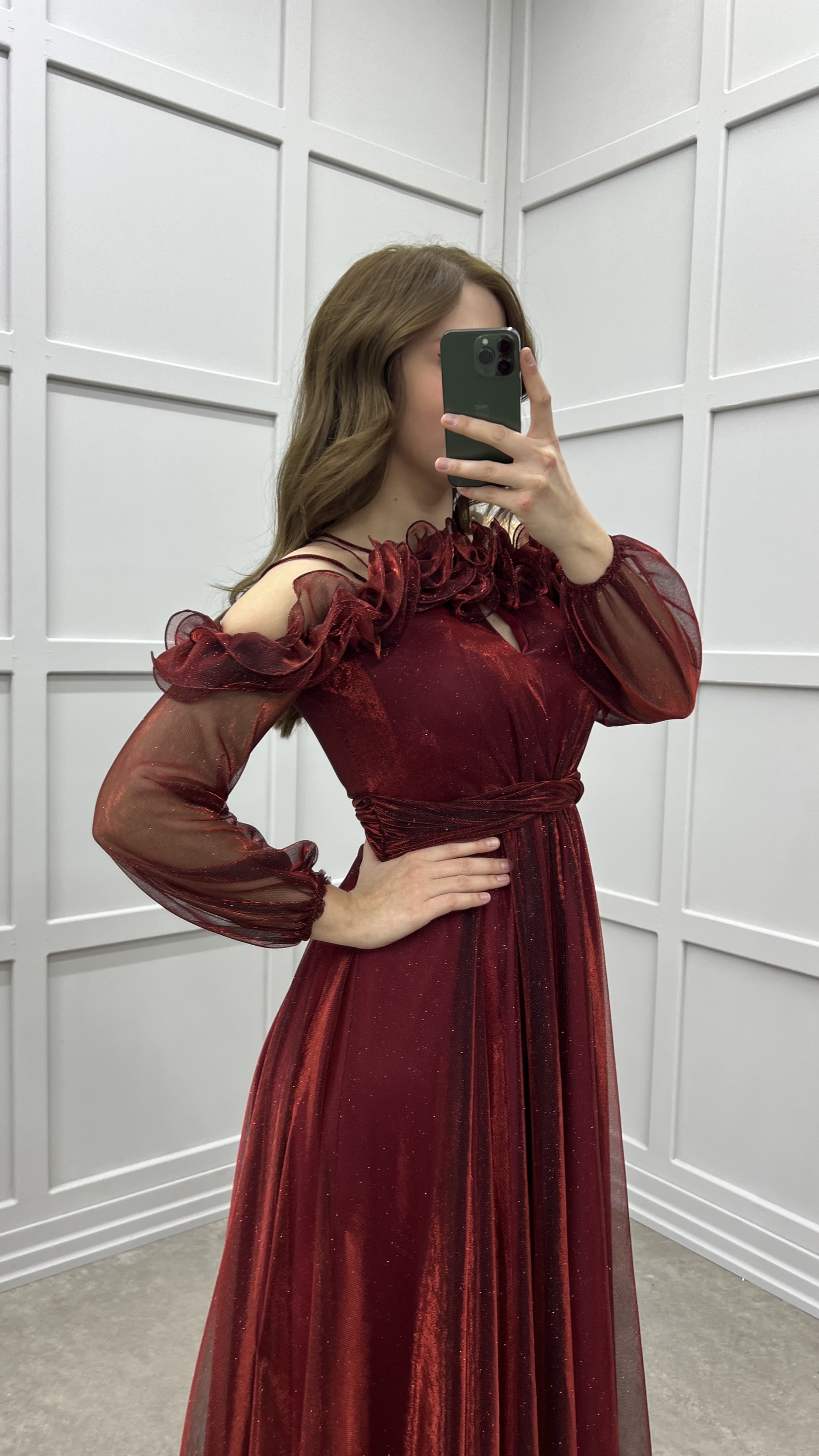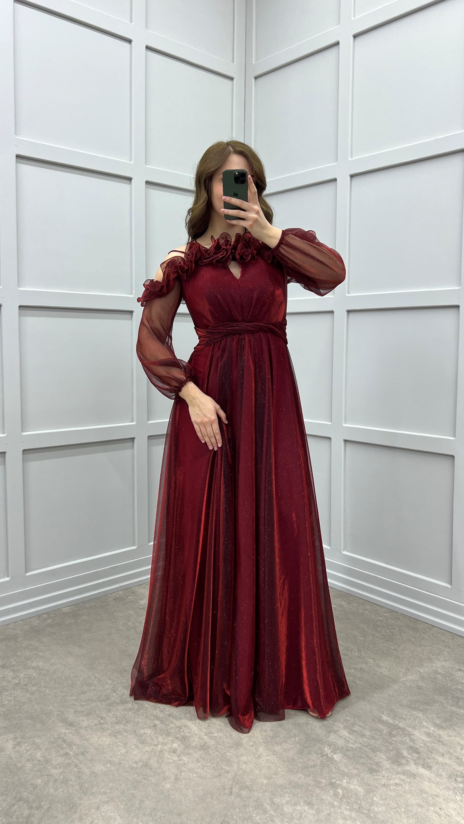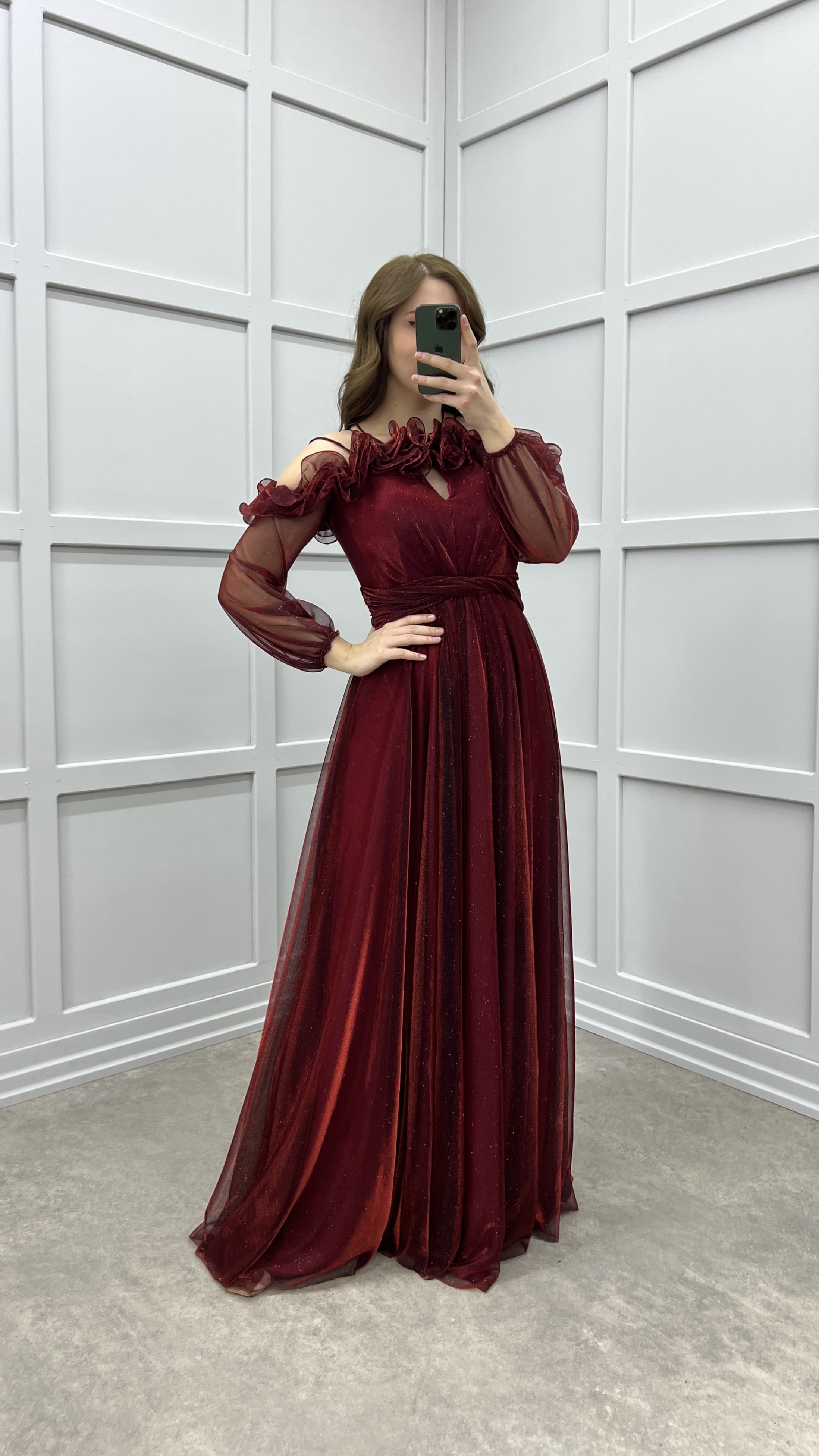 • Bordo Göğsü Fırfırlı Balon Kol Tasarım Abiye Elbise