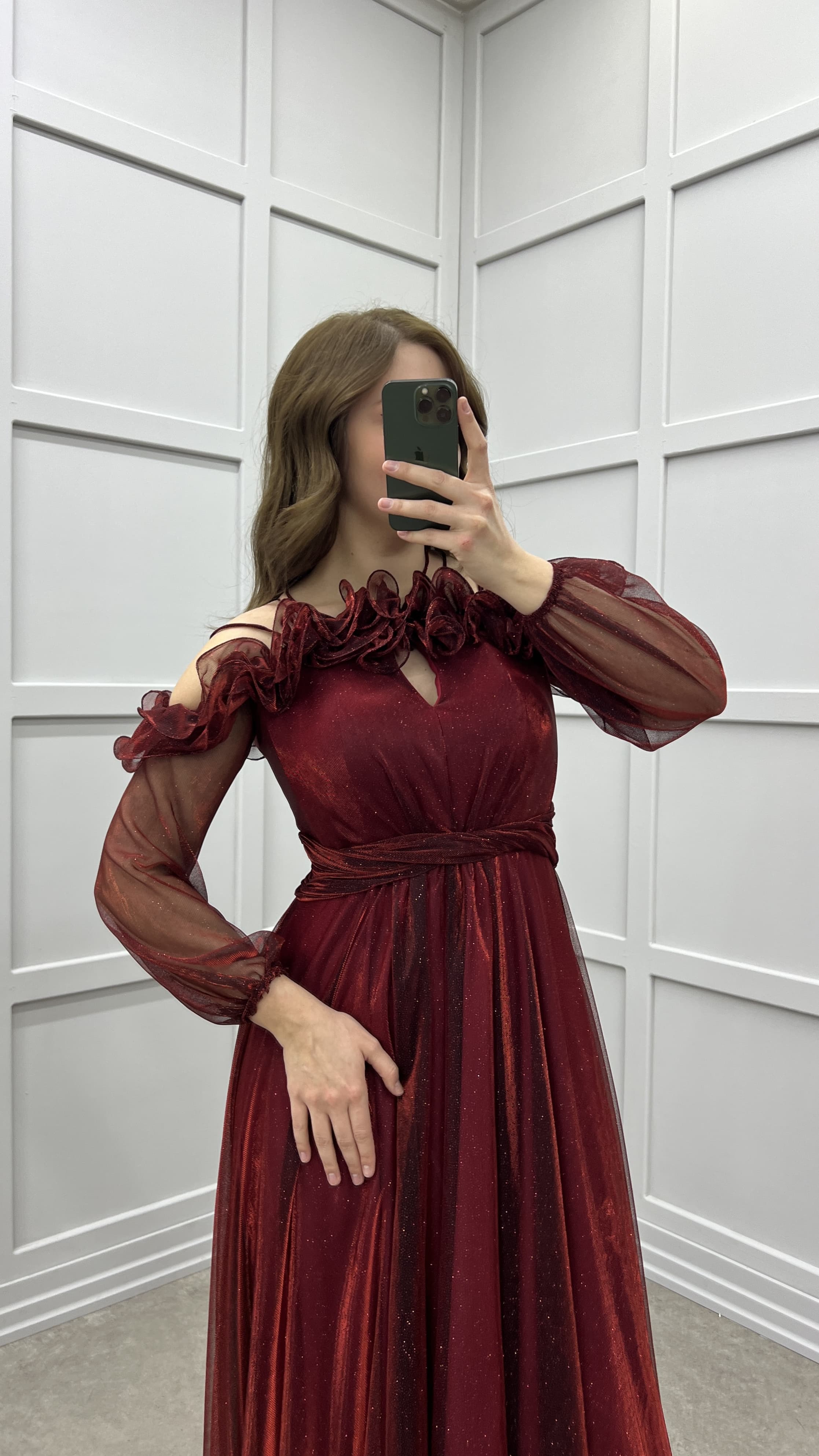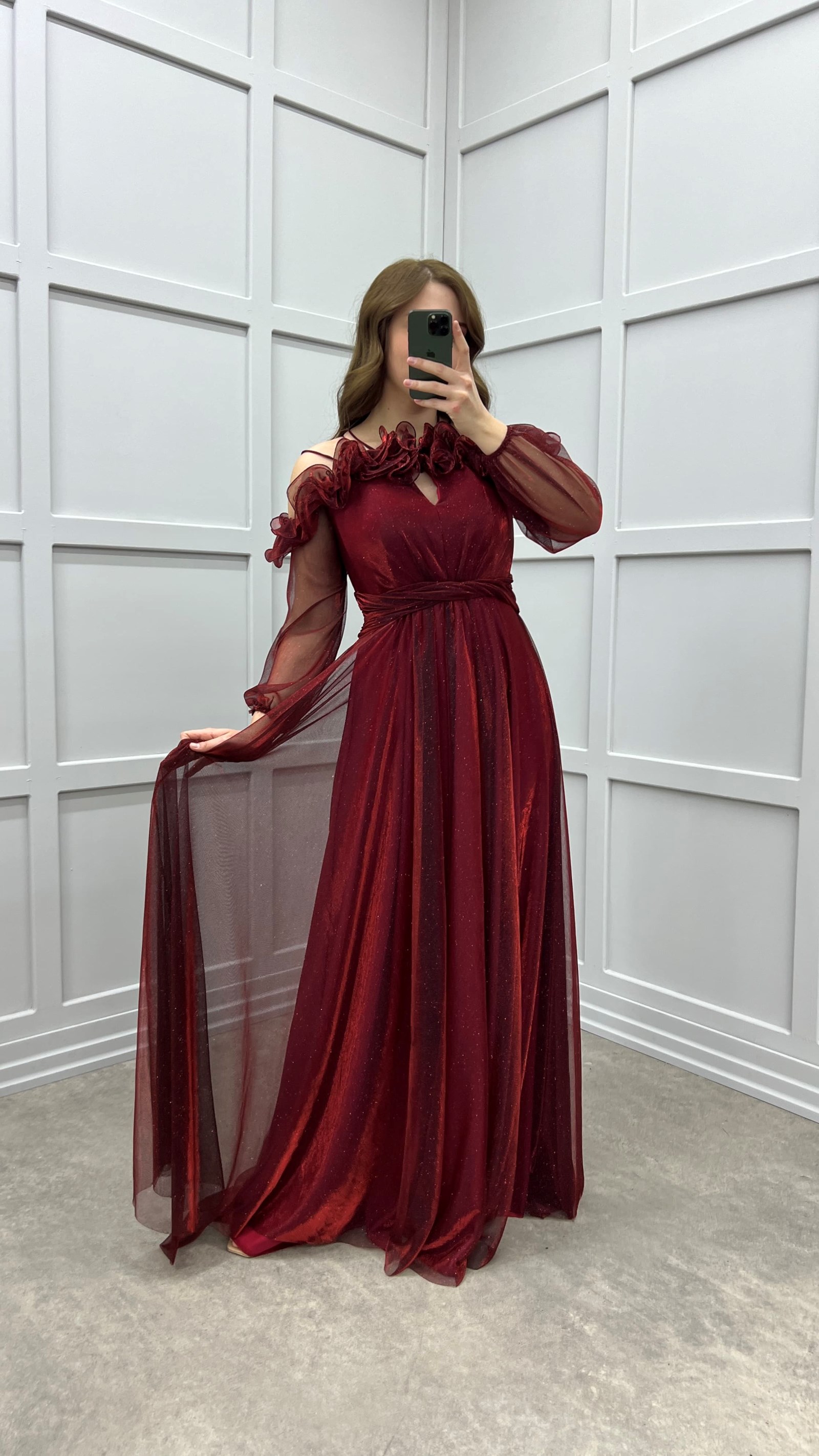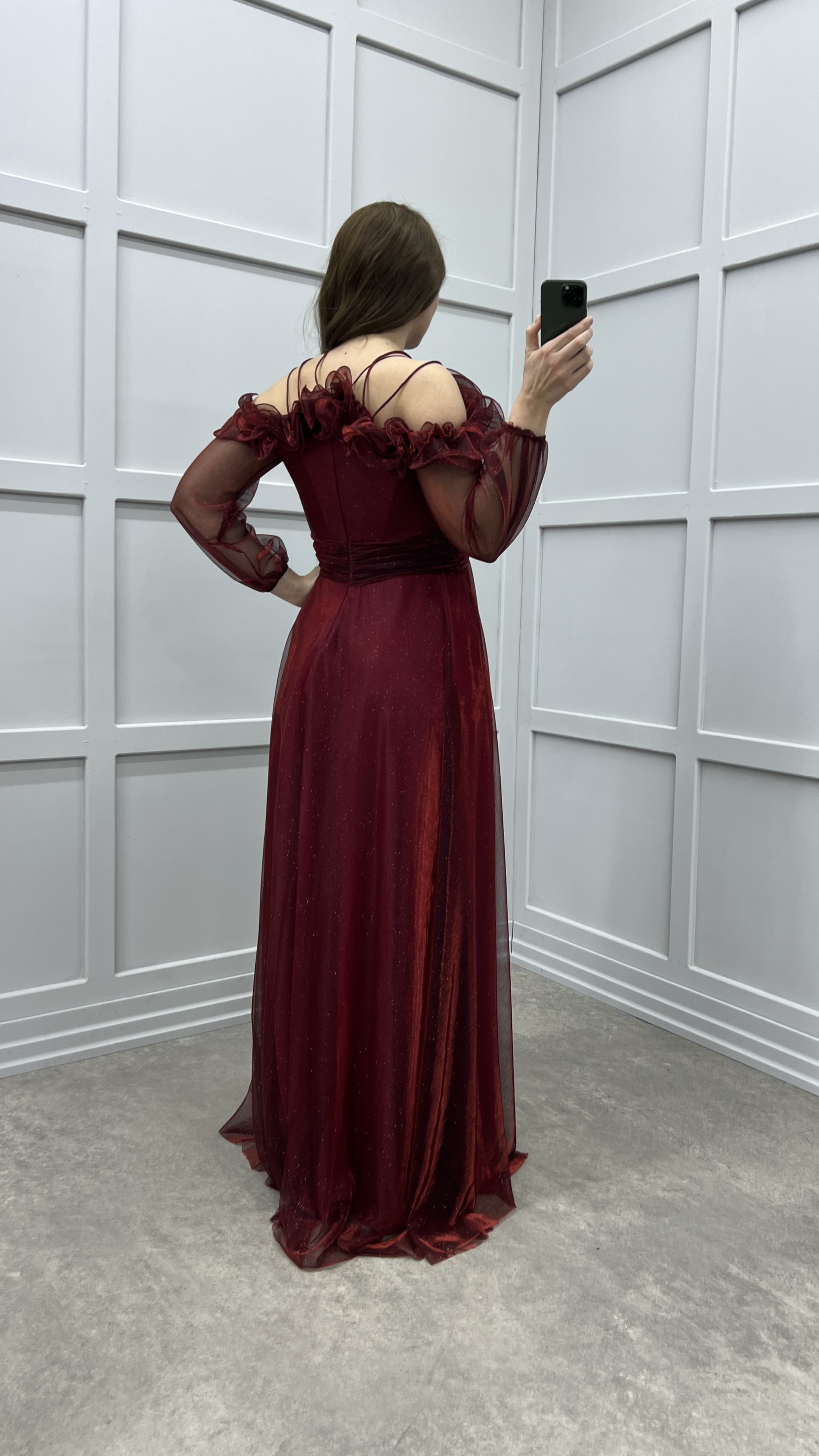 • Bordo Göğsü Fırfırlı Balon Kol Tasarım Abiye Elbise