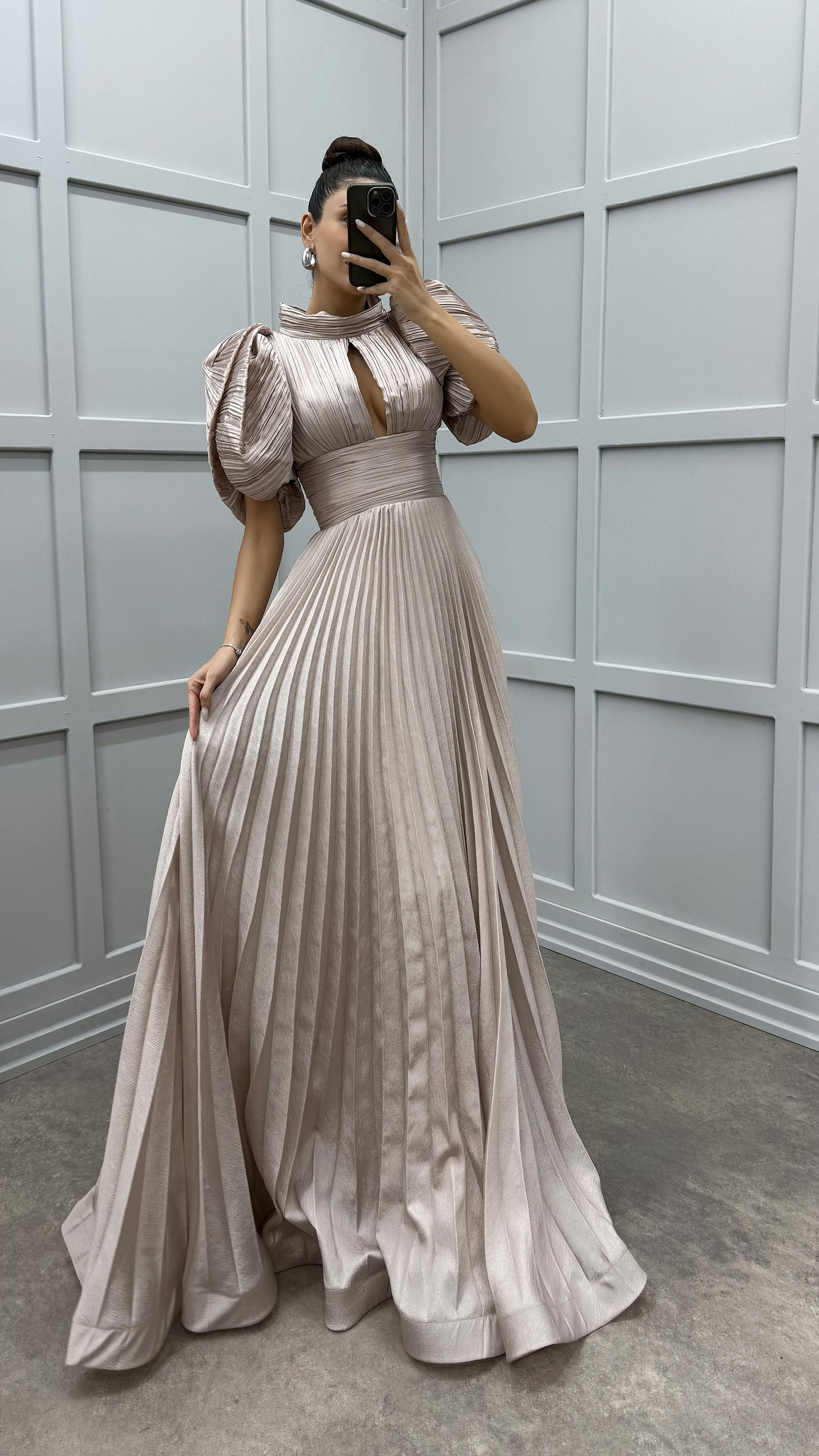 Robe de soirée plissée à manches beiges