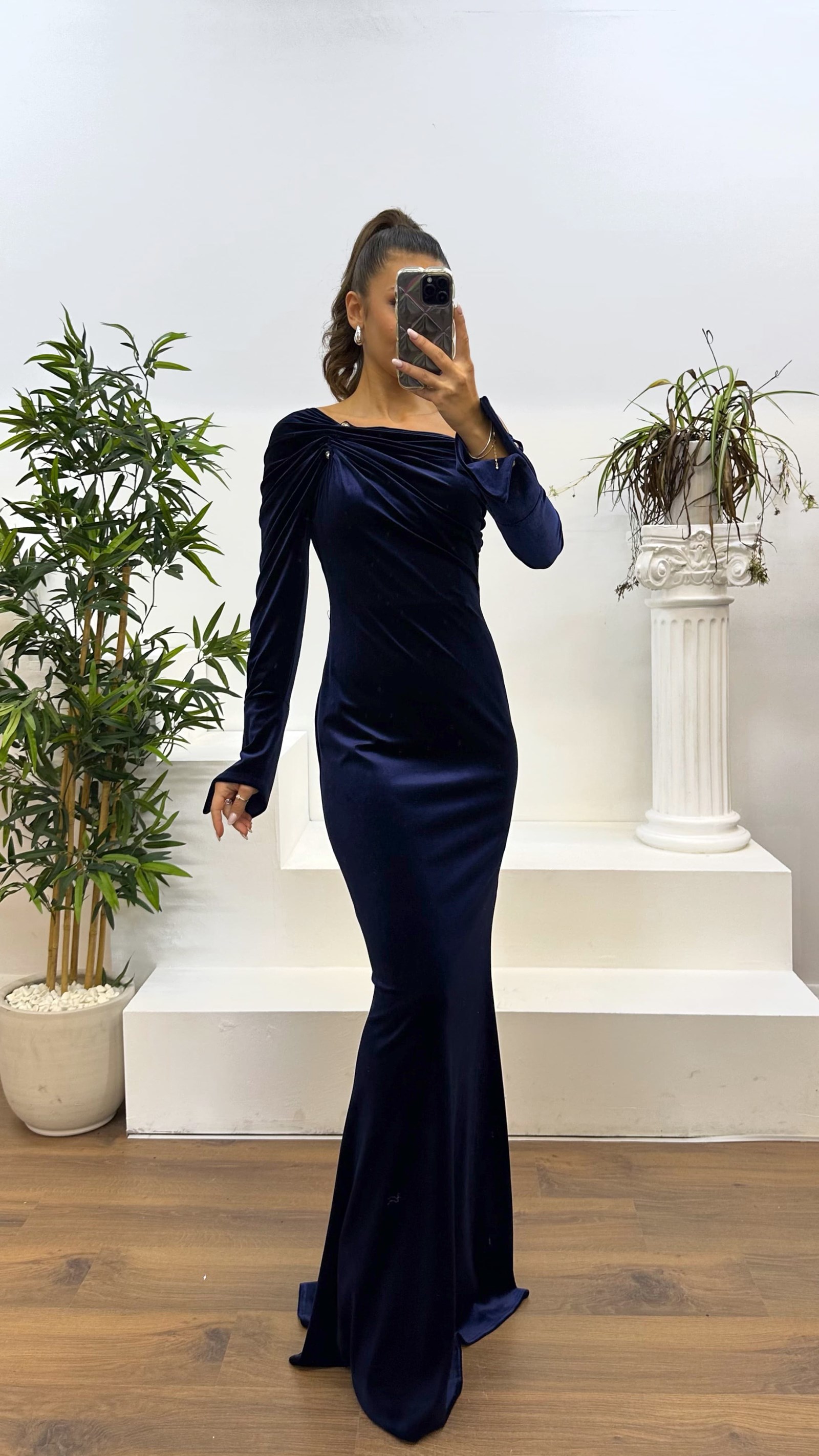• Lacivert Kayık Yaka Kadife Abiye Elbise