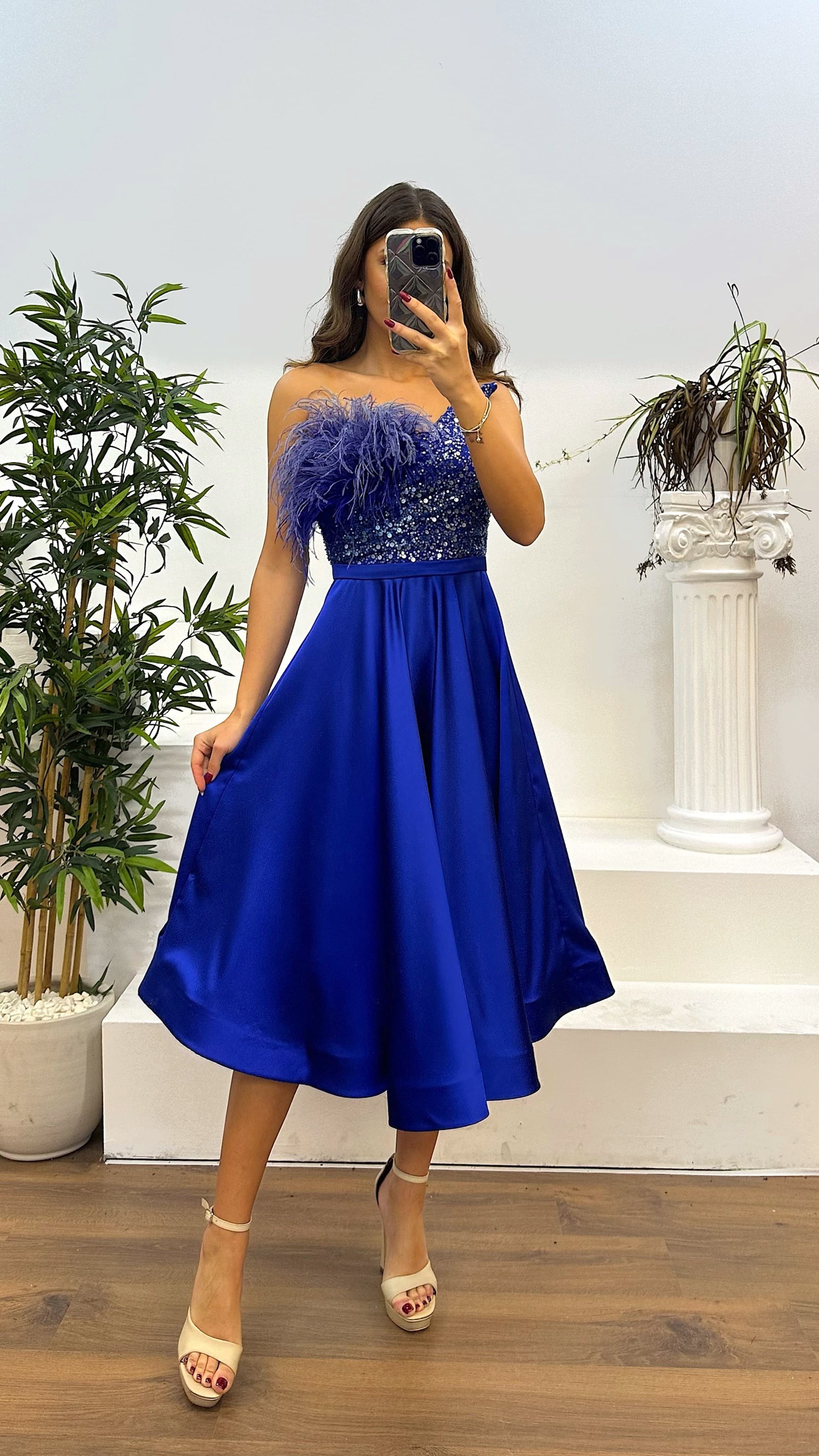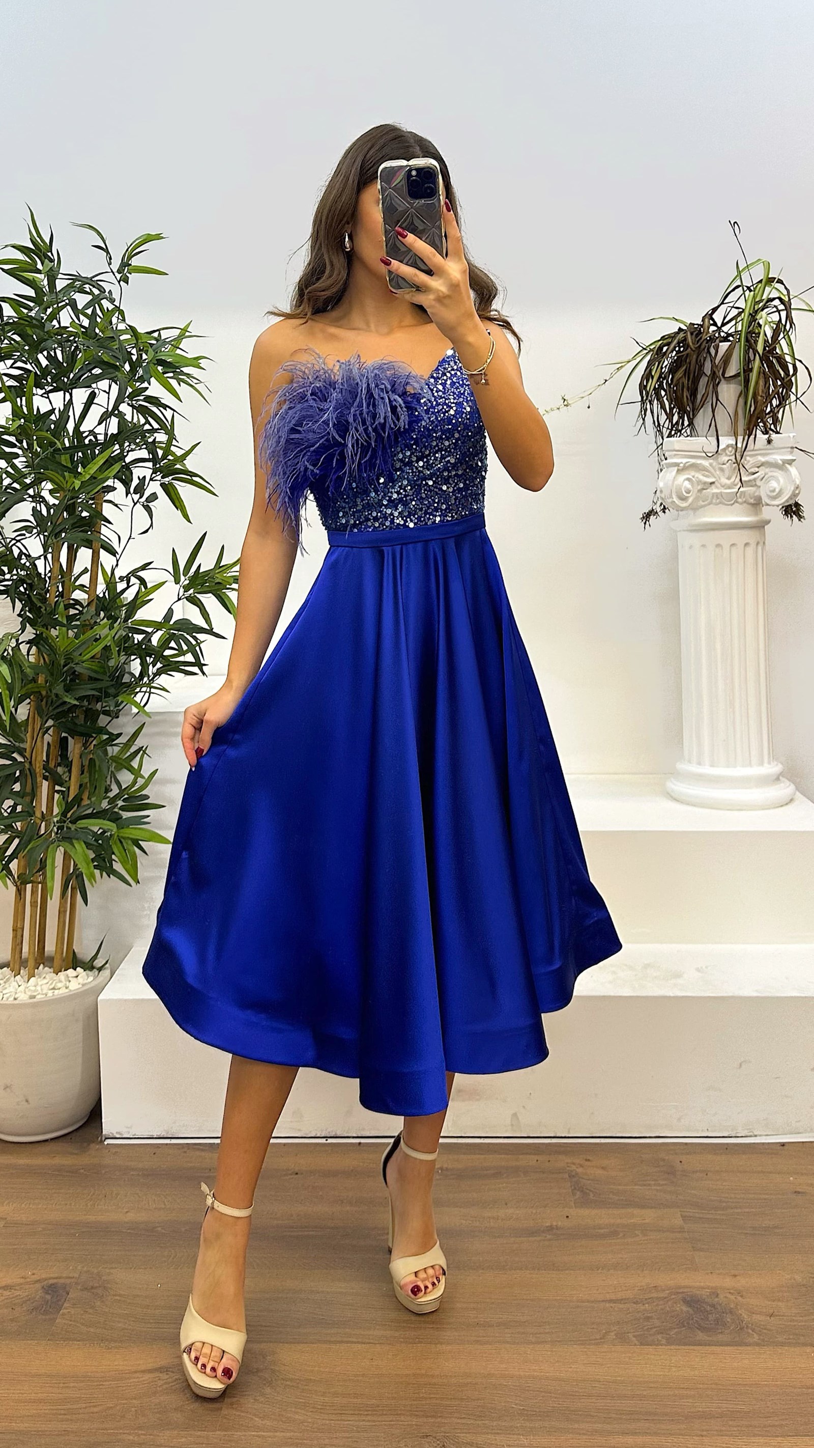 Robe de soirée avec détails de plumes Le produit convient aux tailles 36-42, avec un soutien-gorge rembourré, doublé, fermeture éclair au dos. Longueur du produit : 150 cm. Type de tissu : sequins 100% polyester - satin polyester, viscose.