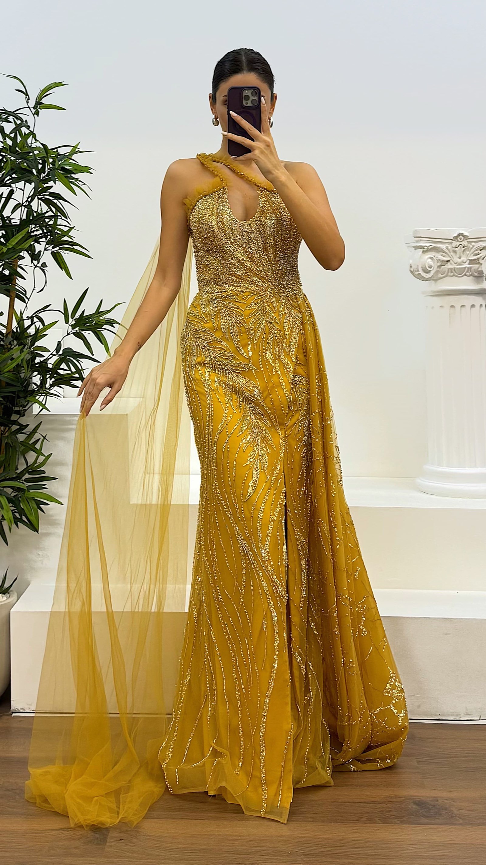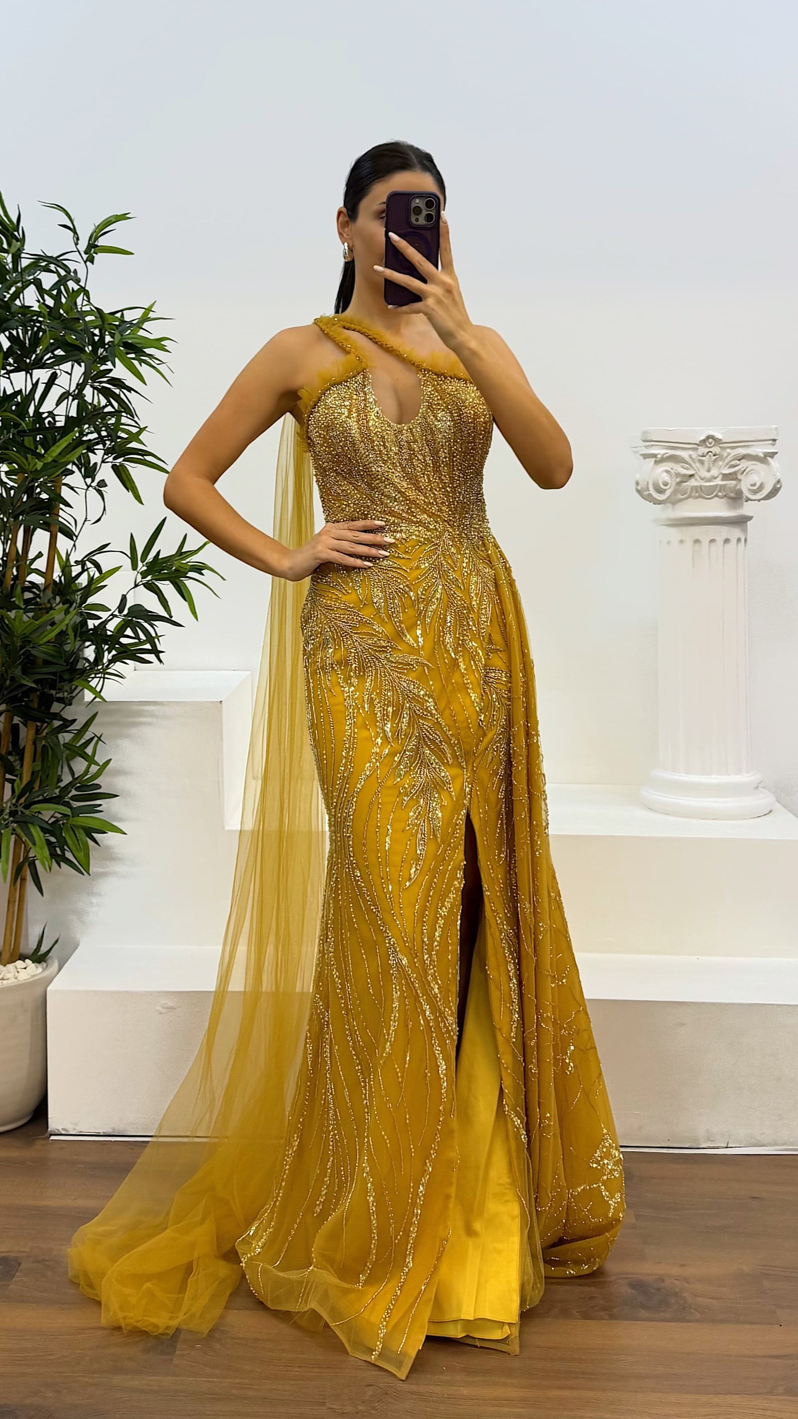 Robe de soirée design avec détails en tulle brodé à une épaule Tailles disponibles : Convient aux tailles 36 à 46. Détails : Conçue avec des coques intégrées, doublée, fermeture zippée à l’arrière, broderies et fente élégante. Longueur du produit : Varie entre 165 et 170 cm. Composition du tissu : 97 % polyester, 3 % lycra, avec détails en tulle.