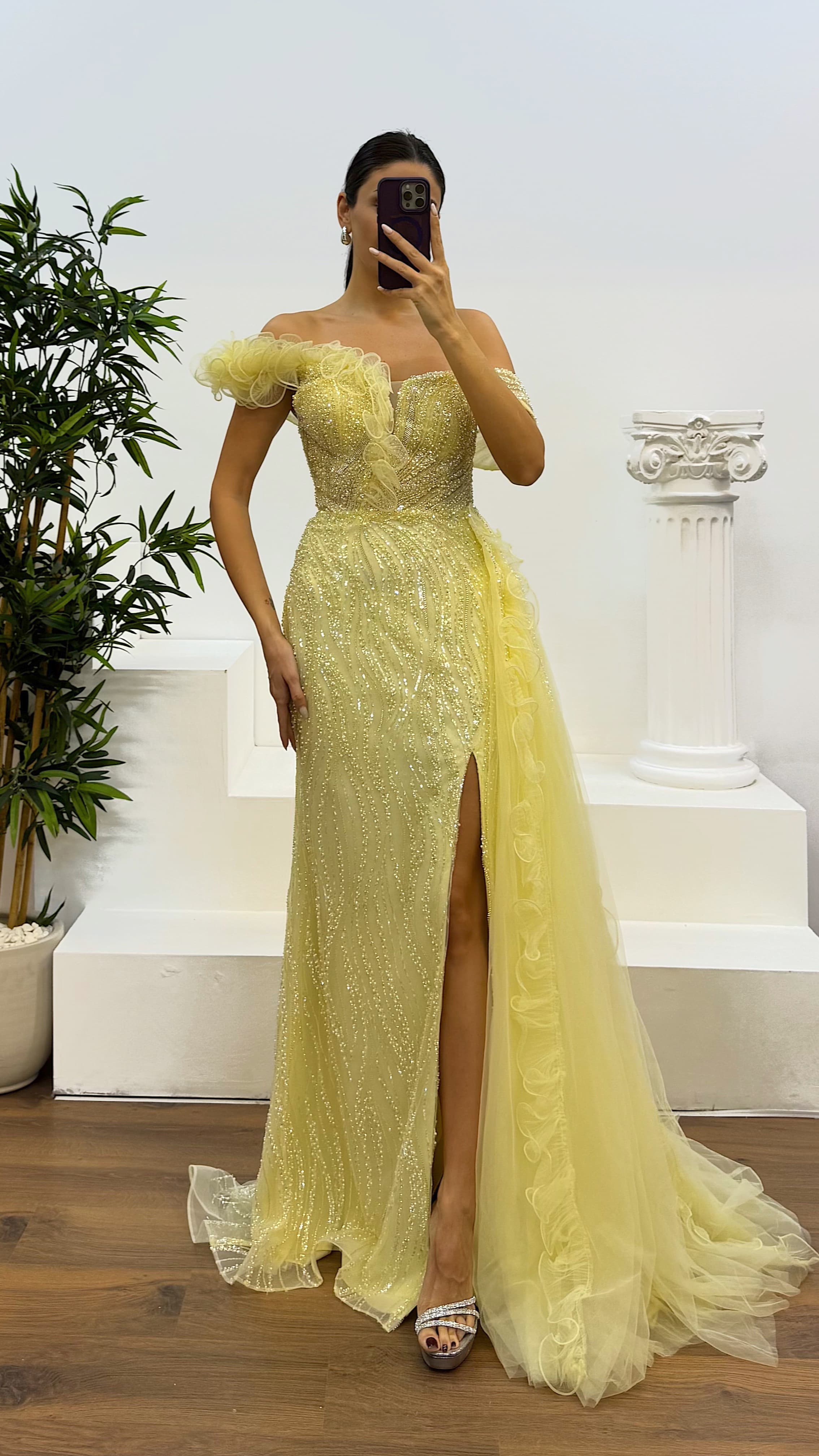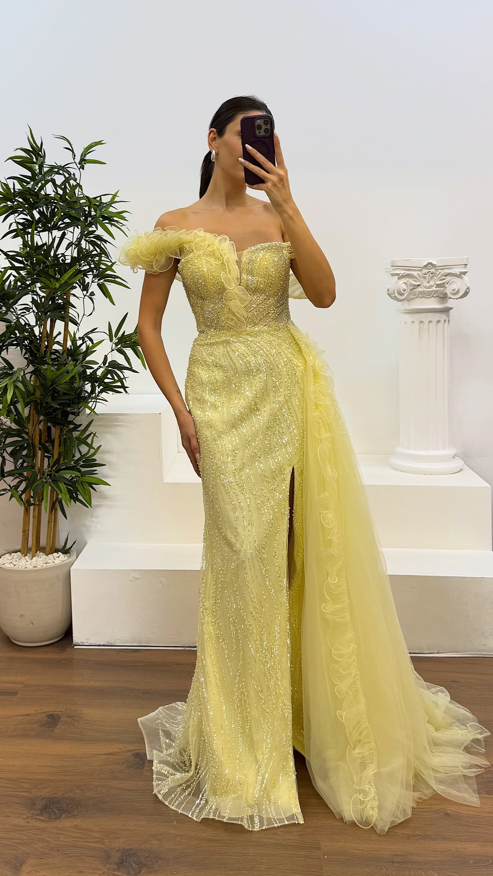 Robe de soirée en tulle brodée à une épaule Le produit est conçu comme un coussinet de poitrine, une doublure, une fermeture éclair au dos, une queue latérale, une robe de soirée avec des fentes compatibles pour les tailles jusqu'à 36-46. Longueur du produit: Il est de 165-170 cm. Type de tissu: tulle 3% lycra 97% polyester