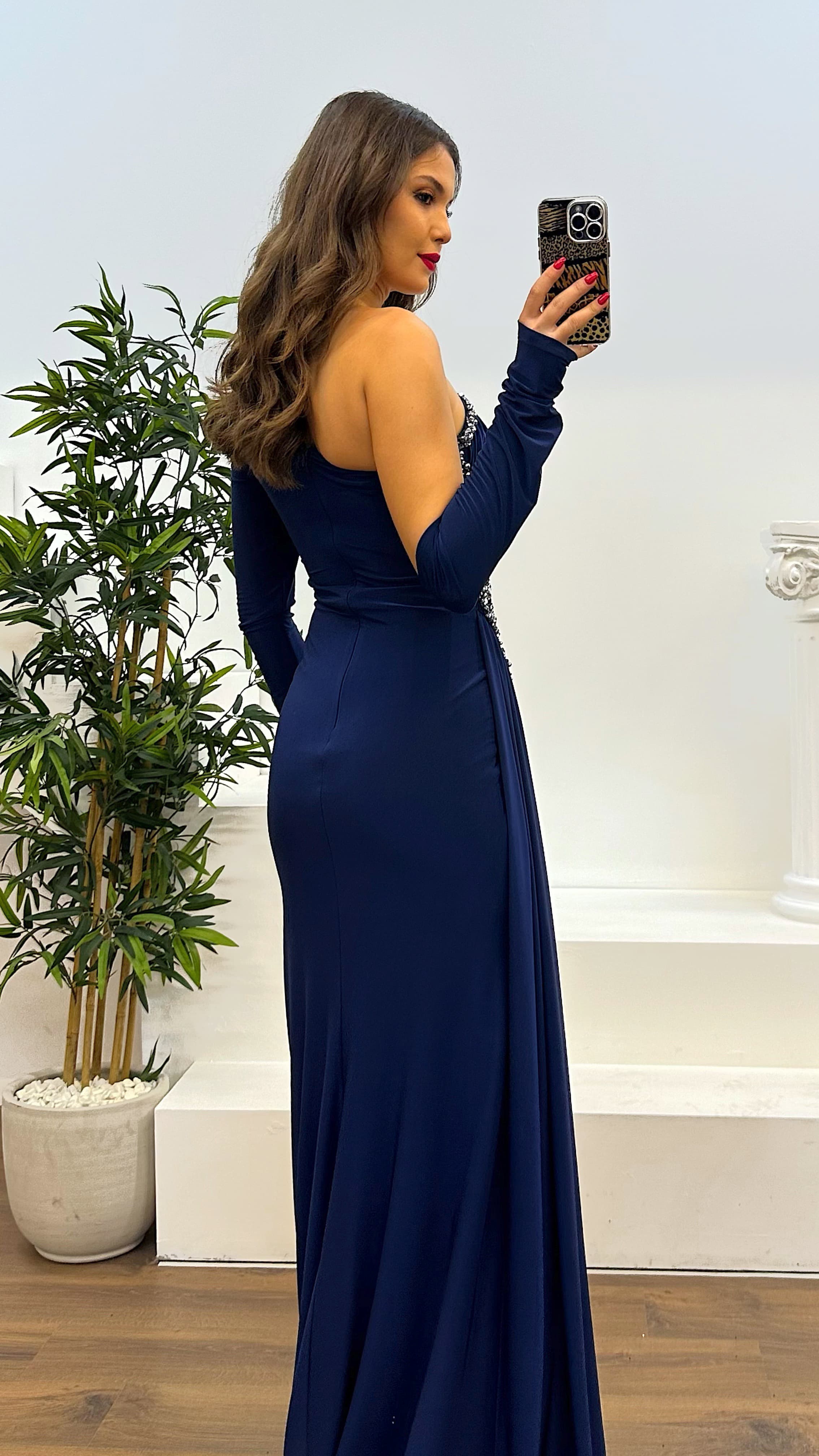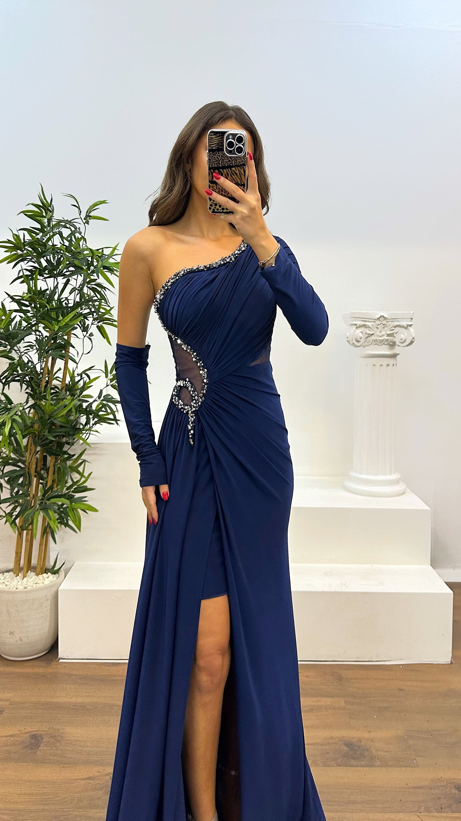Robe de soirée à épaule unique avec détails de broderie Le produit est compatible avec les tailles de 36 à 44, avec des coussinets pour la poitrine, doublée, avec une fente, design à une épaule, fermeture éclair au dos et détails de broderie. La longueur du produit peut varier entre 165 et 170 cm. Type de tissu : satin 100% polyester.