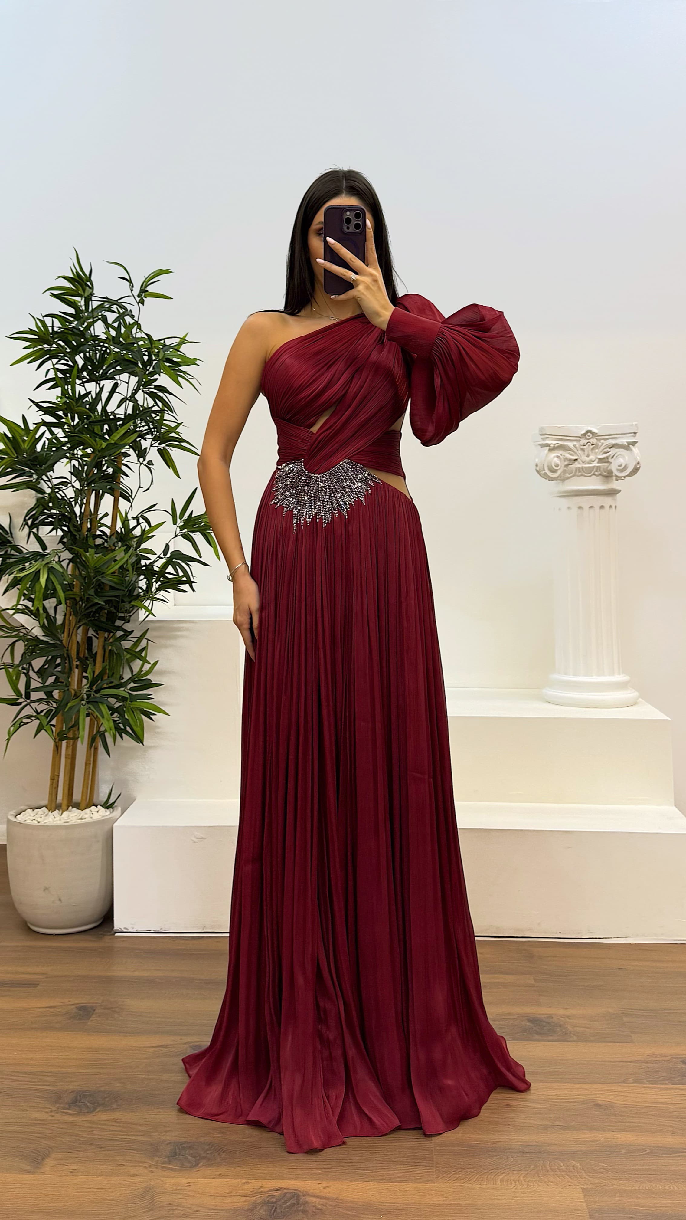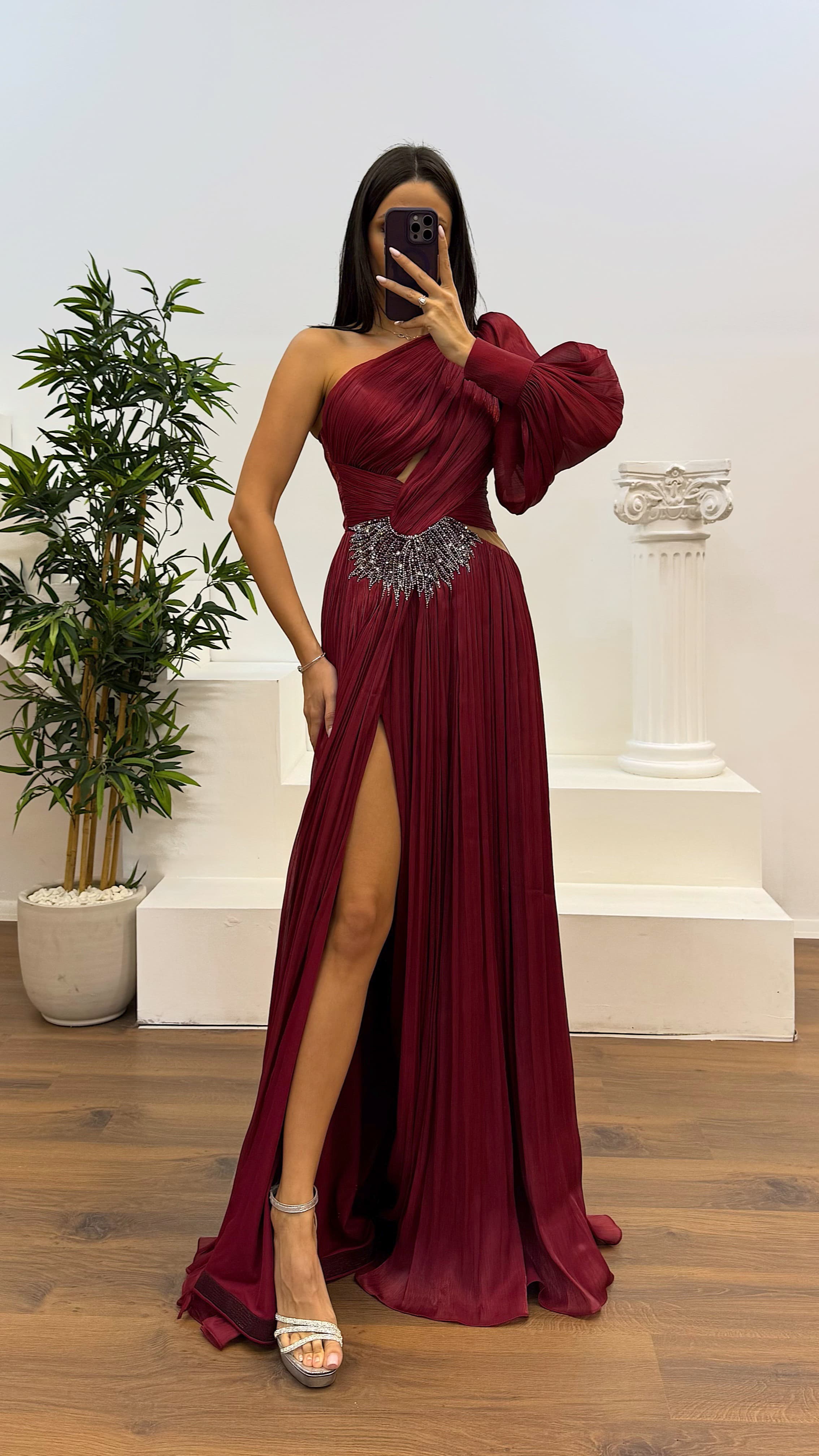 Robe de soirée plissée à une épaule Le produit est compatible avec les tailles 36-42, avec des coussinets de poitrine, doublé, fermeture à glissière à l'arrière, une épaule, une fente et orné de pierres. La longueur de la robe peut varier entre 165 et 170 cm. La longueur de la manche est de 60 cm. Type de tissu : chiffon 66% viscose 34% polyester.