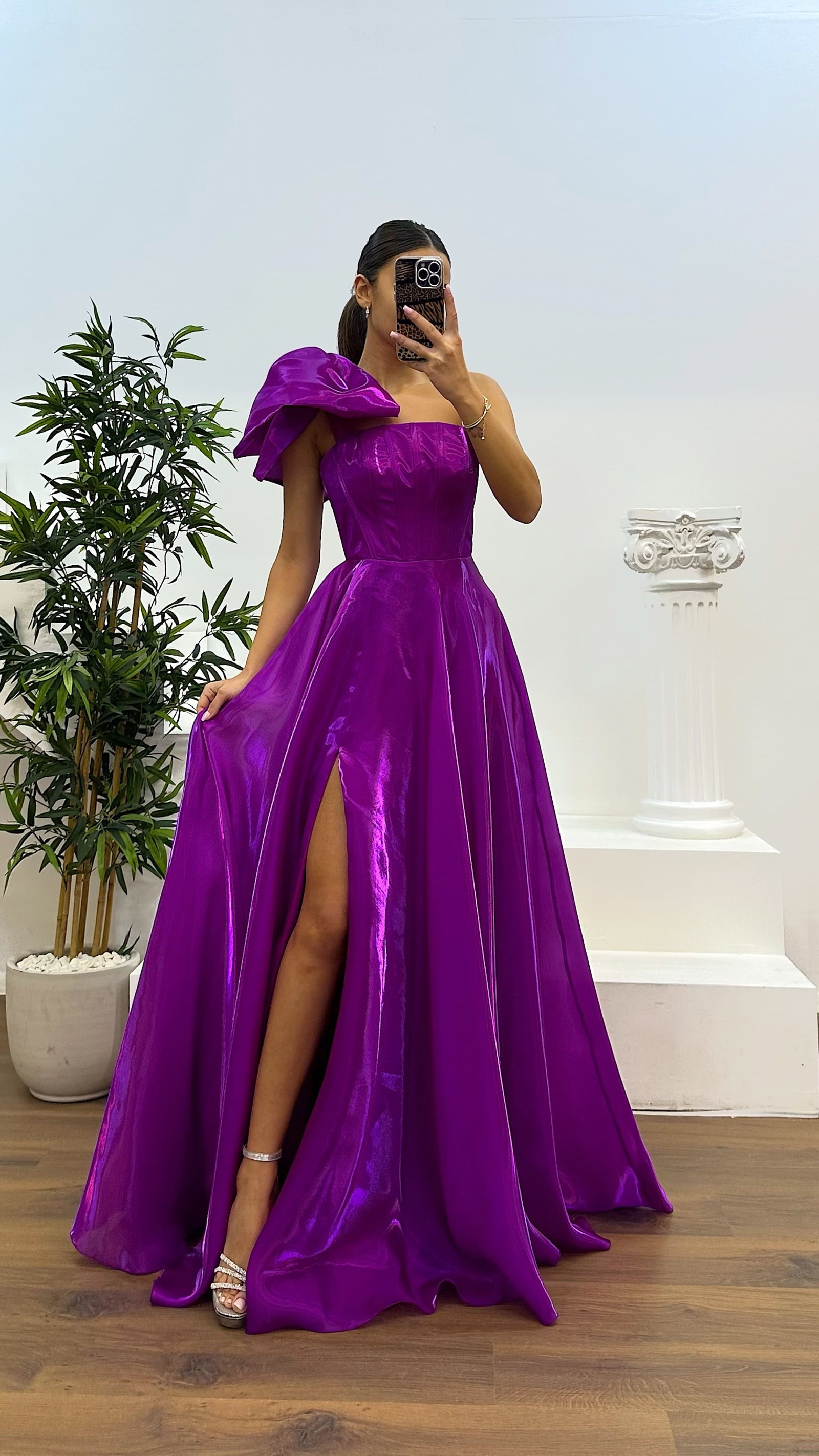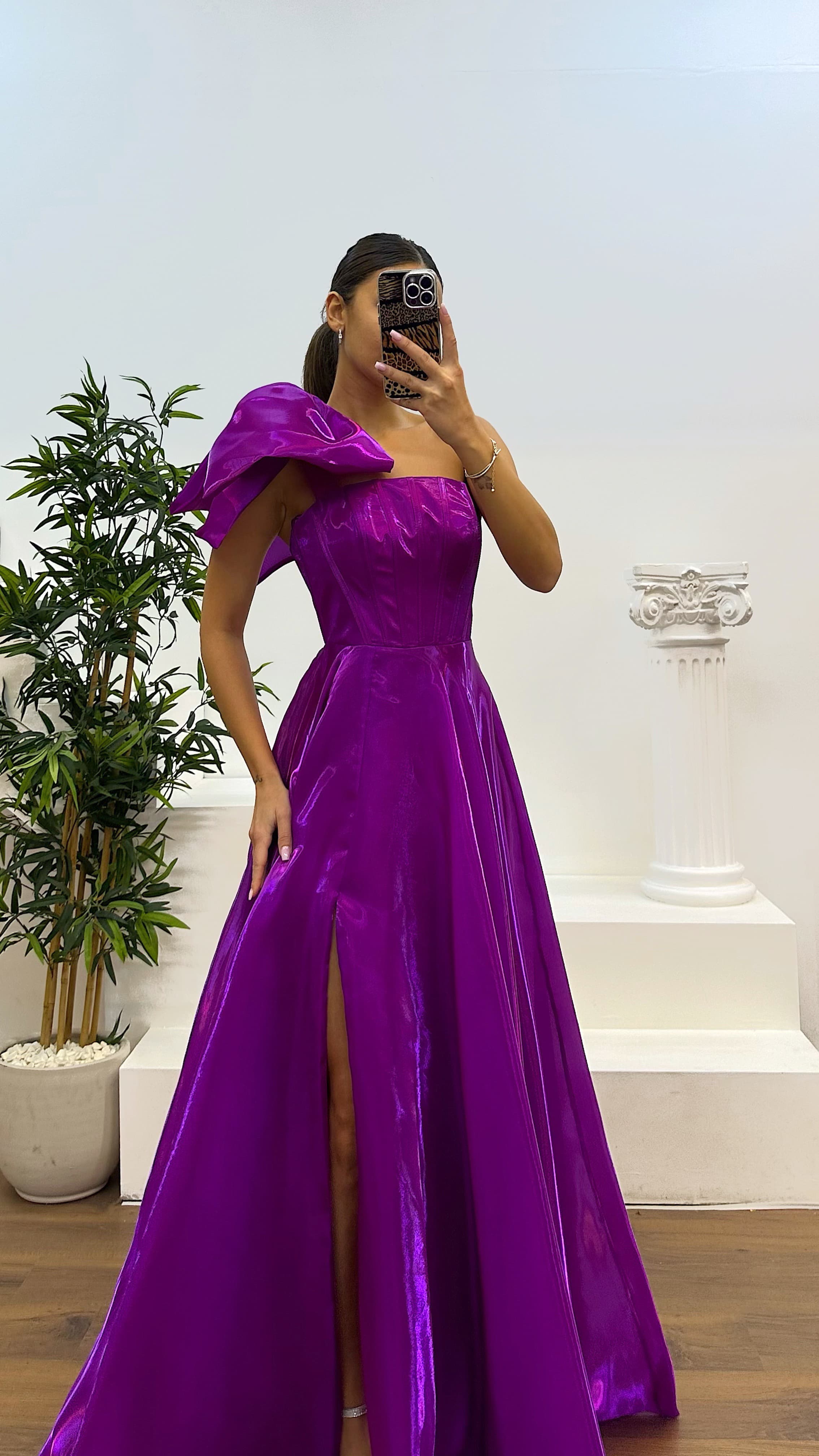 Robe de soirée avec détails sur les épaules Le produit est compatible avec les tailles 36 à 44, avec des coussinets de poitrine, doublé, avec une fermeture à croix et une fermeture éclair dans le dos, conçu comme une robe de soirée avec des détails sur les épaules et une fente. La longueur de la robe peut varier entre 165 et 170 cm. Type de tissu : Satin organza, 100 % polyester.