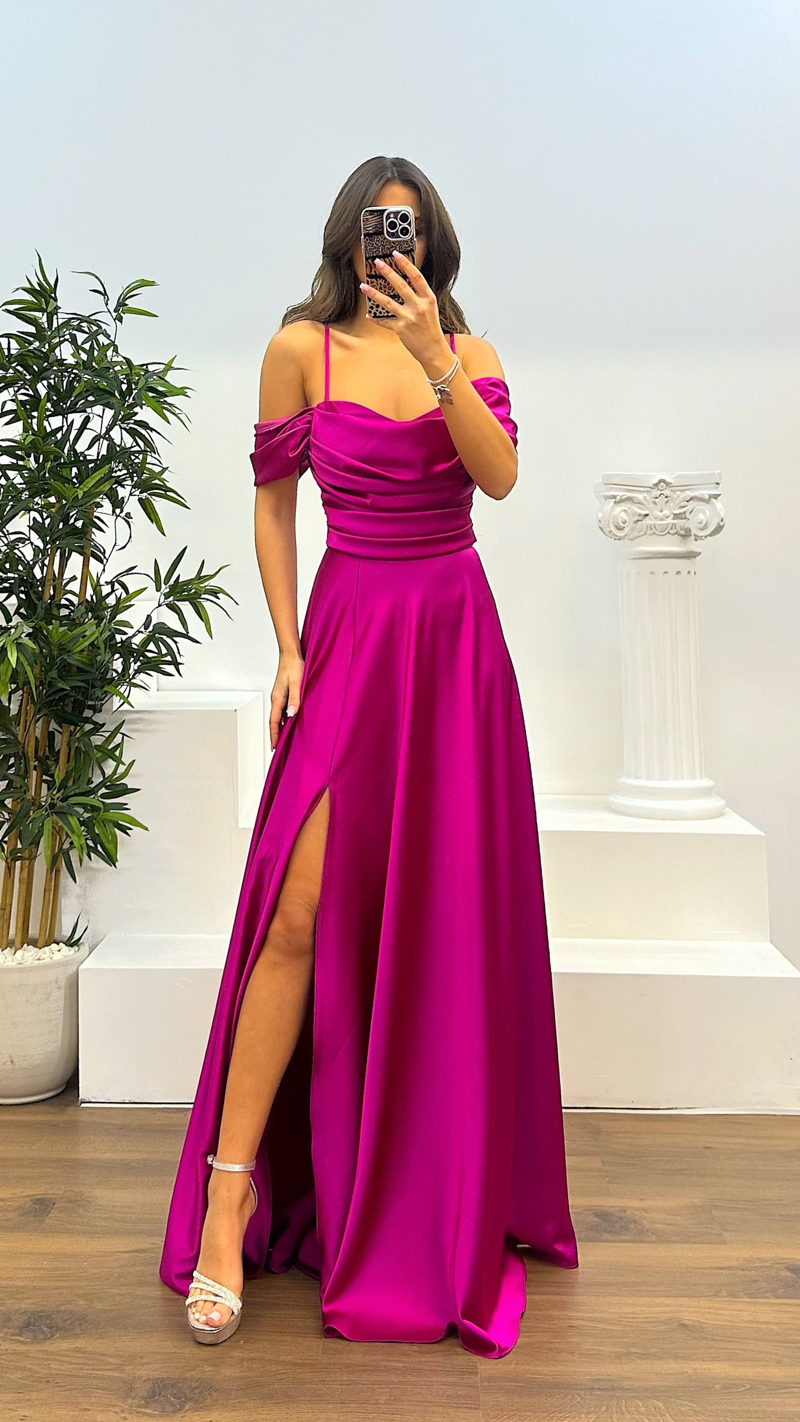 Robe de soirée avec détail drapé au dos Le produit est compatible avec les tailles 36-42, doté de coussinets de poitrine, doublé, avec une fente, des liens croisés au dos et une fermeture éclair. Il est conçu comme une robe de soirée drapée. Longueur du produit : peut varier entre 165 et 170 cm. Type de tissu : satin polyester-viscose.