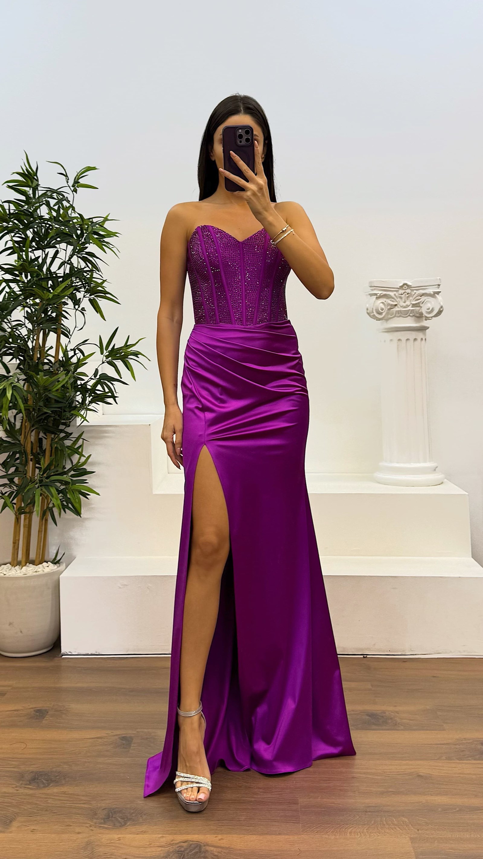 Robe de soirée sans bretelles avec détails de broderie Le produit est compatible avec les tailles 36 à 42, avec des coussinets pour la poitrine, doublé, avec une fente, des bretelles croisées au dos et une fermeture éclair, conçu comme une robe de soirée avec des détails de broderie. La longueur du produit est de 160 cm. Type de tissu : satin polyester-viscose.