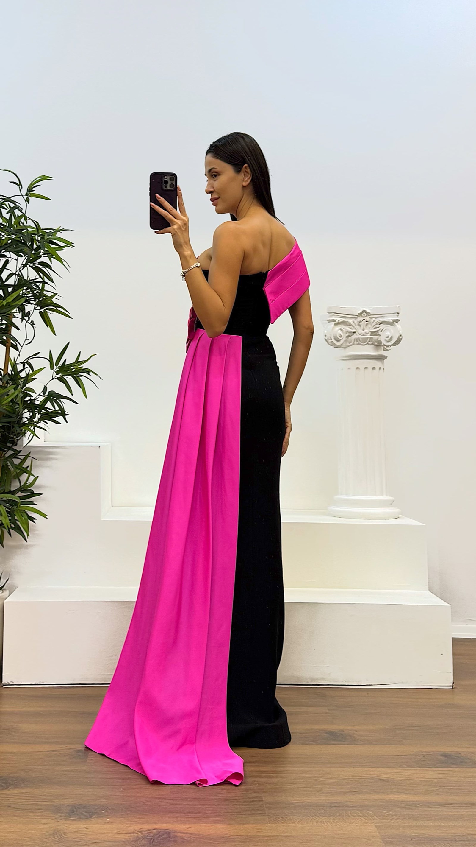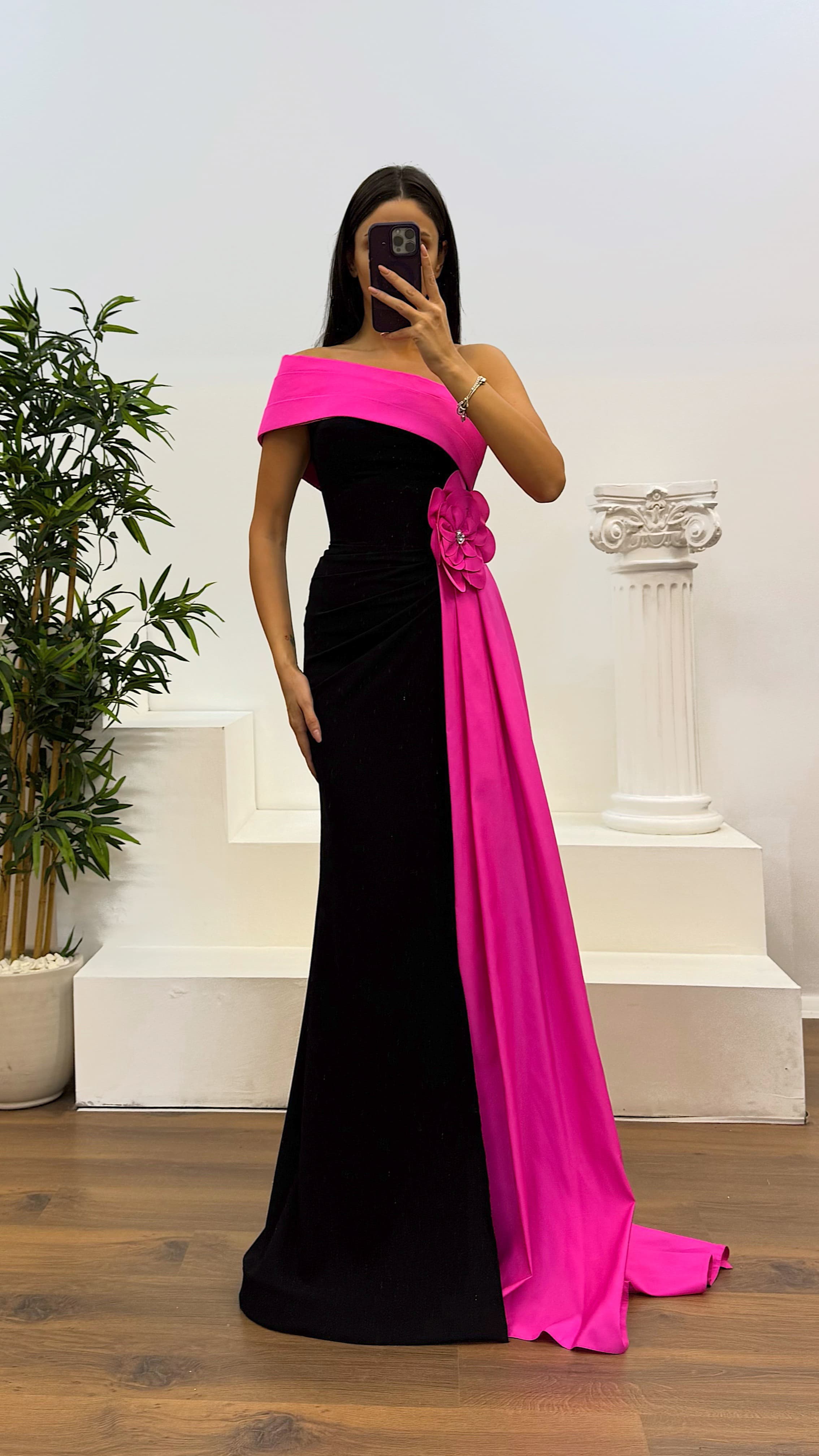 Robe de soirée avec détails floraux Le produit est compatible avec les tailles 36-42, avec des coussinets de poitrine, doublée, fermeture éclair à l'arrière, fente, et conçue comme une robe de soirée avec des détails floraux. Longueur du produit : peut varier entre 165-170 cm. Type de tissu : satin, 100% polyester.