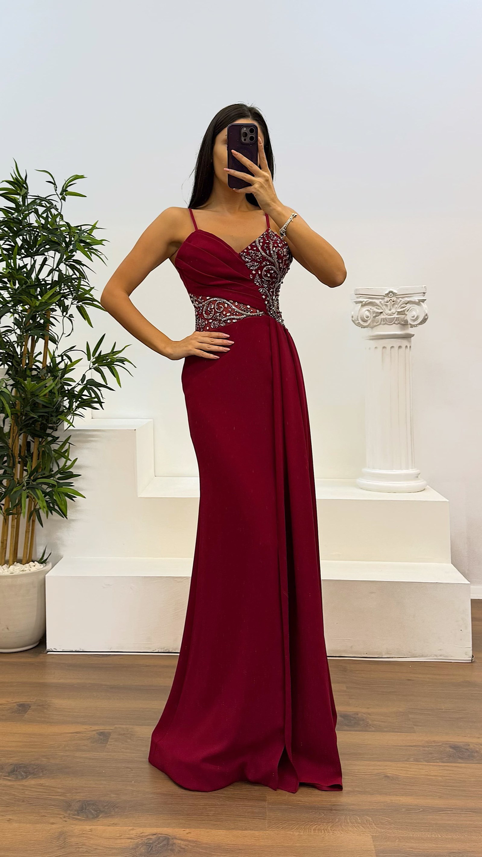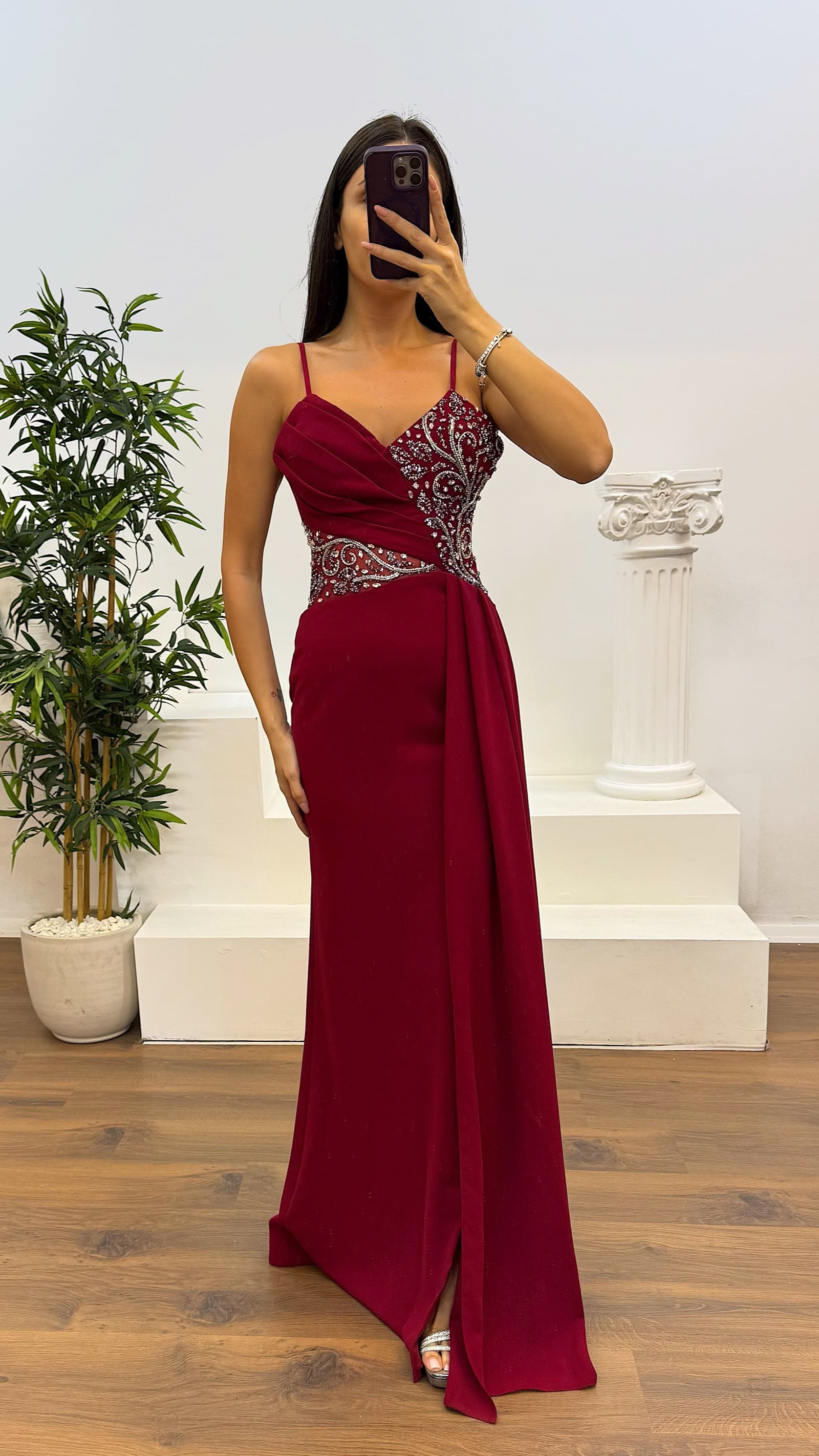 Bordo İp Askılı İşleme Detay Abiye Elbise