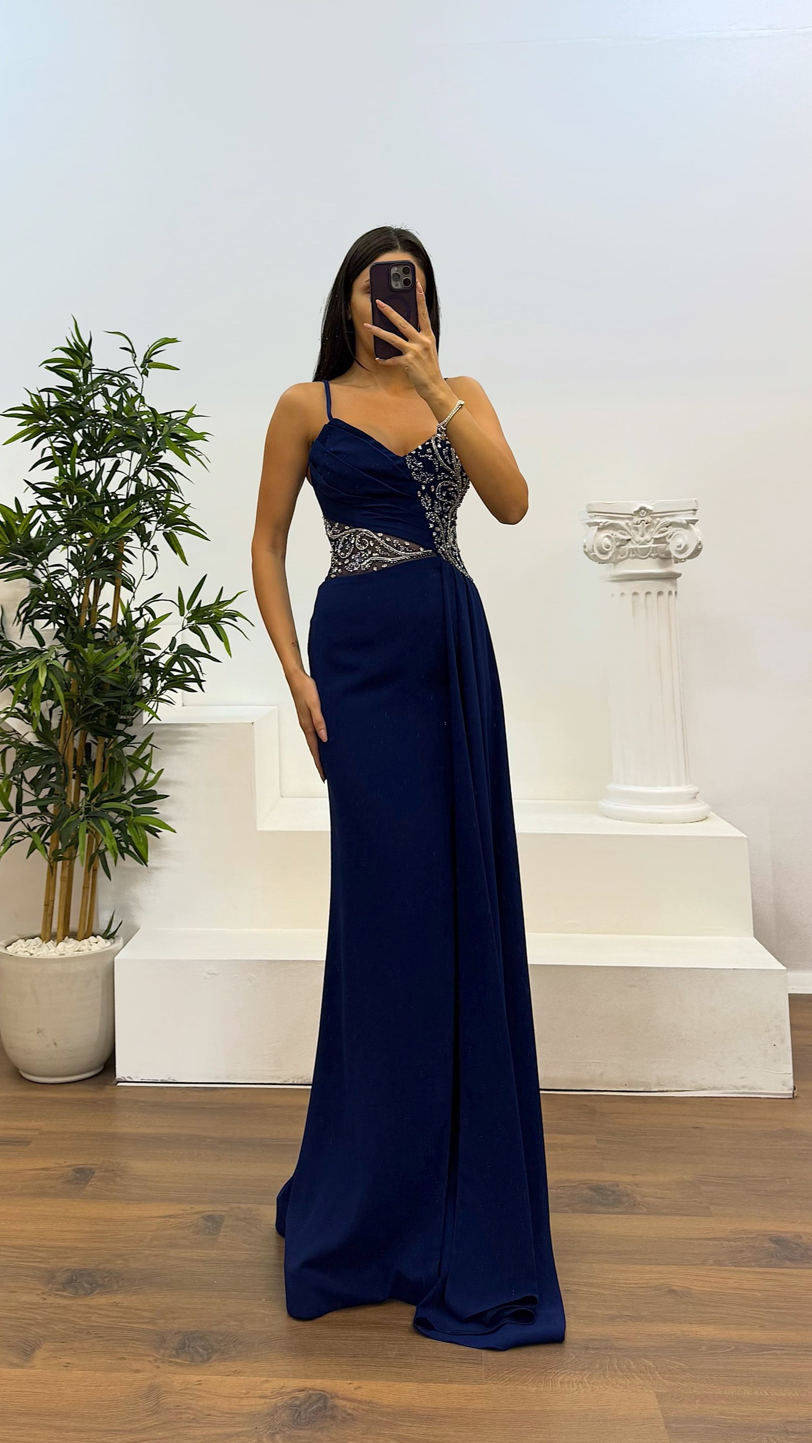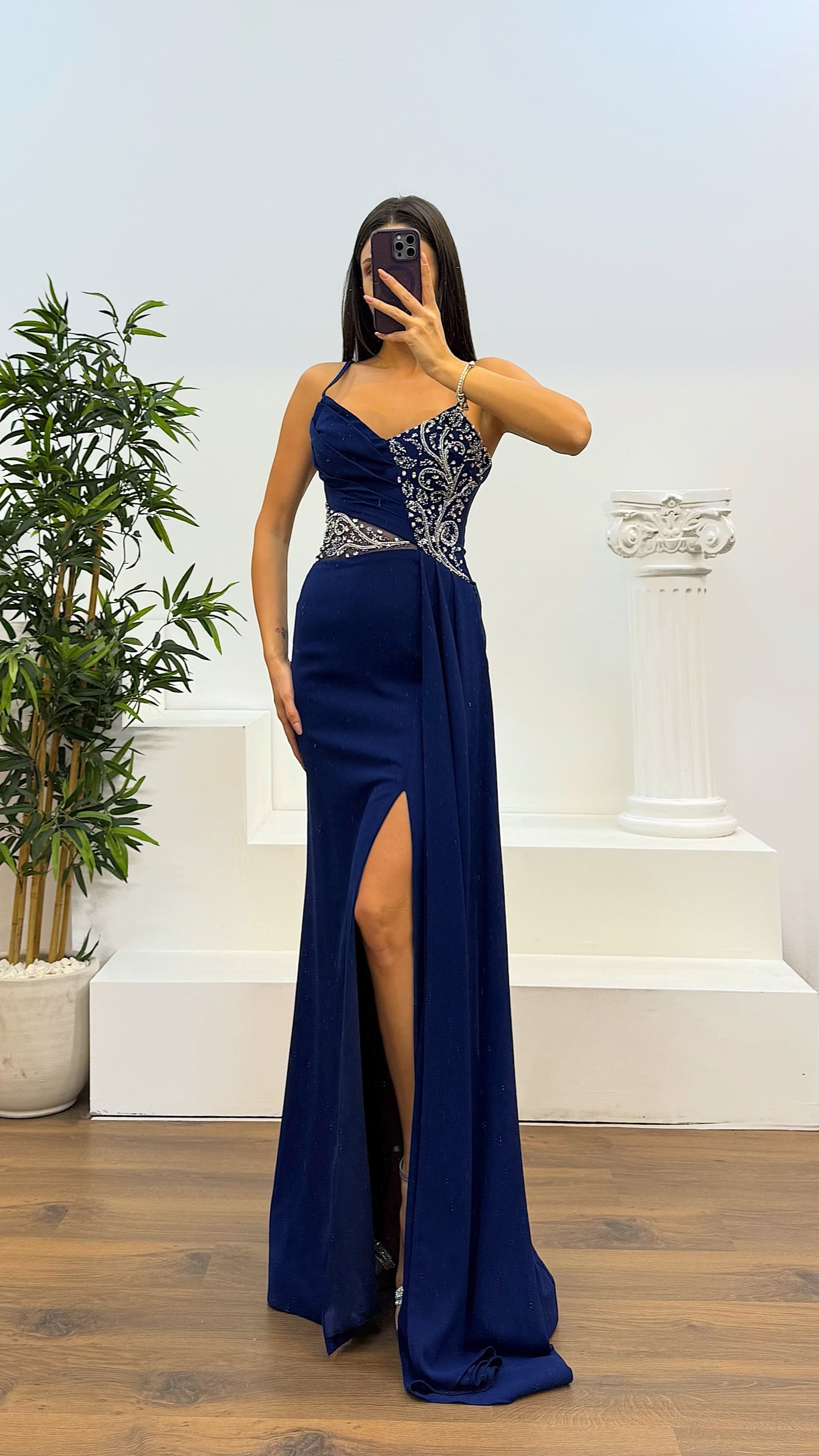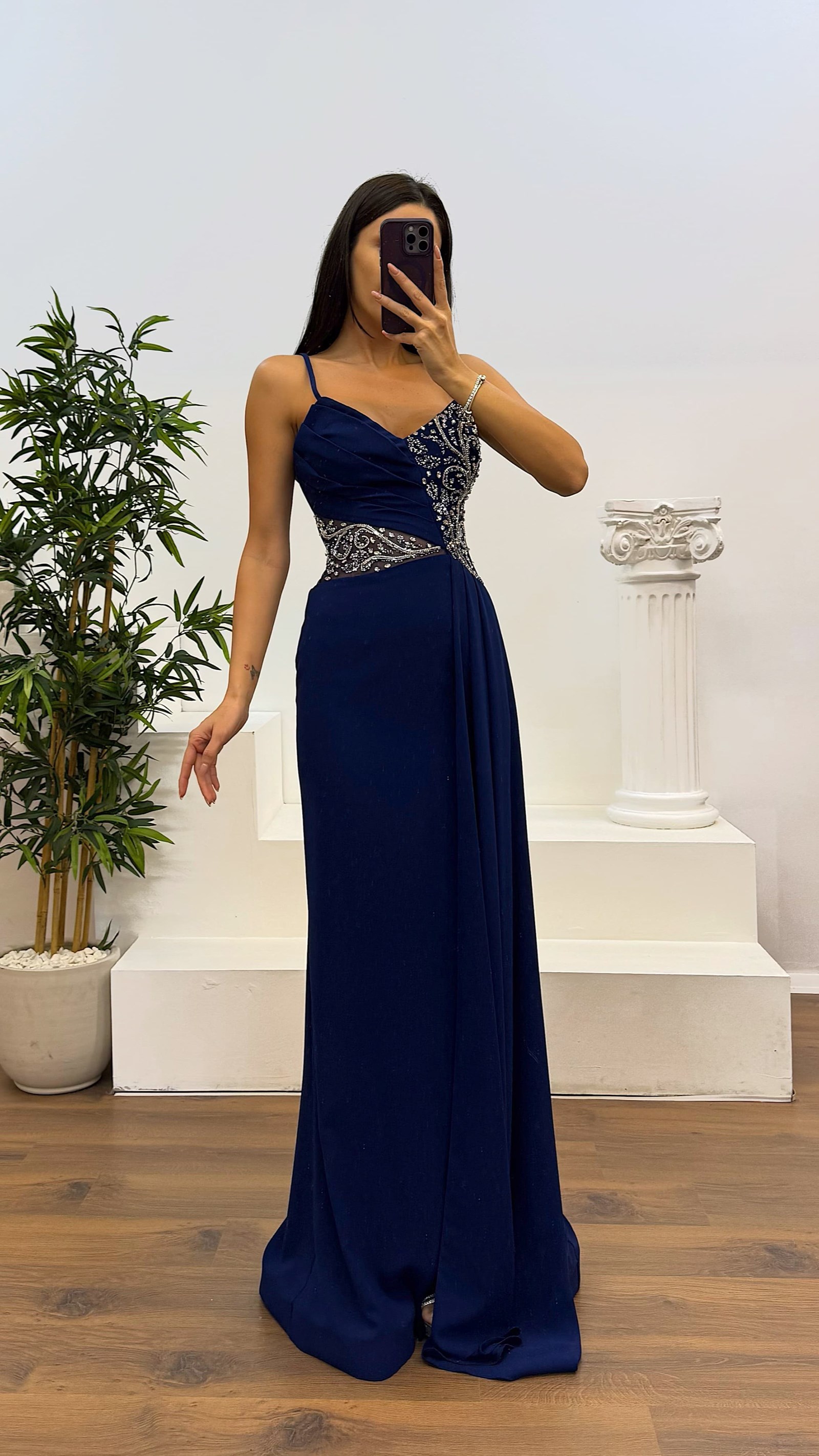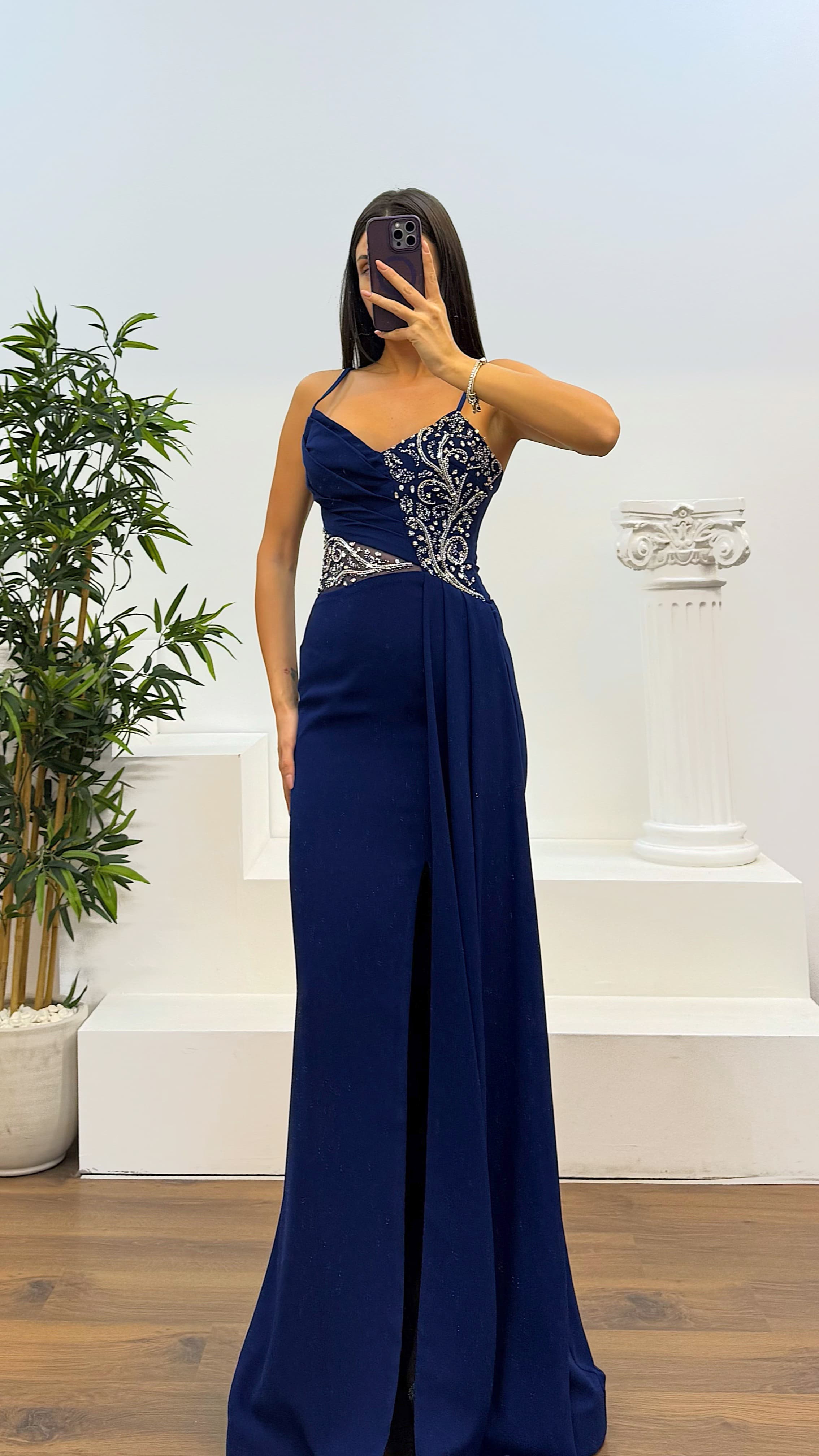 Lacivert İp Askılı İşleme Detay Abiye Elbise