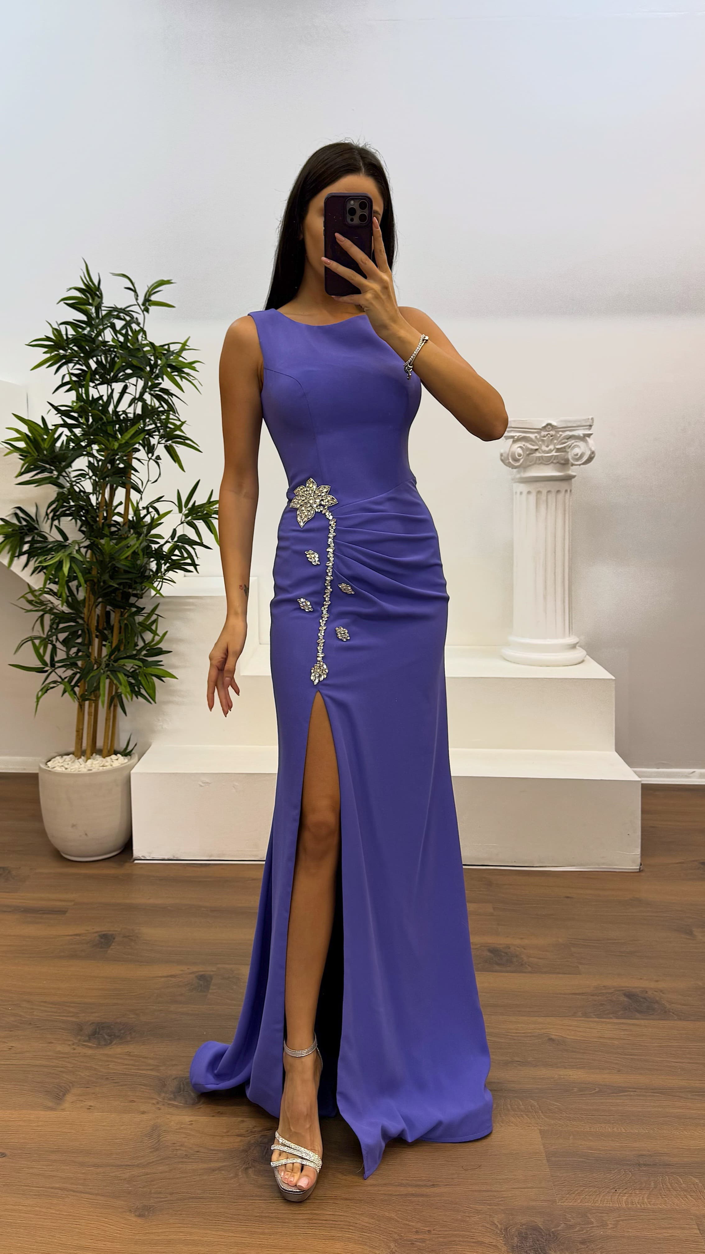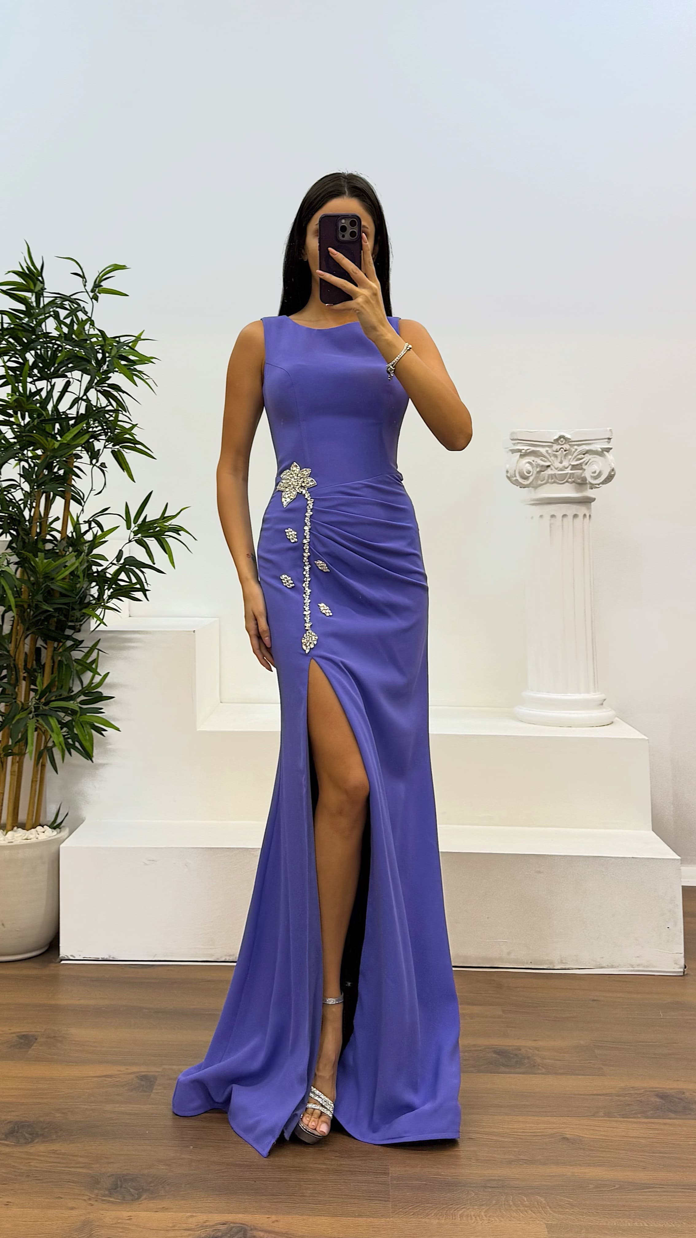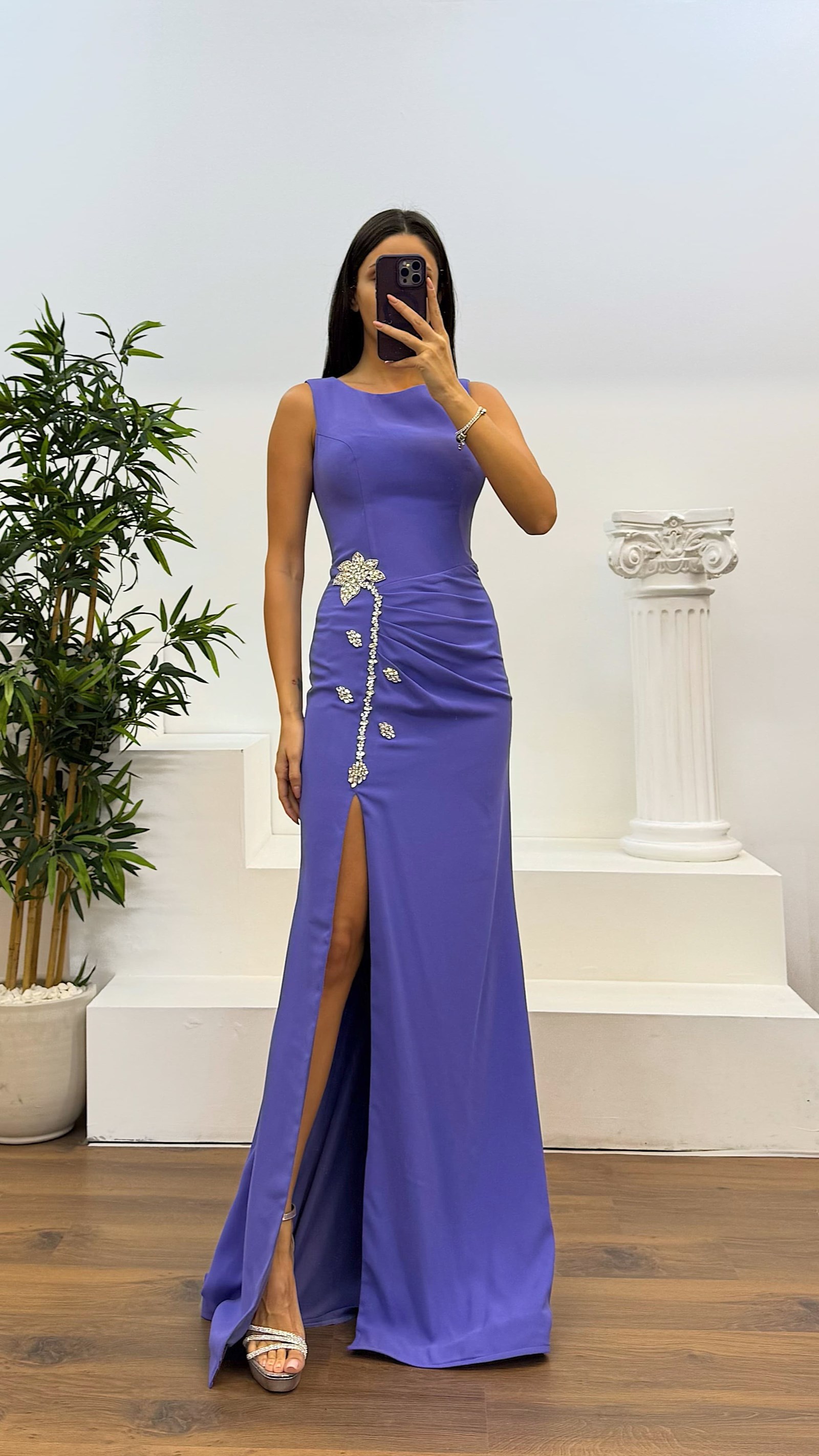 • Mor Yuvarlak Yaka Bel Detay Abiye Elbise