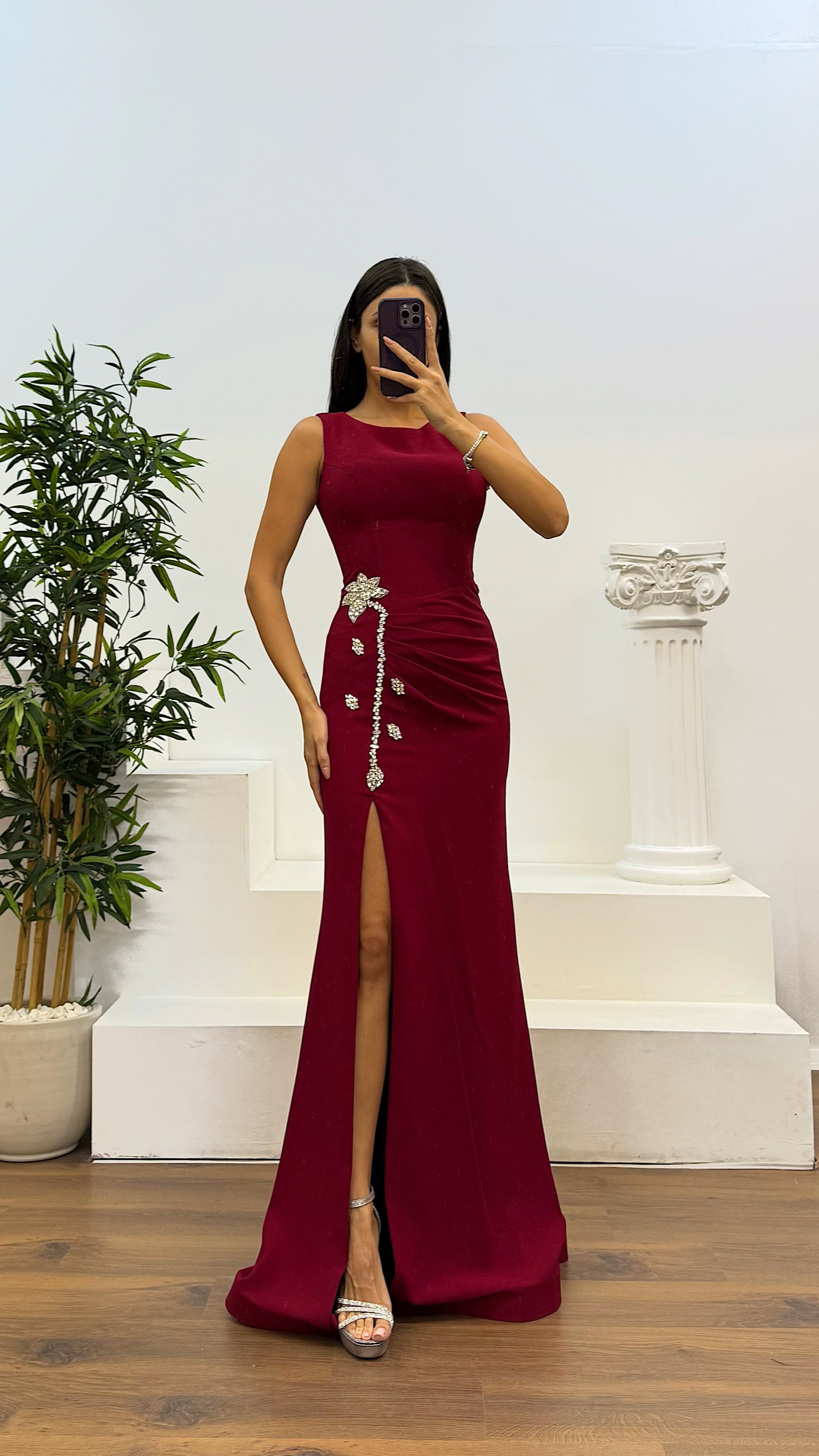 Robe de soirée à col rond et détail à la taille Le produit est compatible avec les tailles de 36 à 42, avec des coussinets de poitrine, doublé, fermeture à glissière au dos, et conçu avec un détail à la taille et une fente. La longueur du produit peut varier entre 165 et 170 cm. Type de tissu : 100% polyester