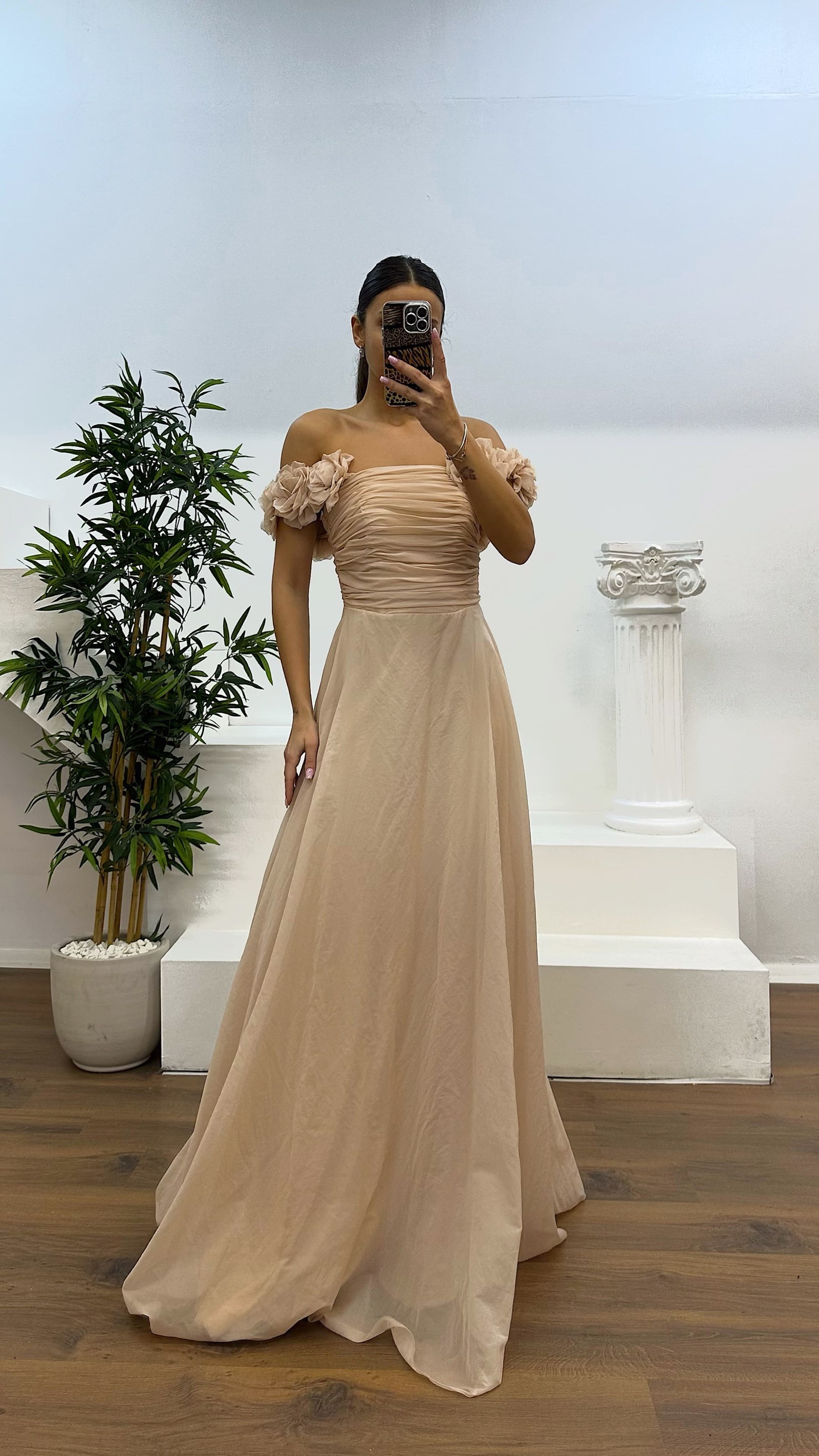 Robe de soirée à détails floraux avec bretelles Ce produit est compatible avec les tailles de 36 à 44. Il est conçu comme une robe de soirée avec des détails floraux, dotée de coussinets au niveau de la poitrine, doublée, avec un dos croisé à cordon et une fermeture à glissière. La longueur du produit est de 160 cm. Type de tissu : chiffon 66% viscose, 34% polyester.