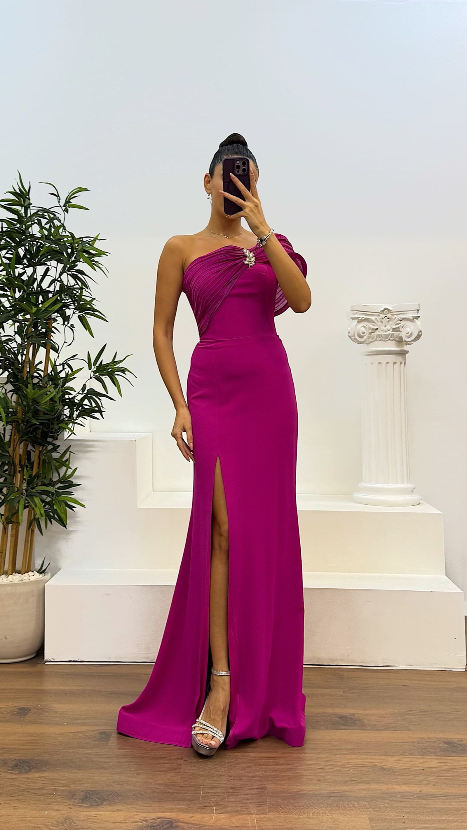 • Fuşya Tek Omuz Drape Detay Abiye Elbise
