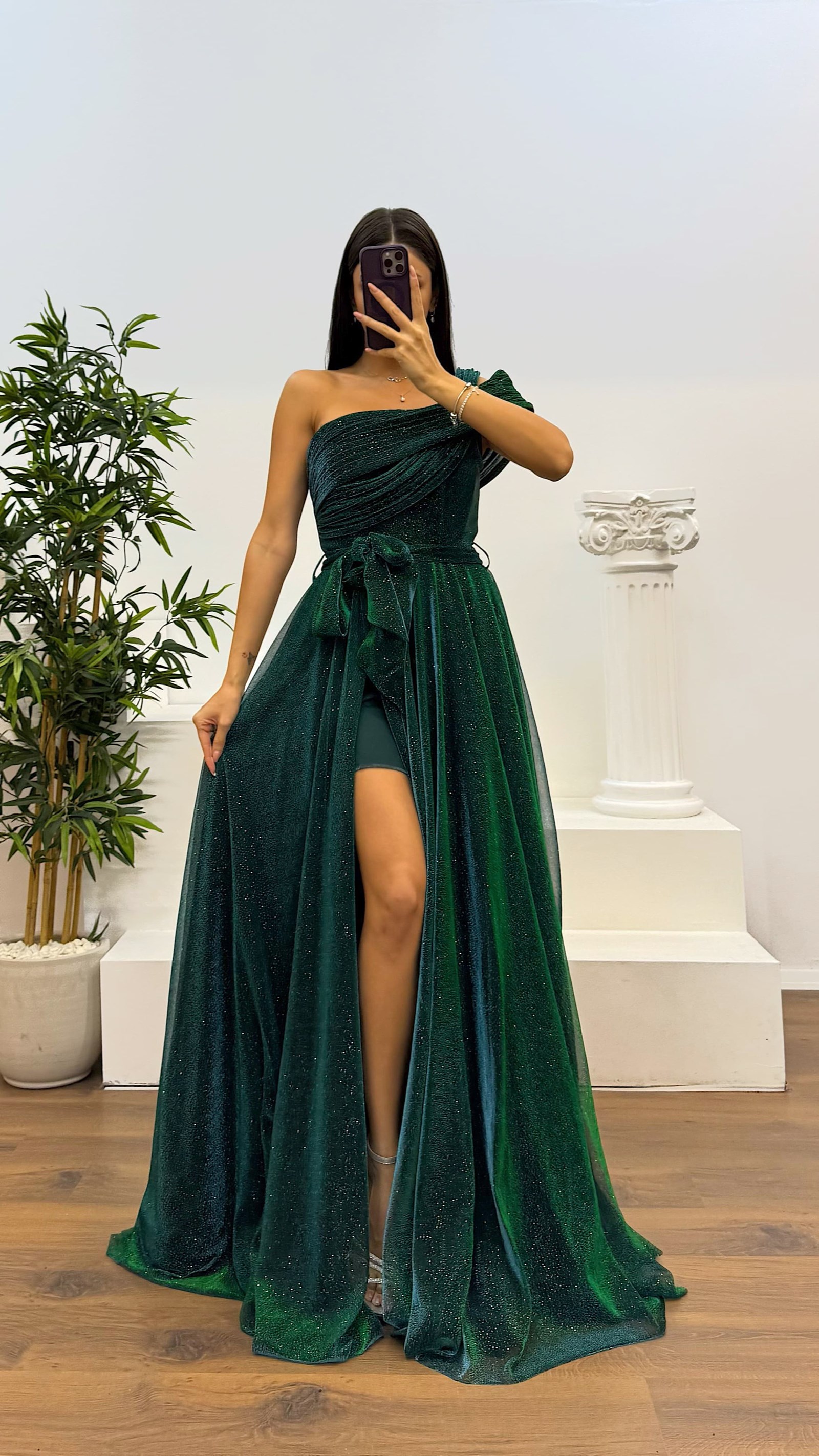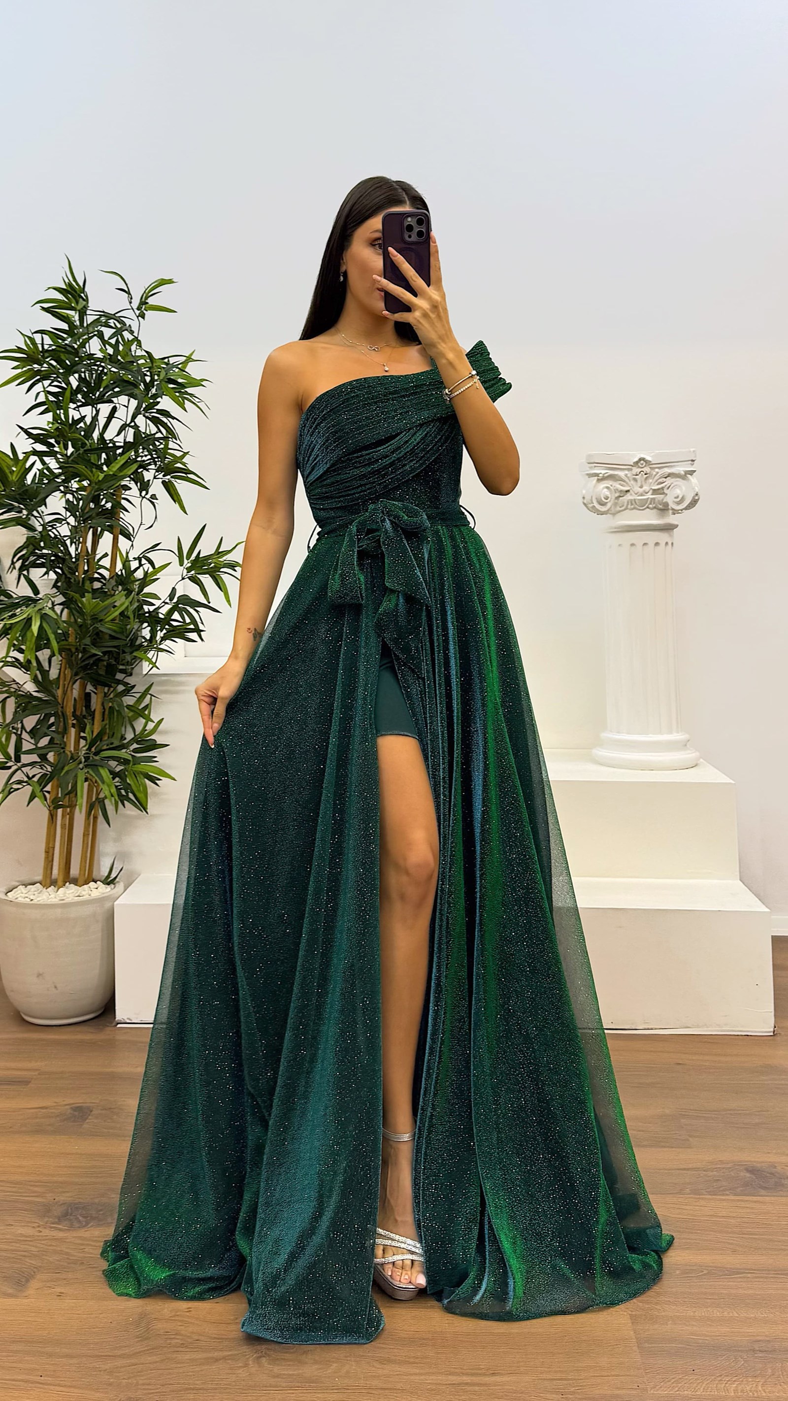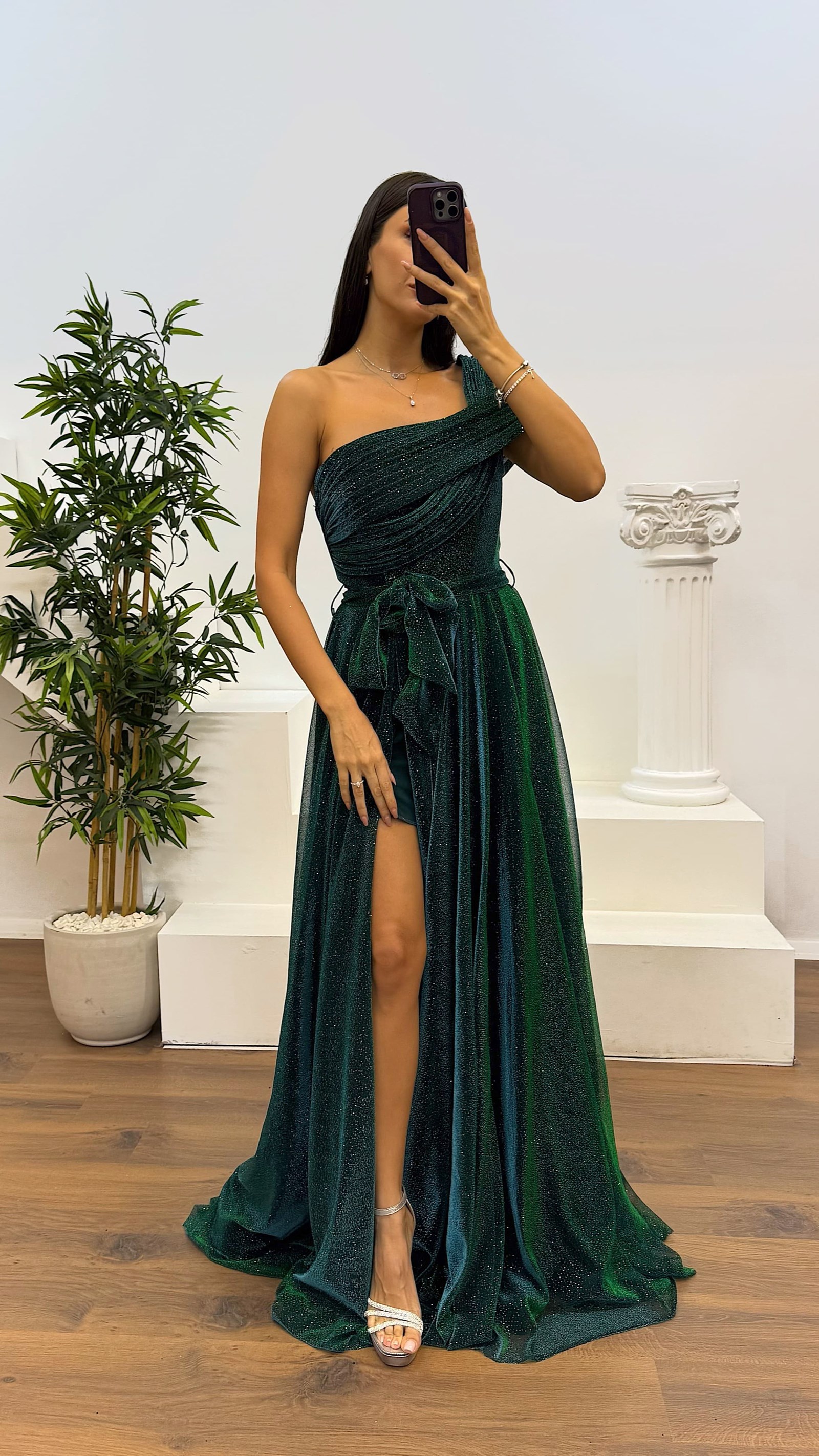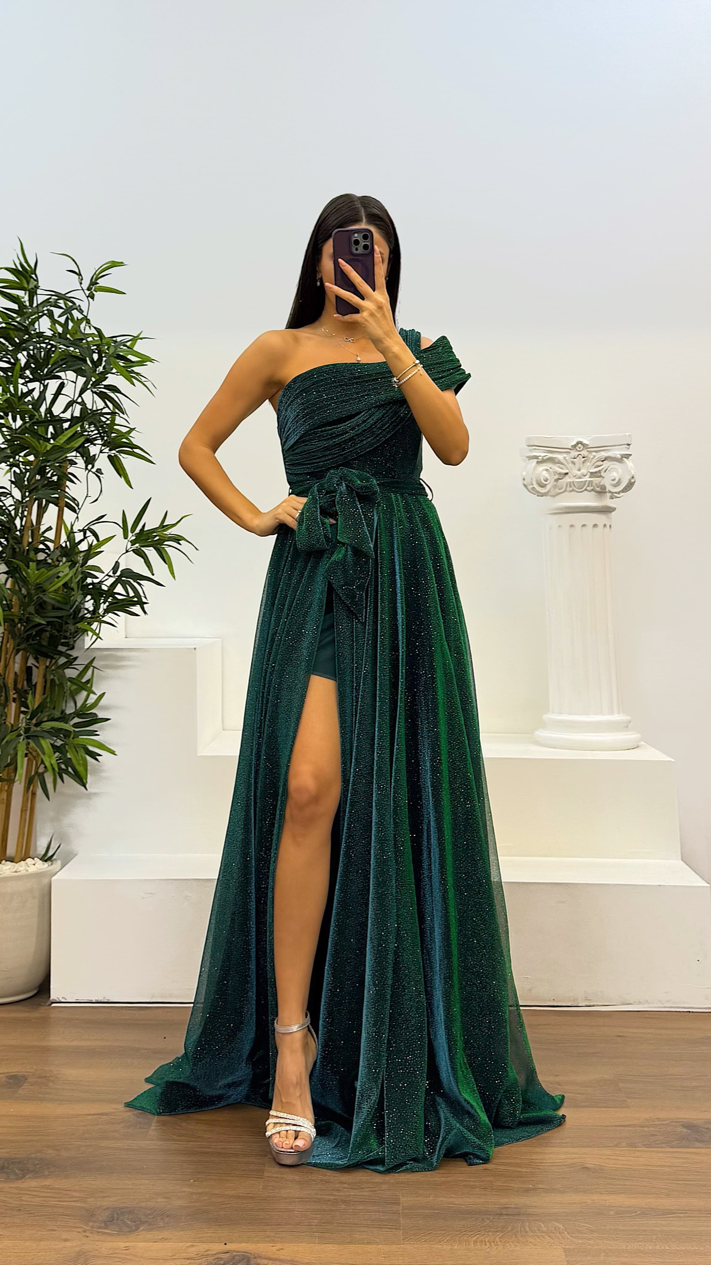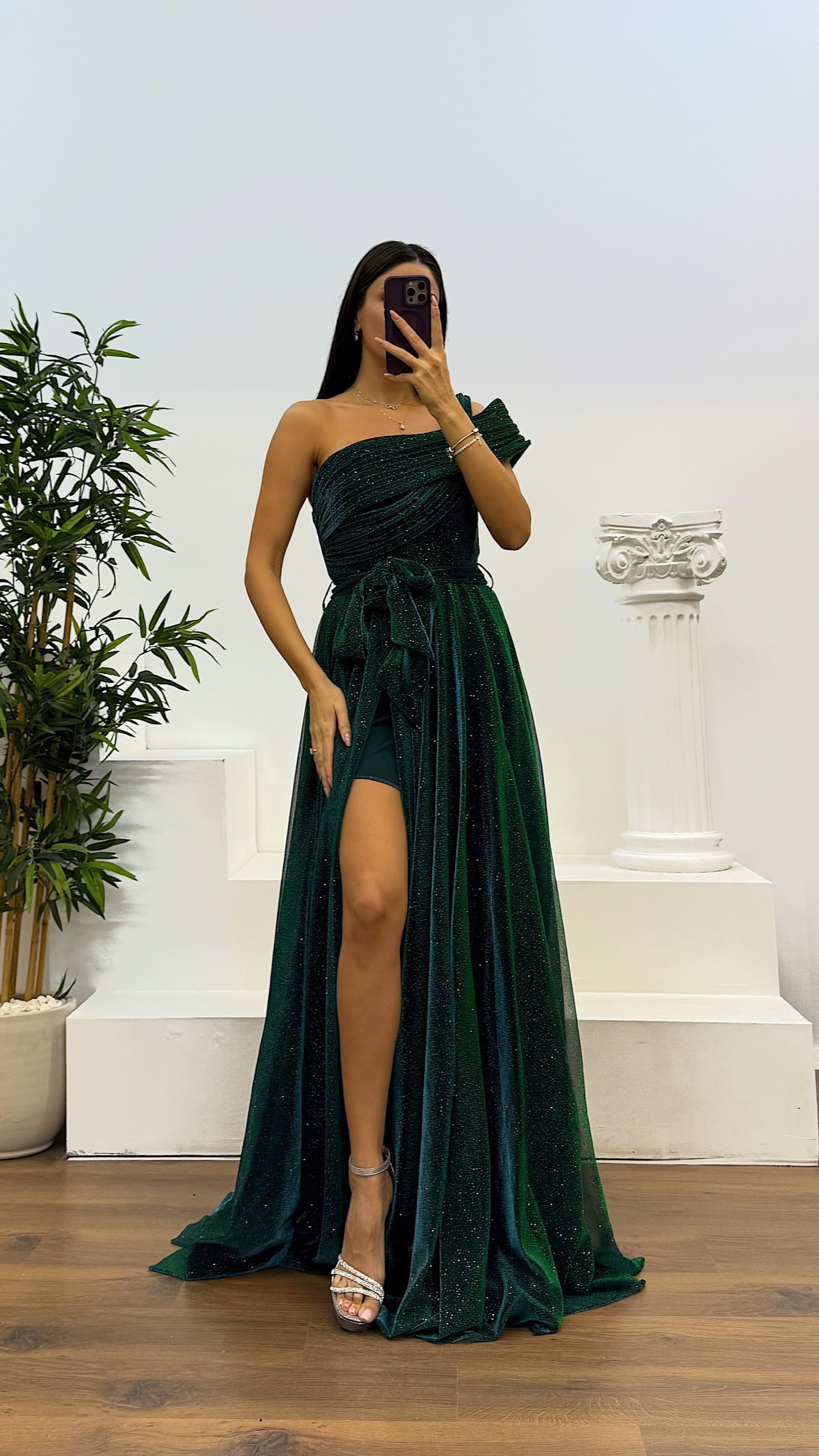 • Zümrüt Tek Omuz Simli Kabarık Abiye Elbise
