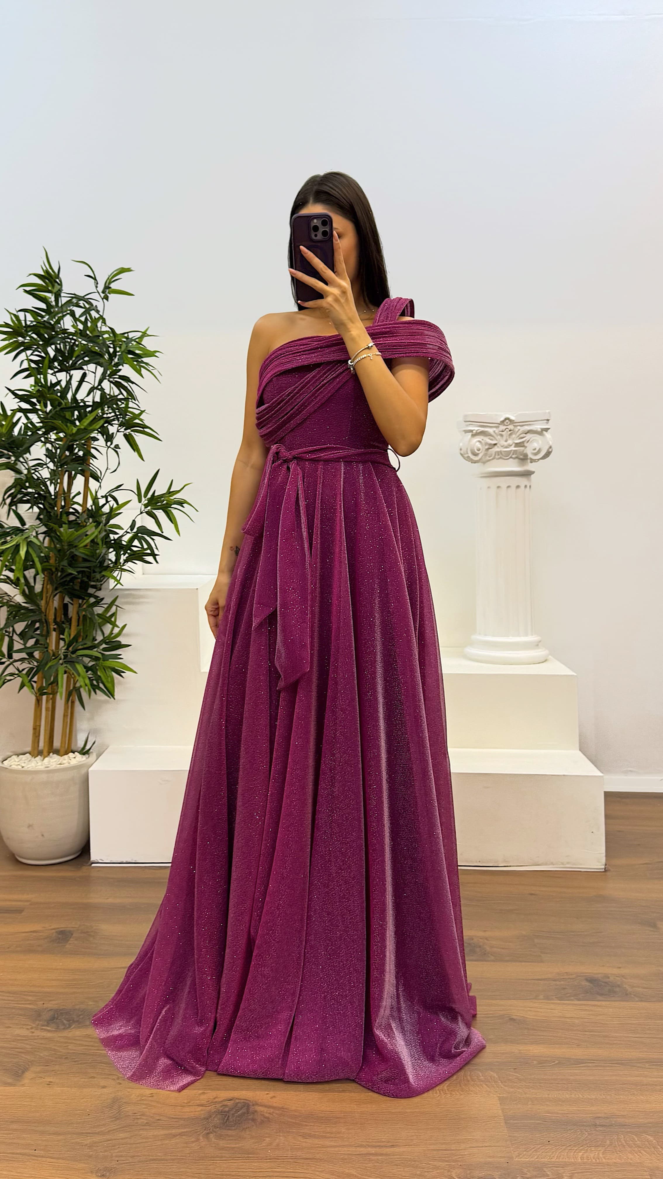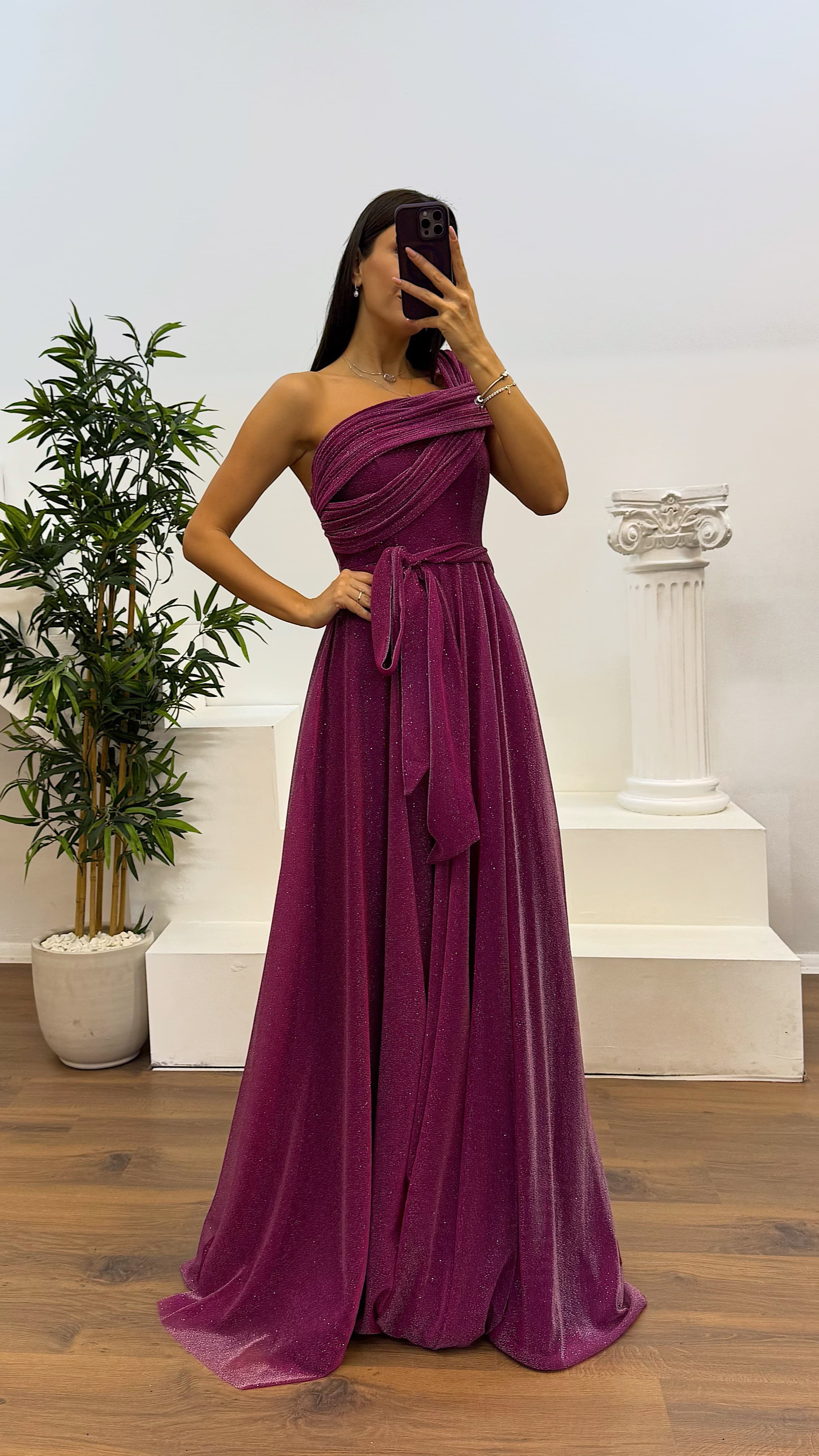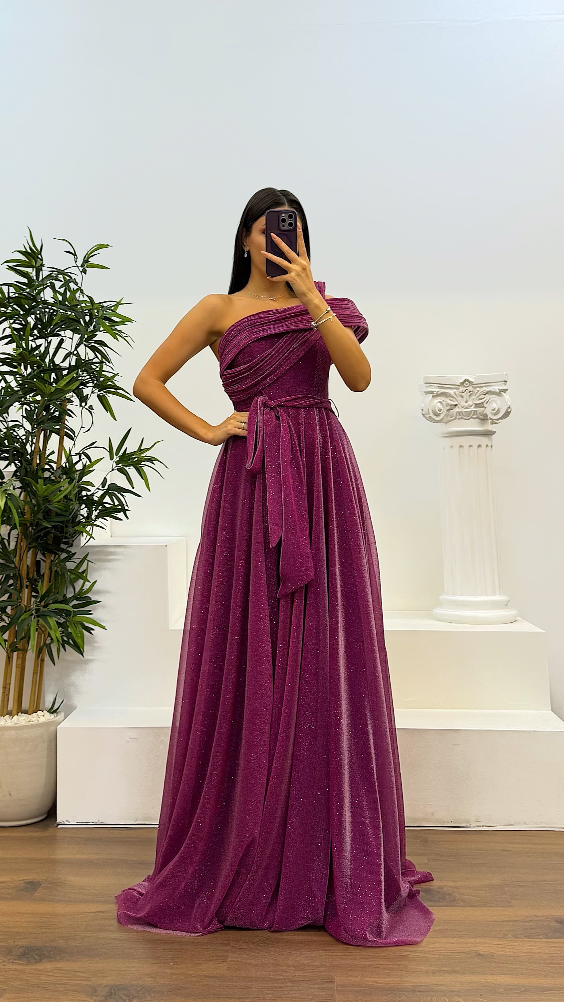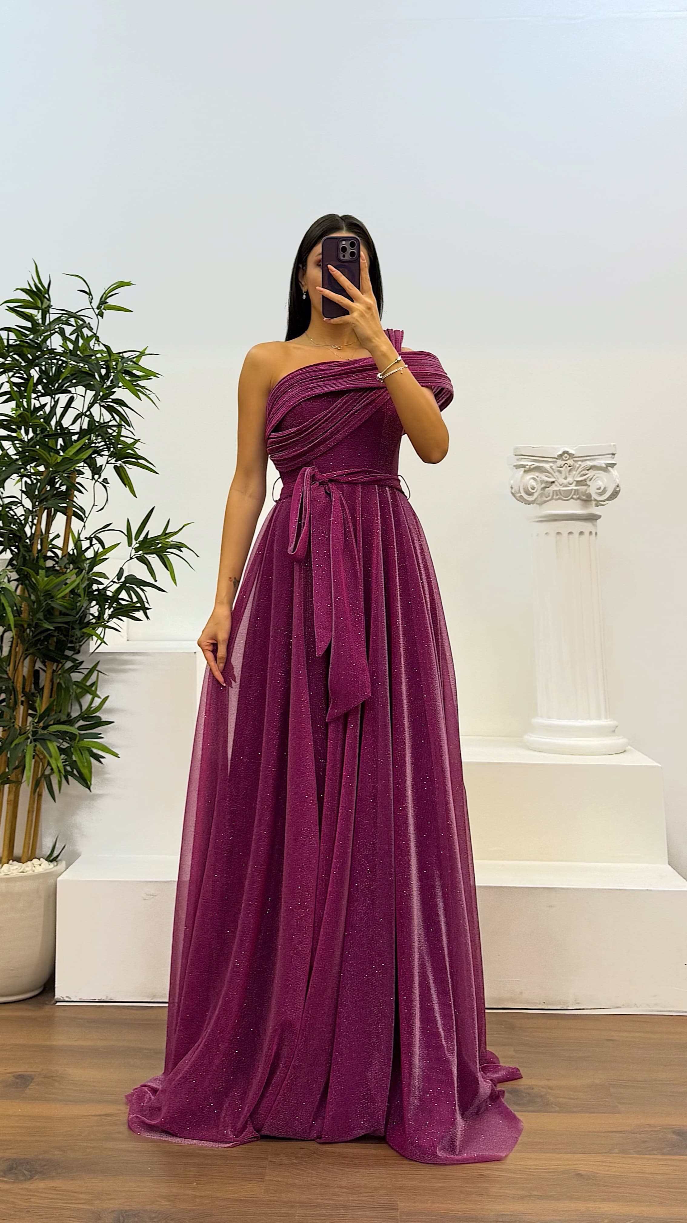 • Mor Tek Omuz Simli Kabarık Abiye Elbise