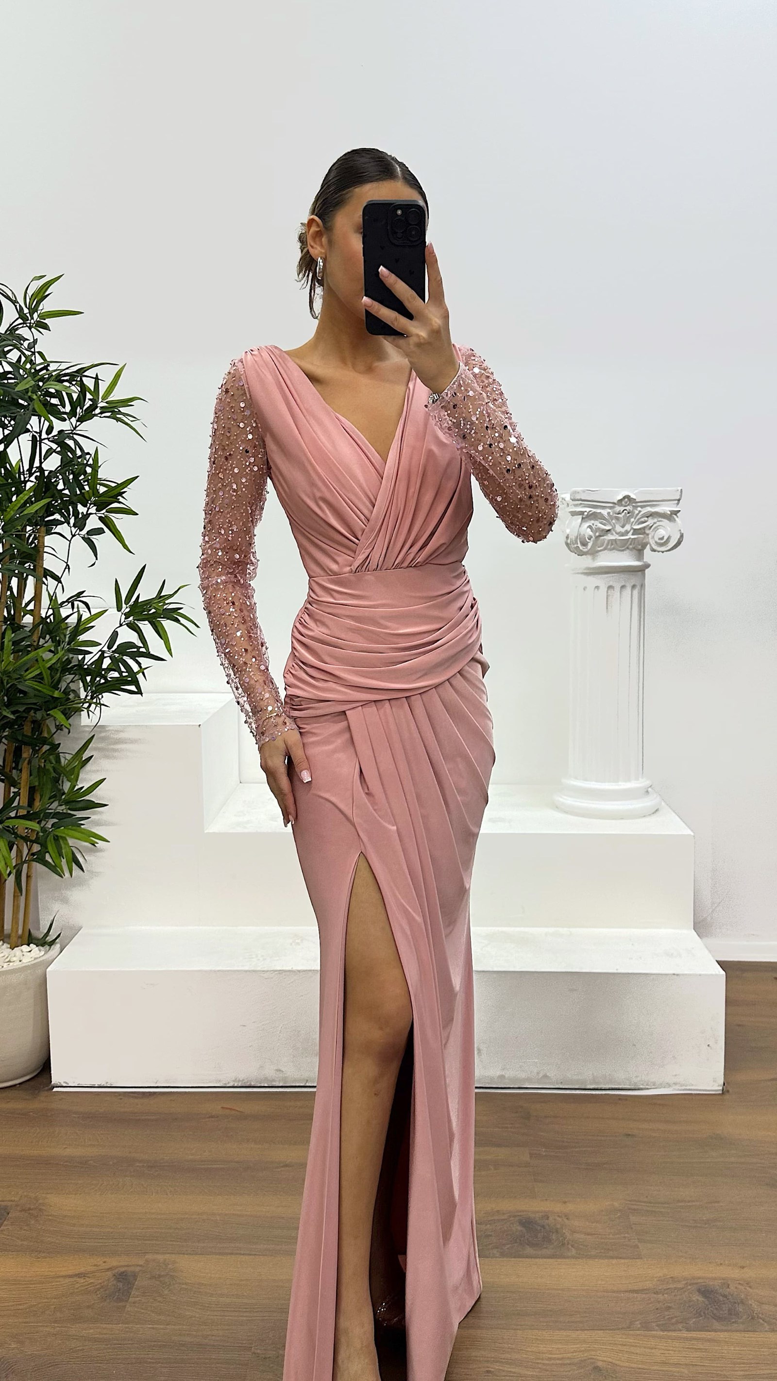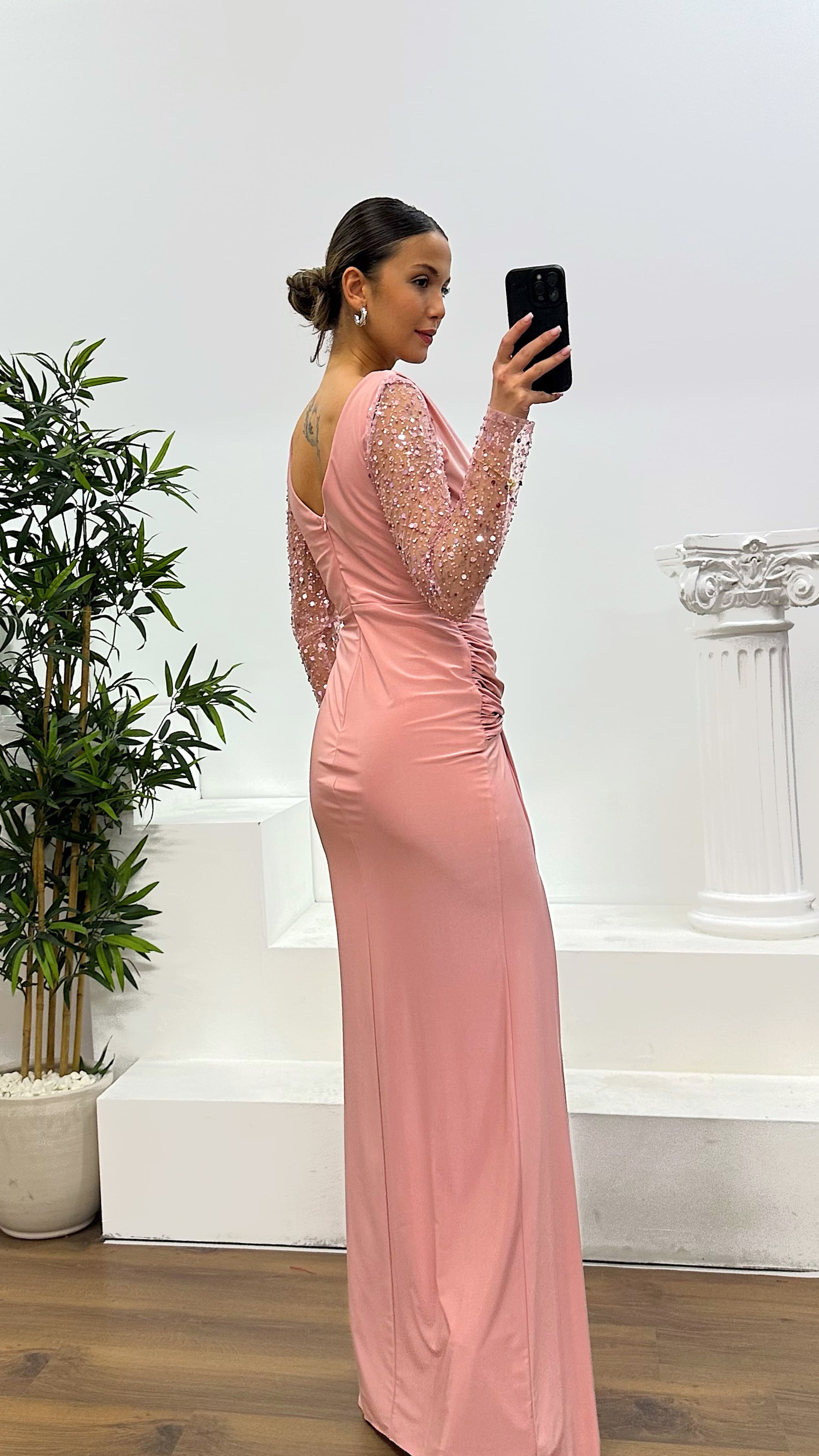 Robe de soirée col en V avec manches brodées Convient aux tailles 36 à 42, avec bonnets rembourrés, doublée, fermeture zippée à l'arrière, fente sur le côté, manches brodées. Longueur du produit : Peut varier entre 170 et 175 cm. Longueur des manches : 60 cm. Type de tissu : Jersey lycra, polyester.
