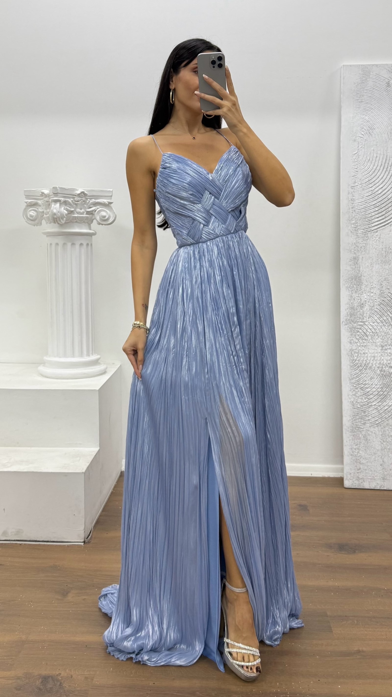 • Mavi İp Askılı Piliseli Abiye Elbise