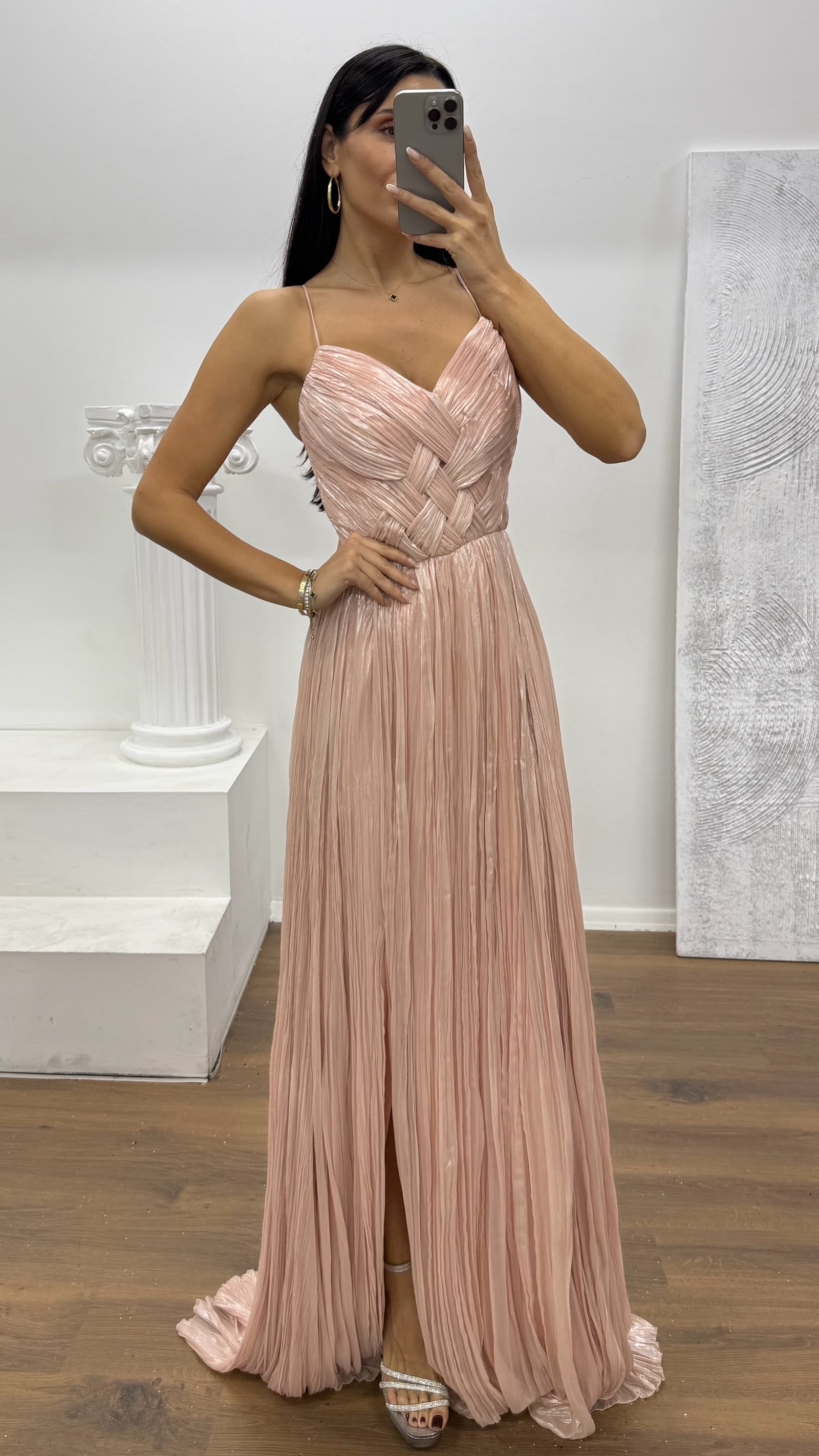 • Pudra İp Askılı Piliseli Abiye Elbise