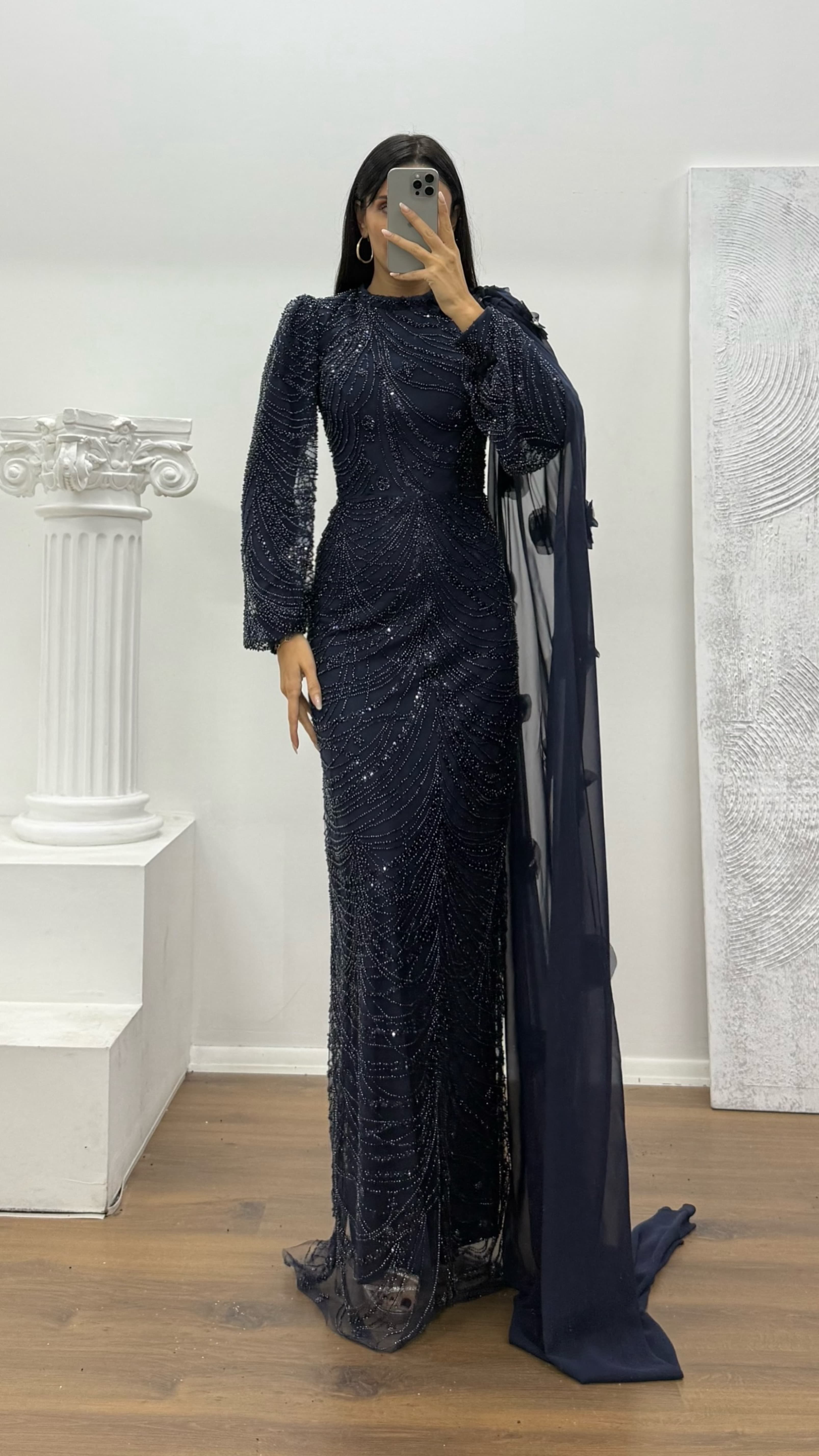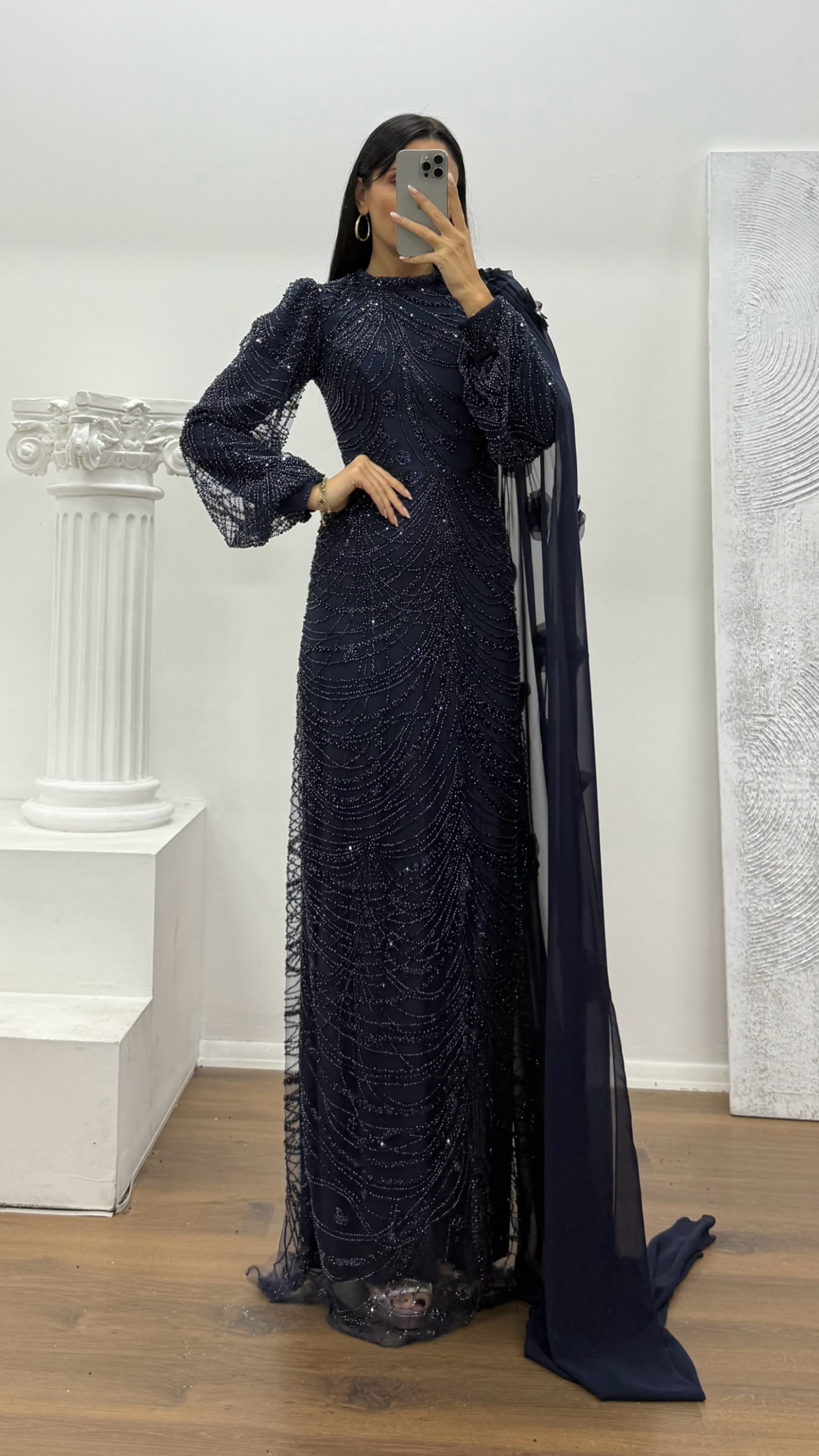 Lacivert Kol Şifon Detay İşlemeli Abiye Elbise