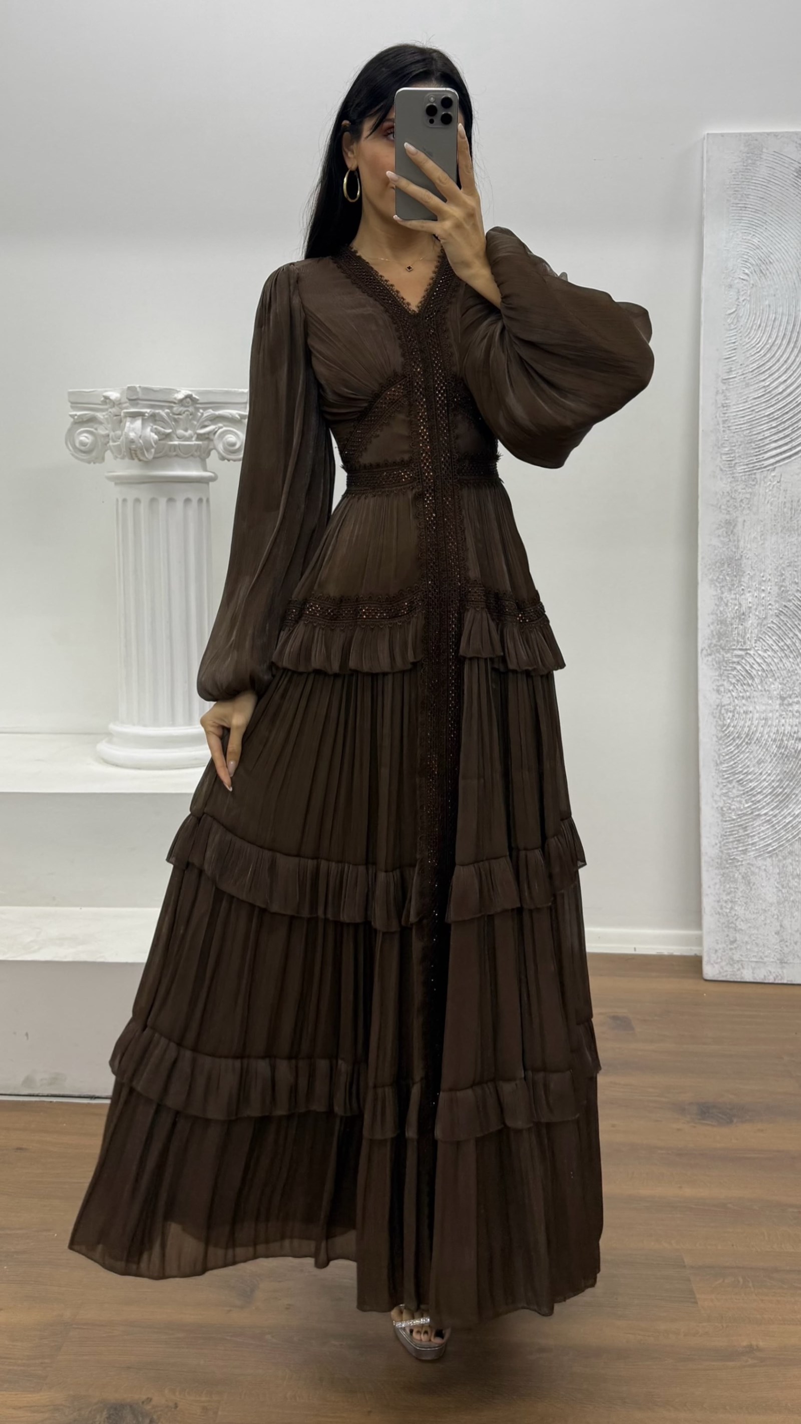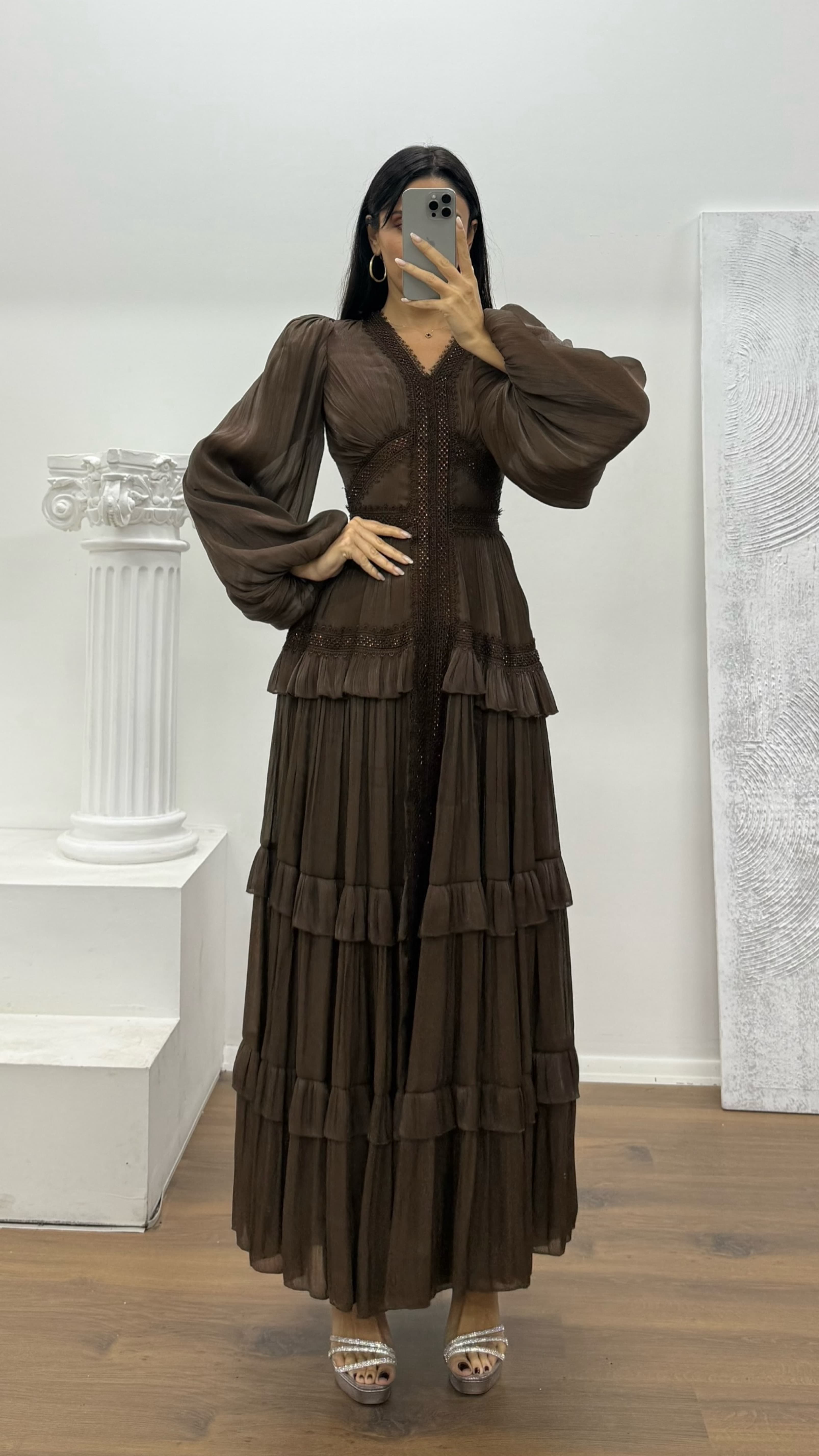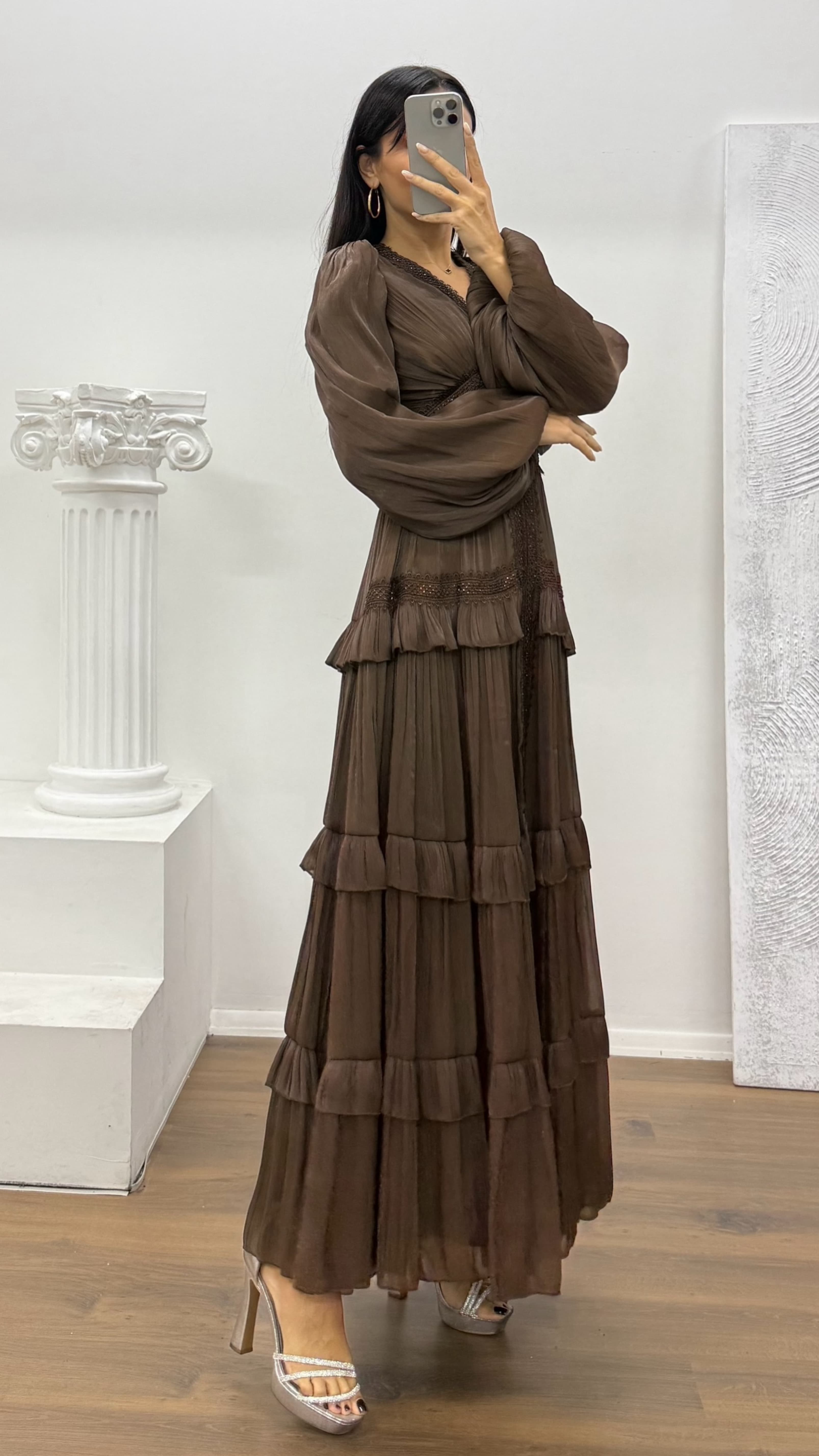 Kahverengi Kat Kat Şifon Abiye Elbise