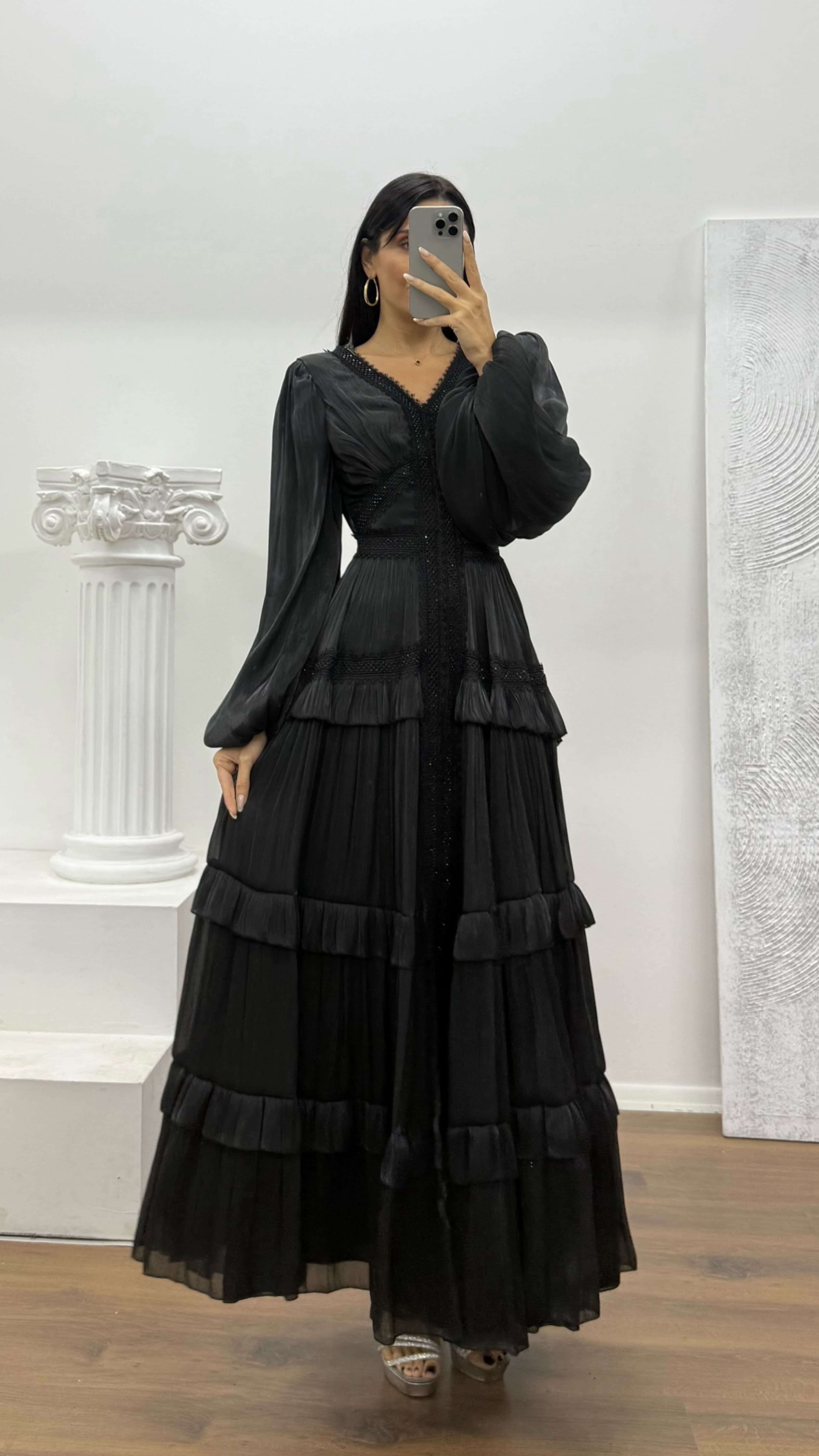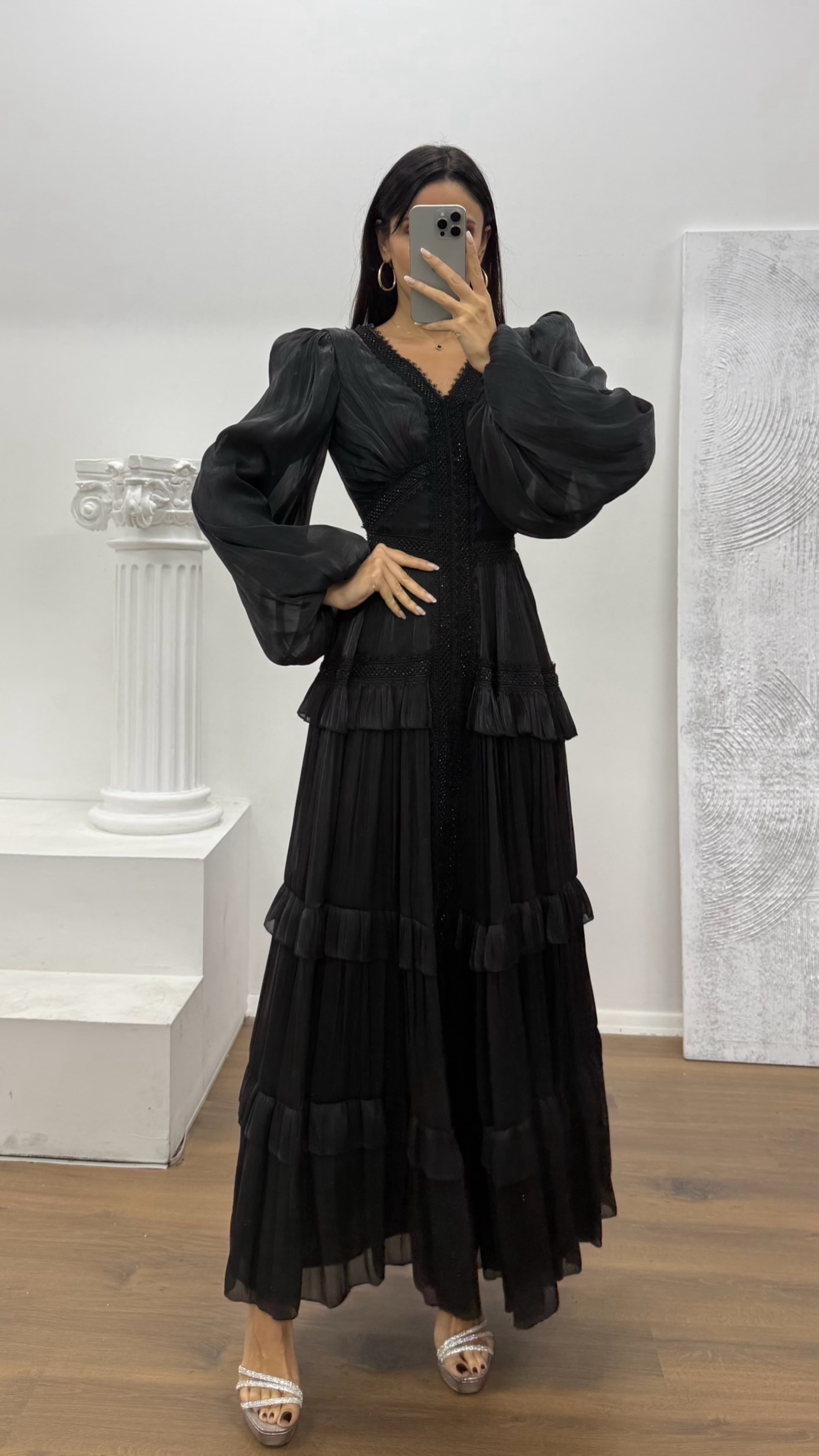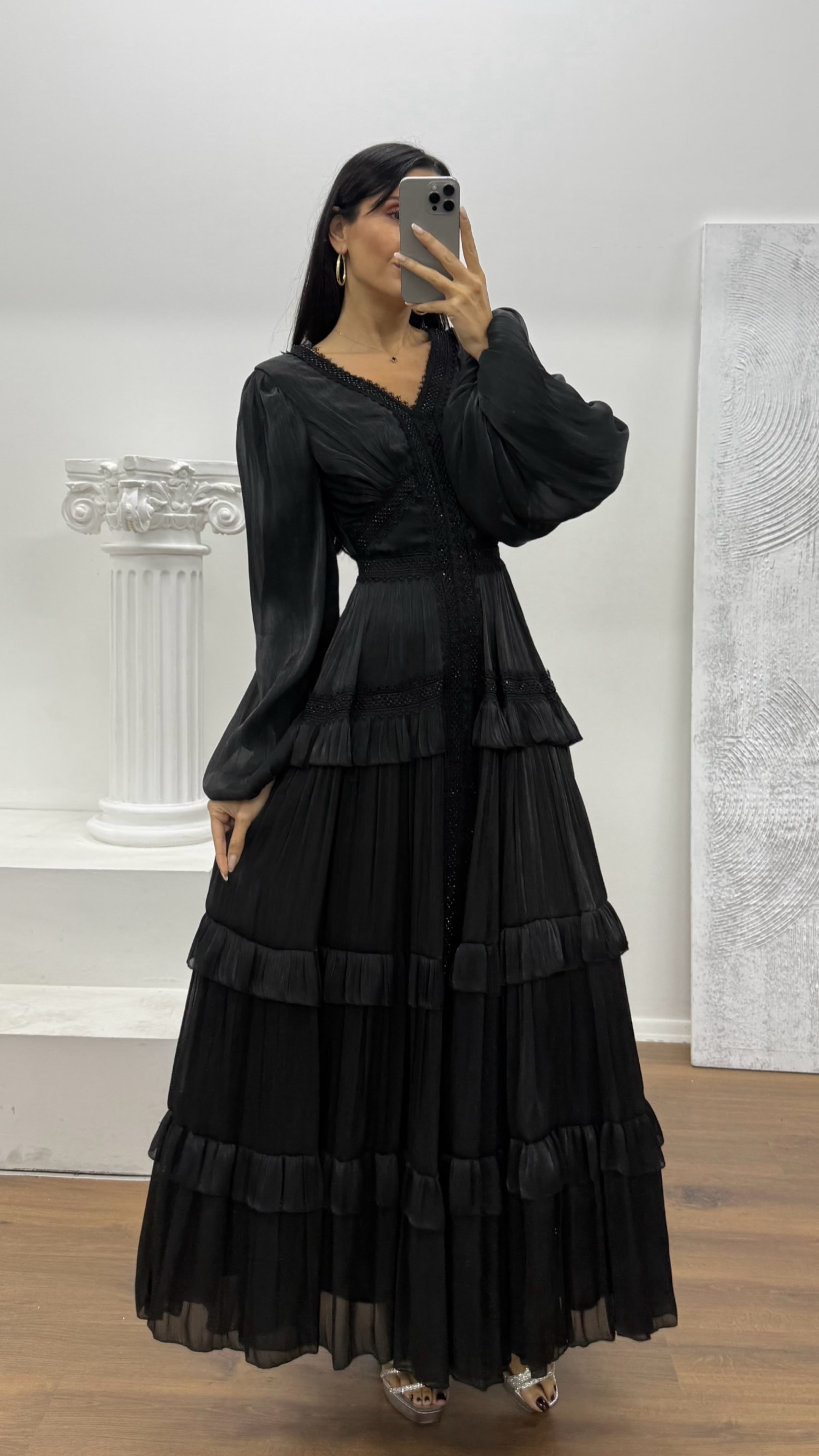 Siyah Kat Kat Şifon Abiye Elbise