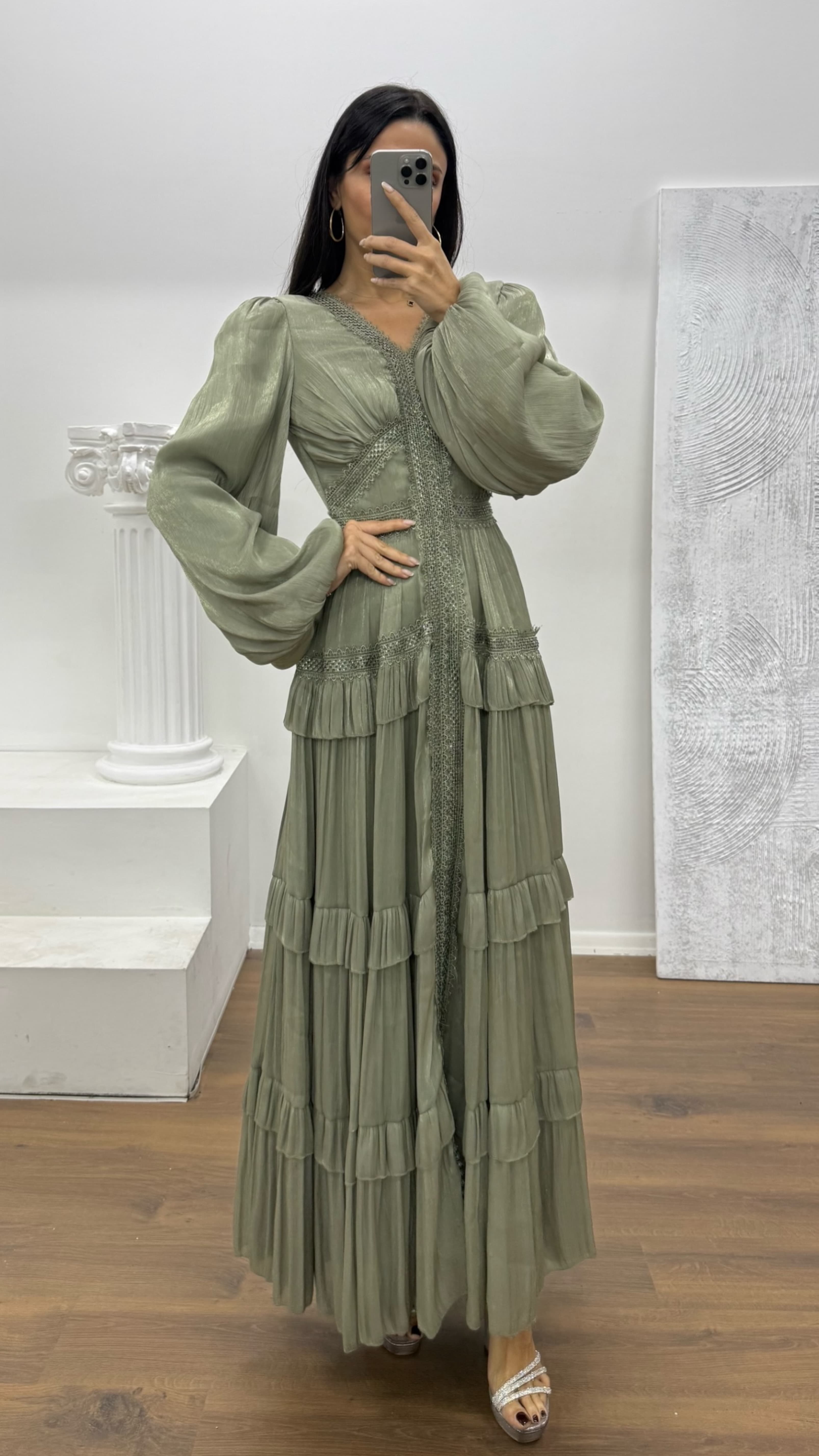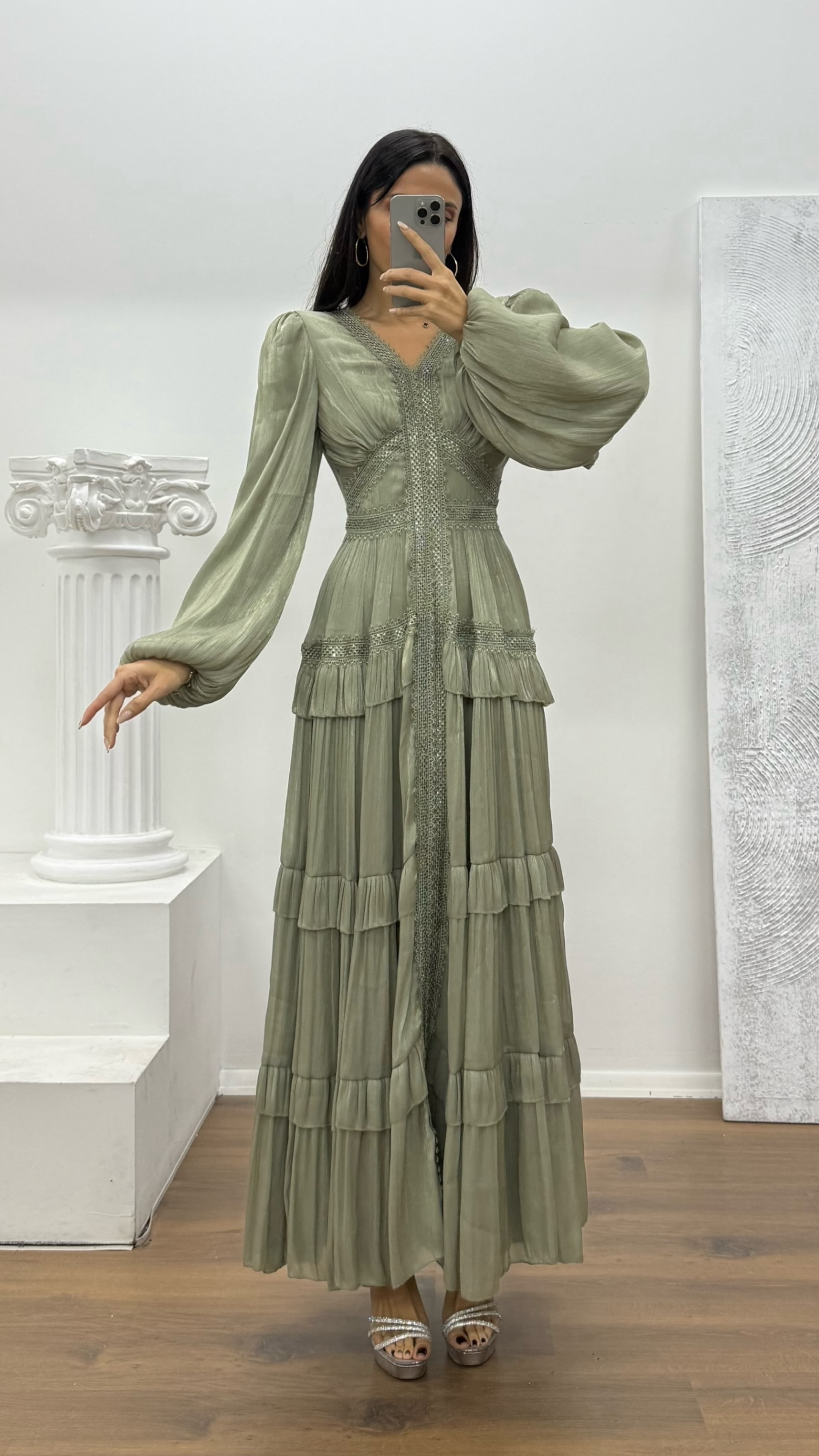 • Yeşil Kat Kat Şifon Abiye Elbise