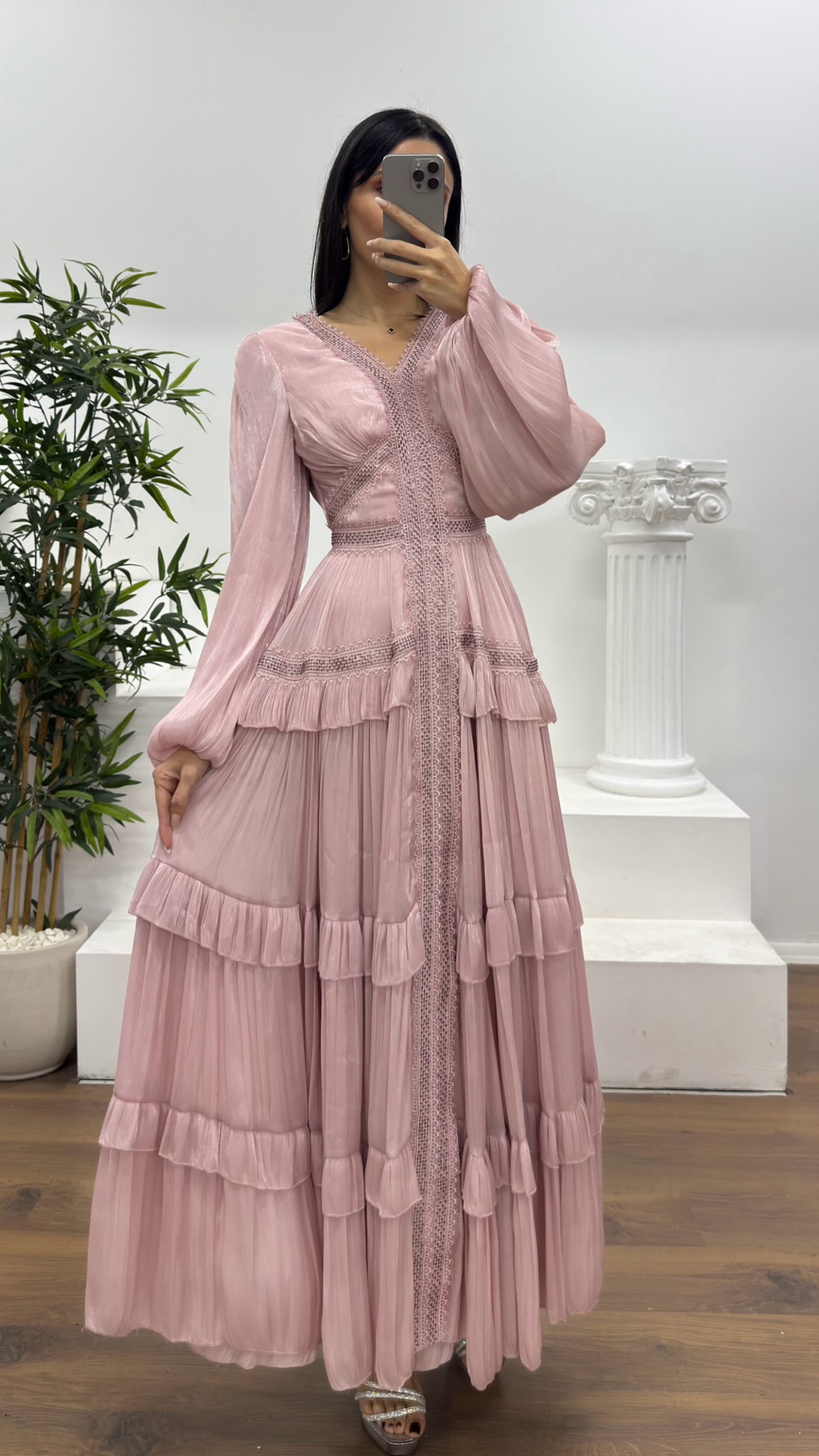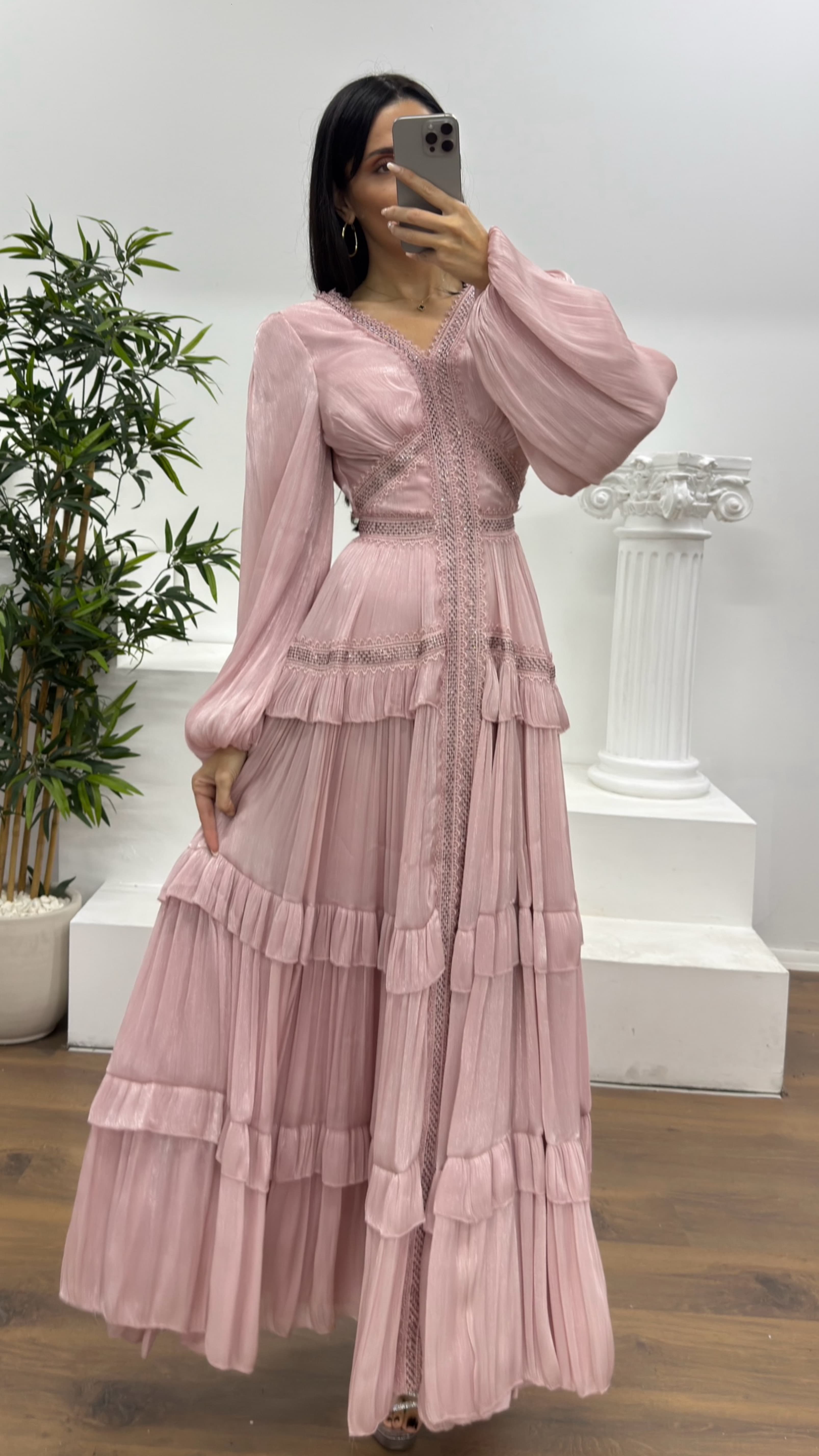 Robe de soirée en mousseline poudrée à plusieurs épaisseurs