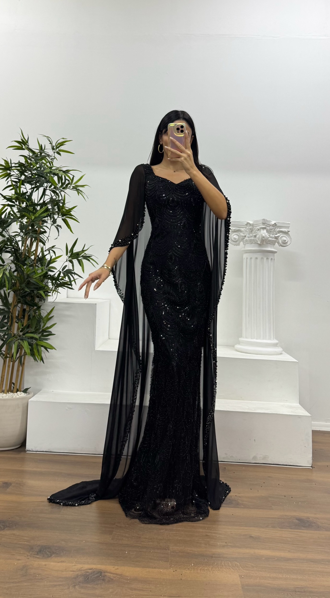 • Siyah İşlemeli Pelerinli  Abiye Elbise