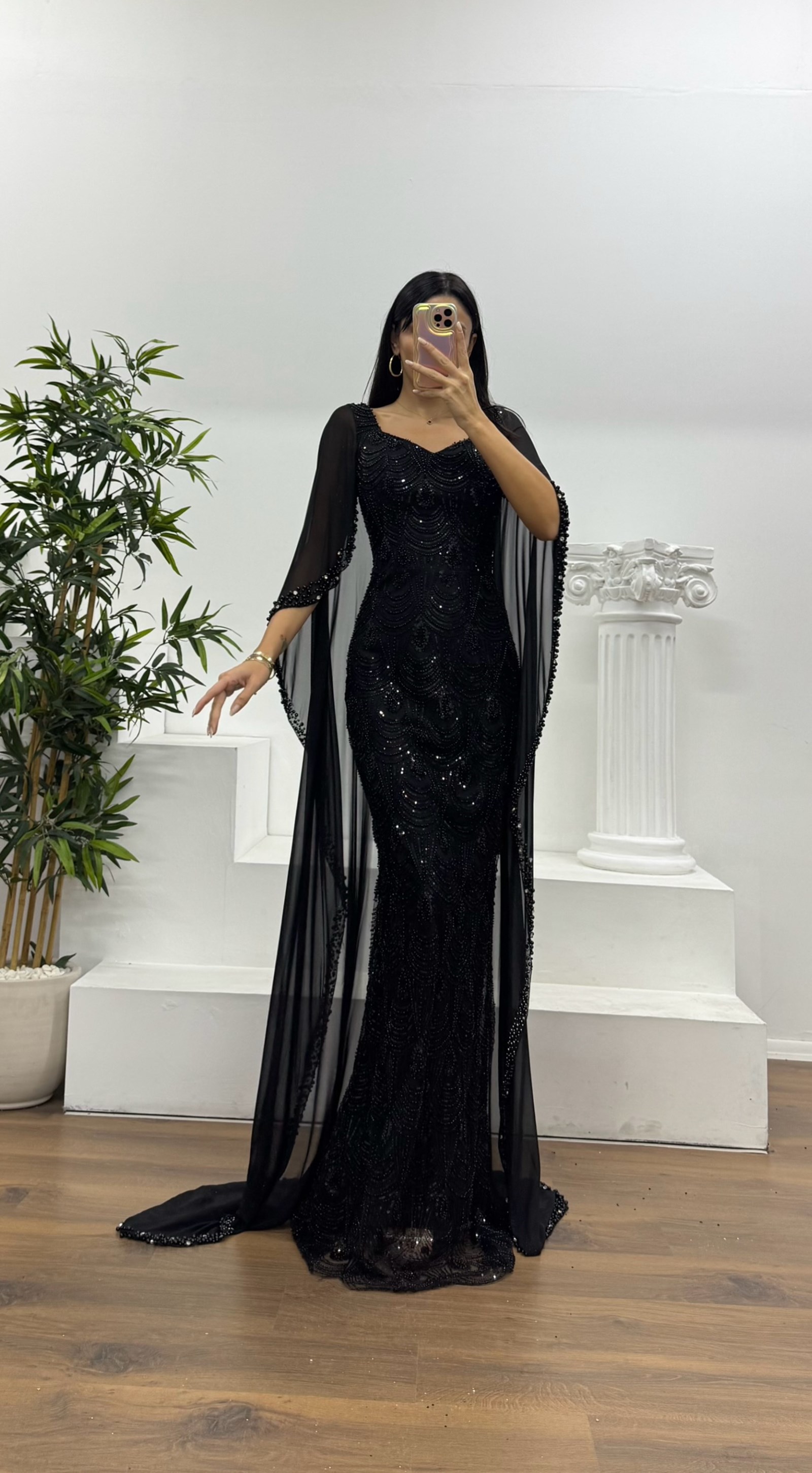 Siyah İşlemeli Pelerinli  Abiye Elbise
