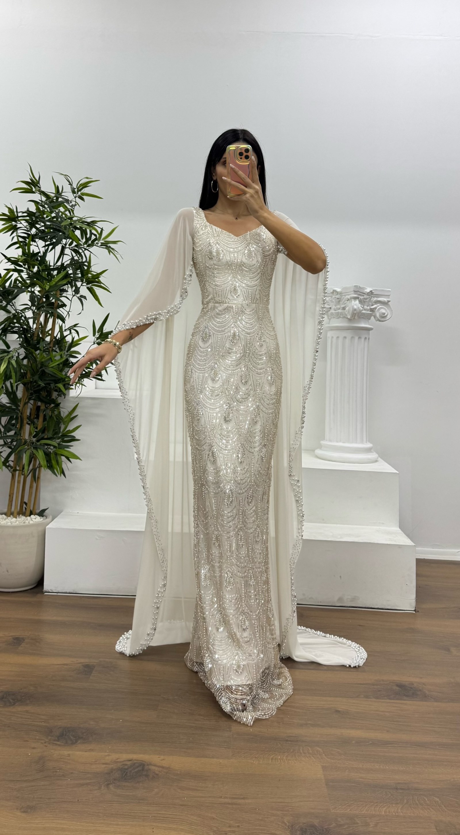 • Ekru İşlemeli Pelerinli  Abiye Elbise