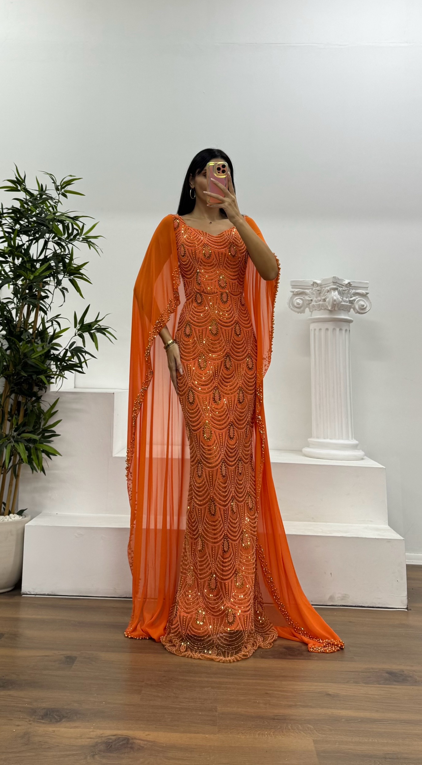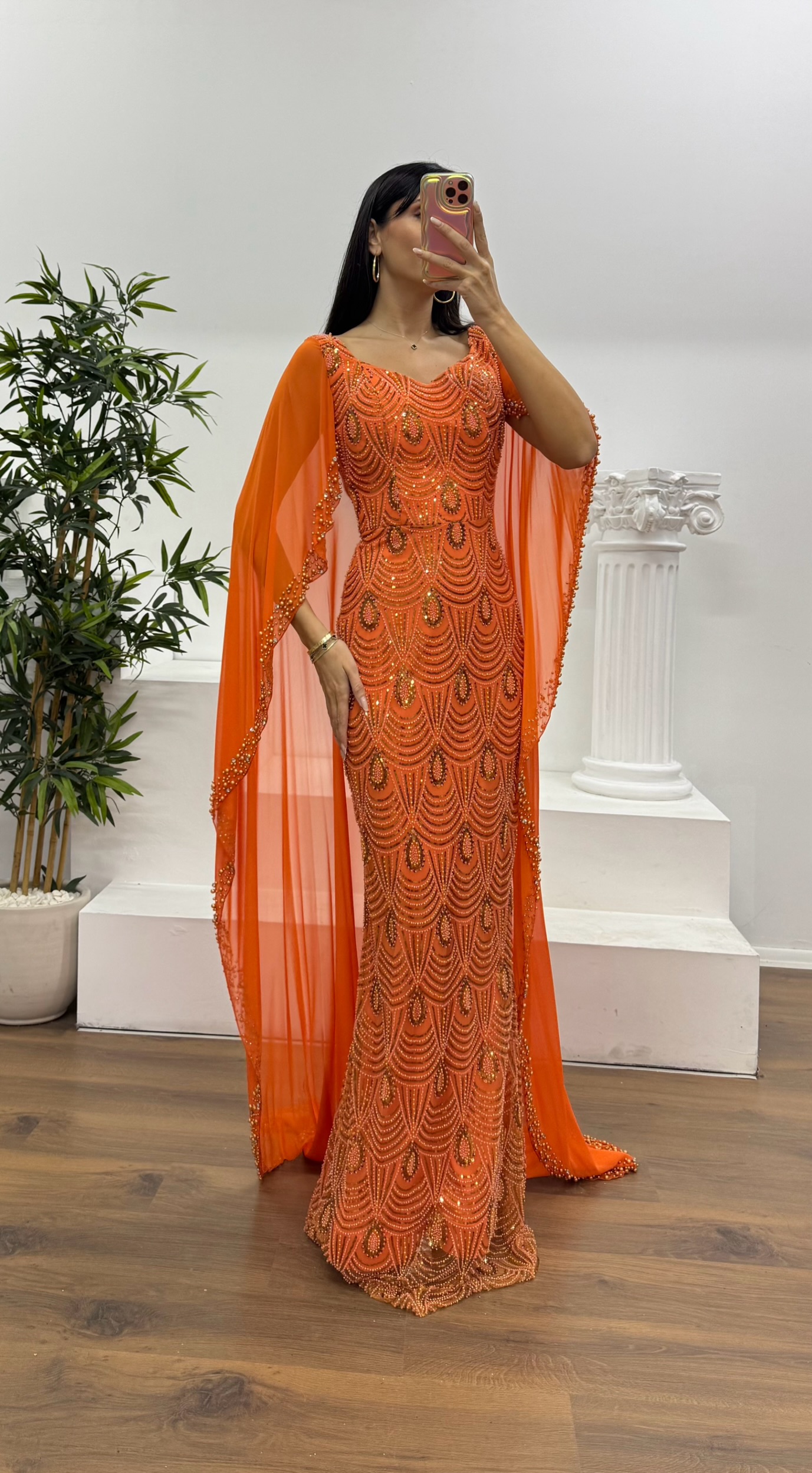 • Turuncu İşlemeli Pelerinli  Abiye Elbise