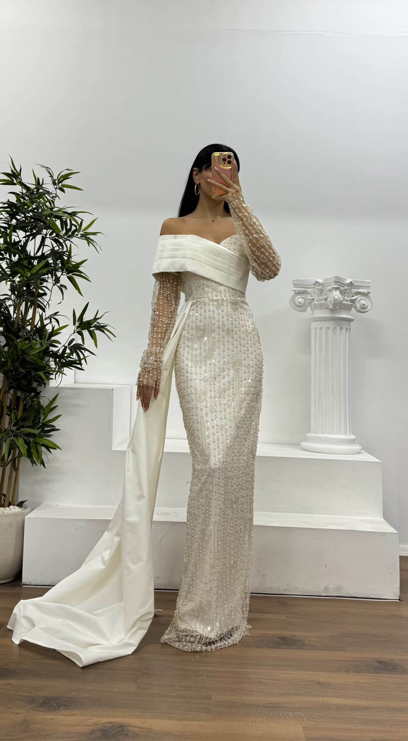 Robe de soirée écru à col bateau brodée