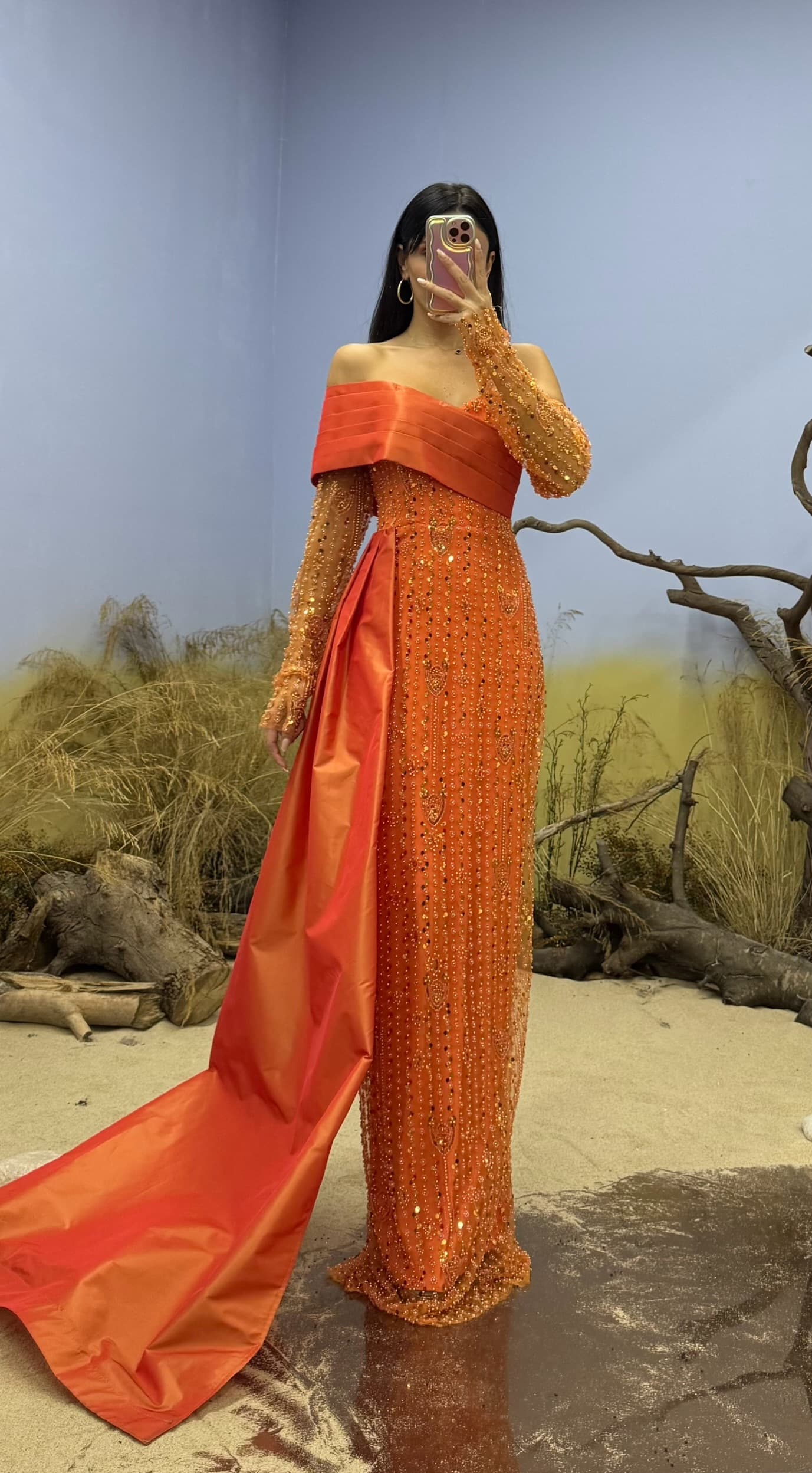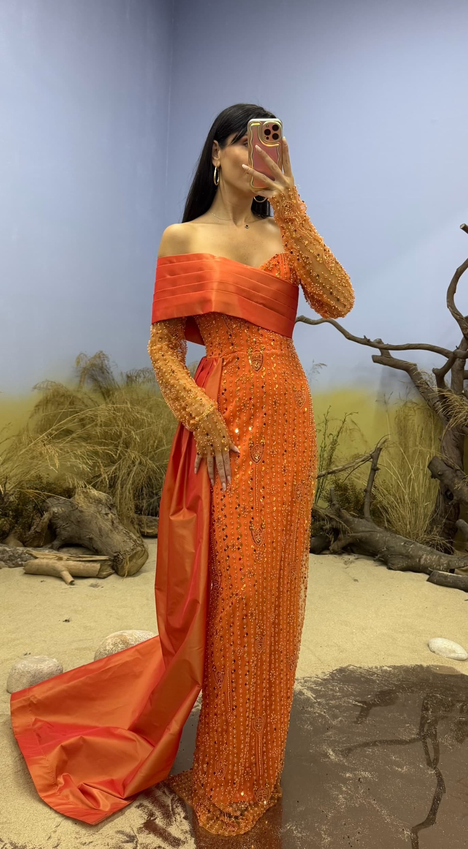 Robe de soirée orange brodée à col bateau