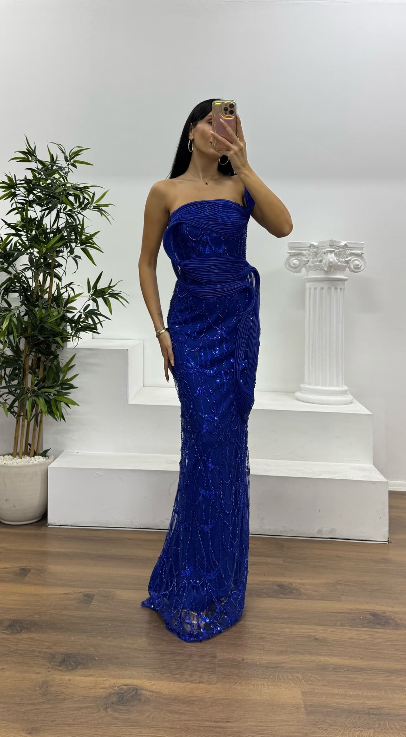 • Saks İşlemeli Şerit Detaylı Uzun Abiye Elbise