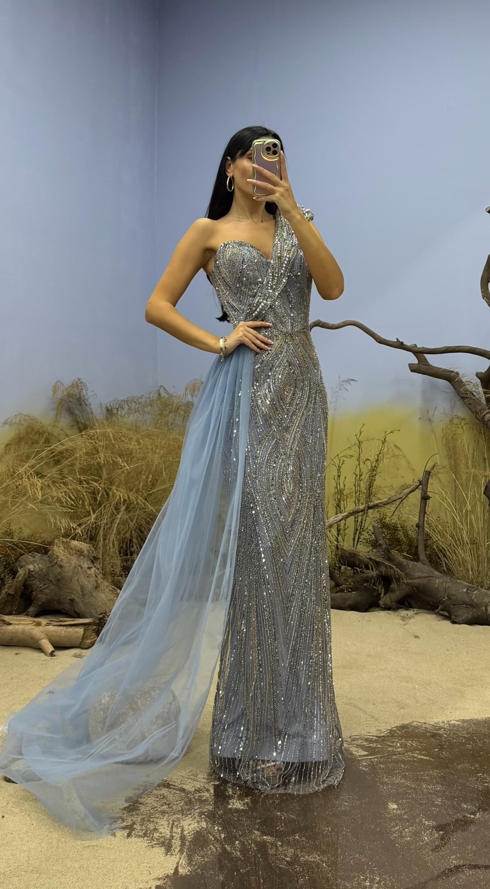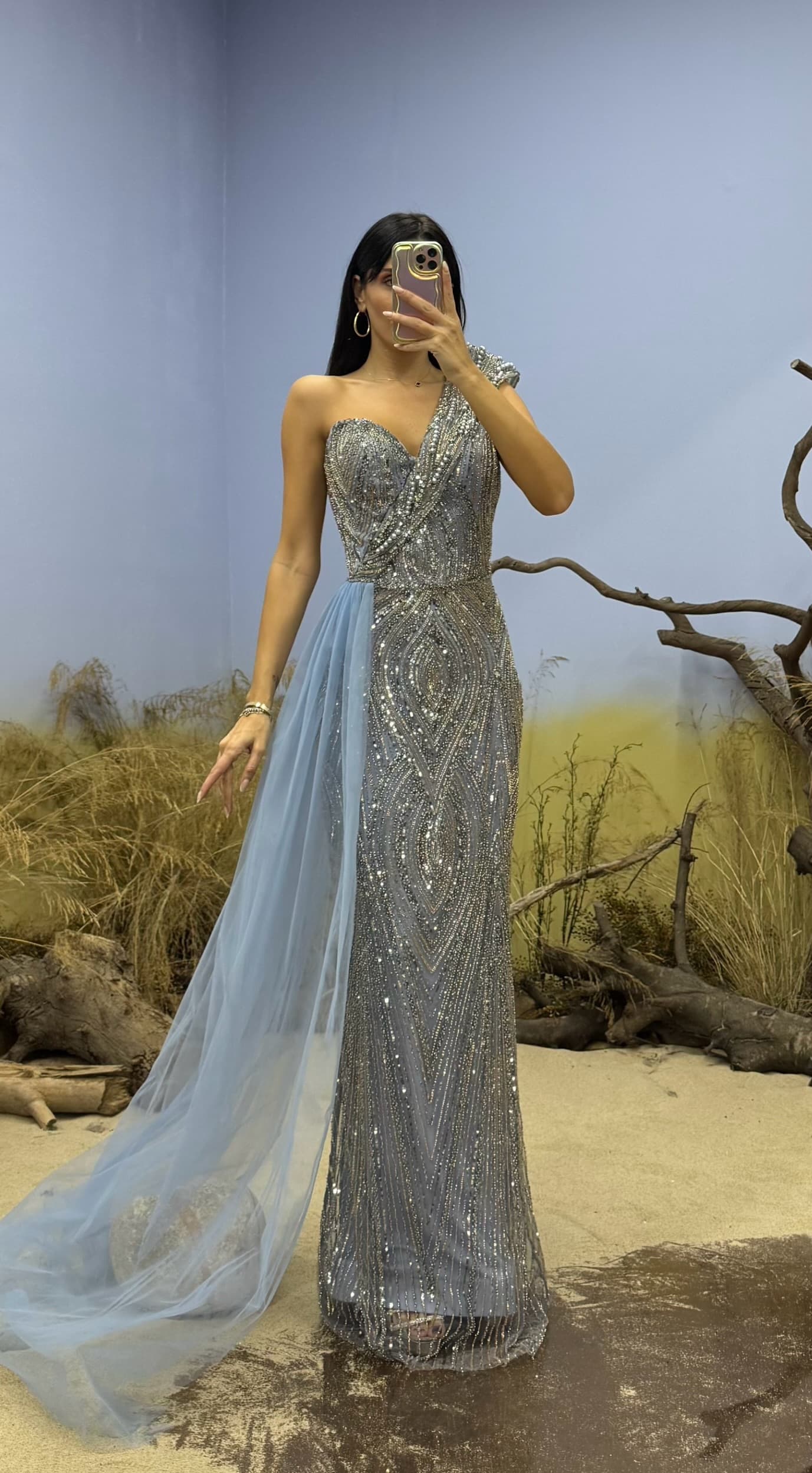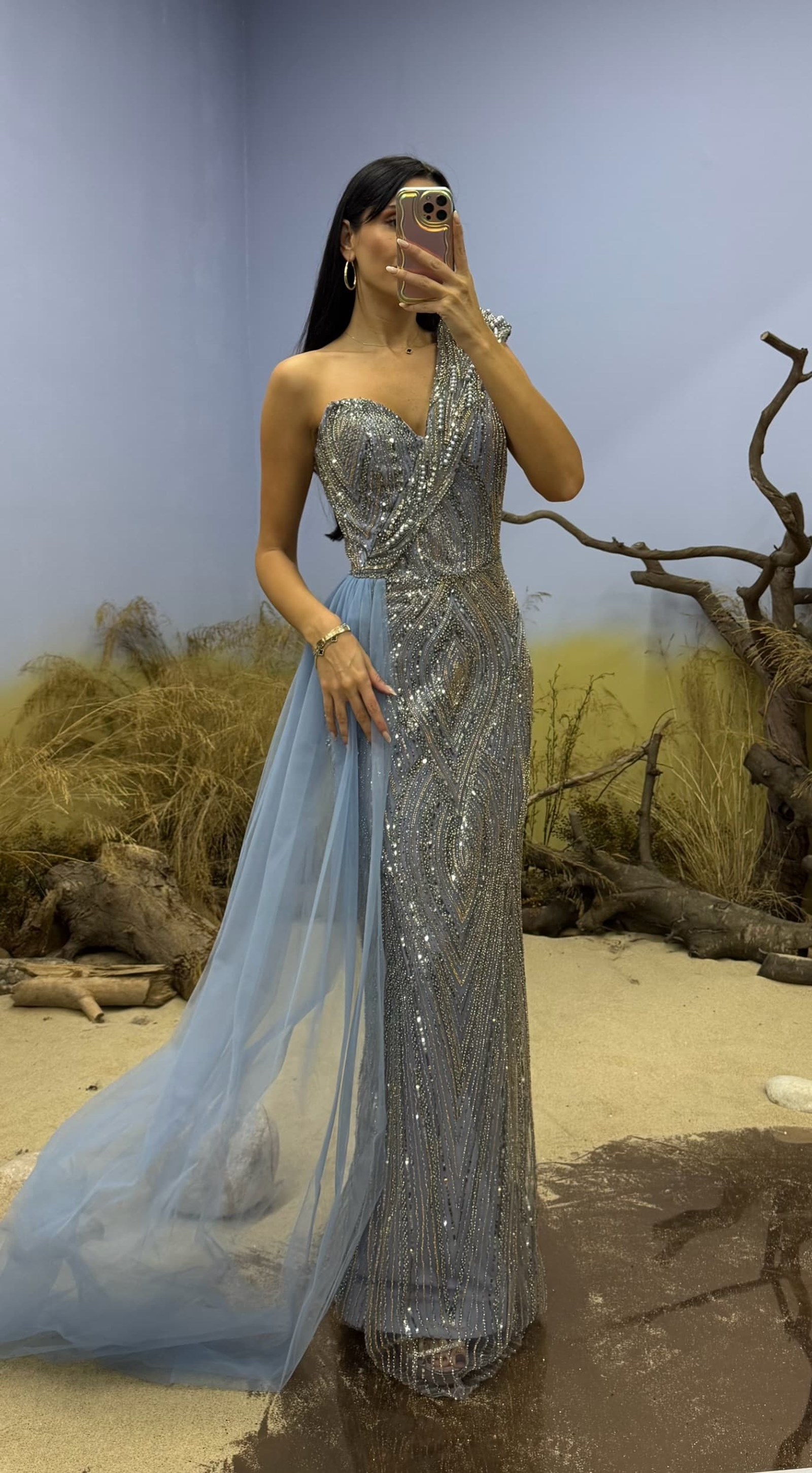 • İndigo Tek Omuz Boncuk İşlemeli Uzun Abiye Elbise