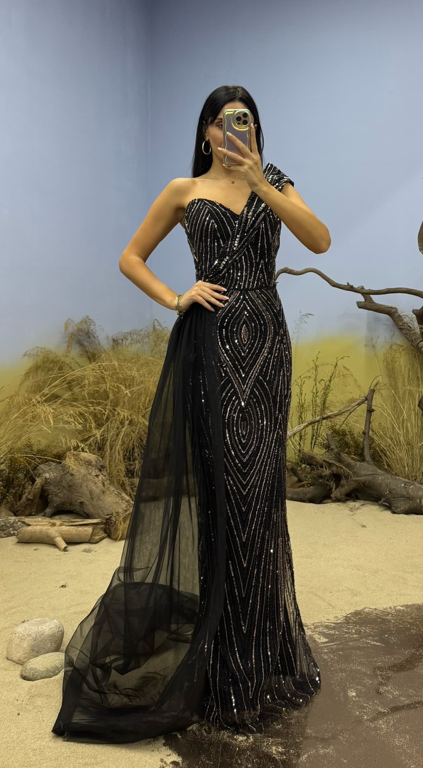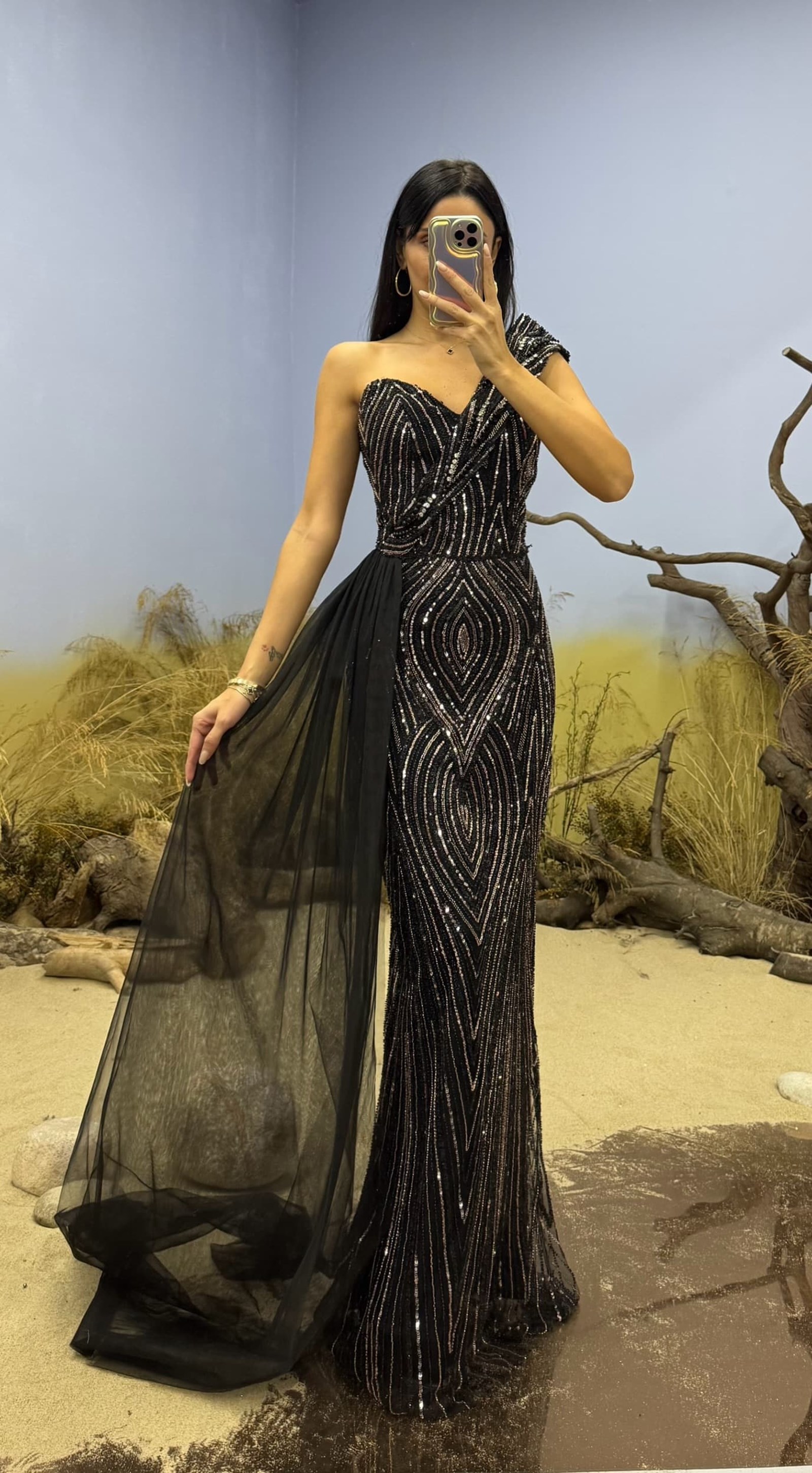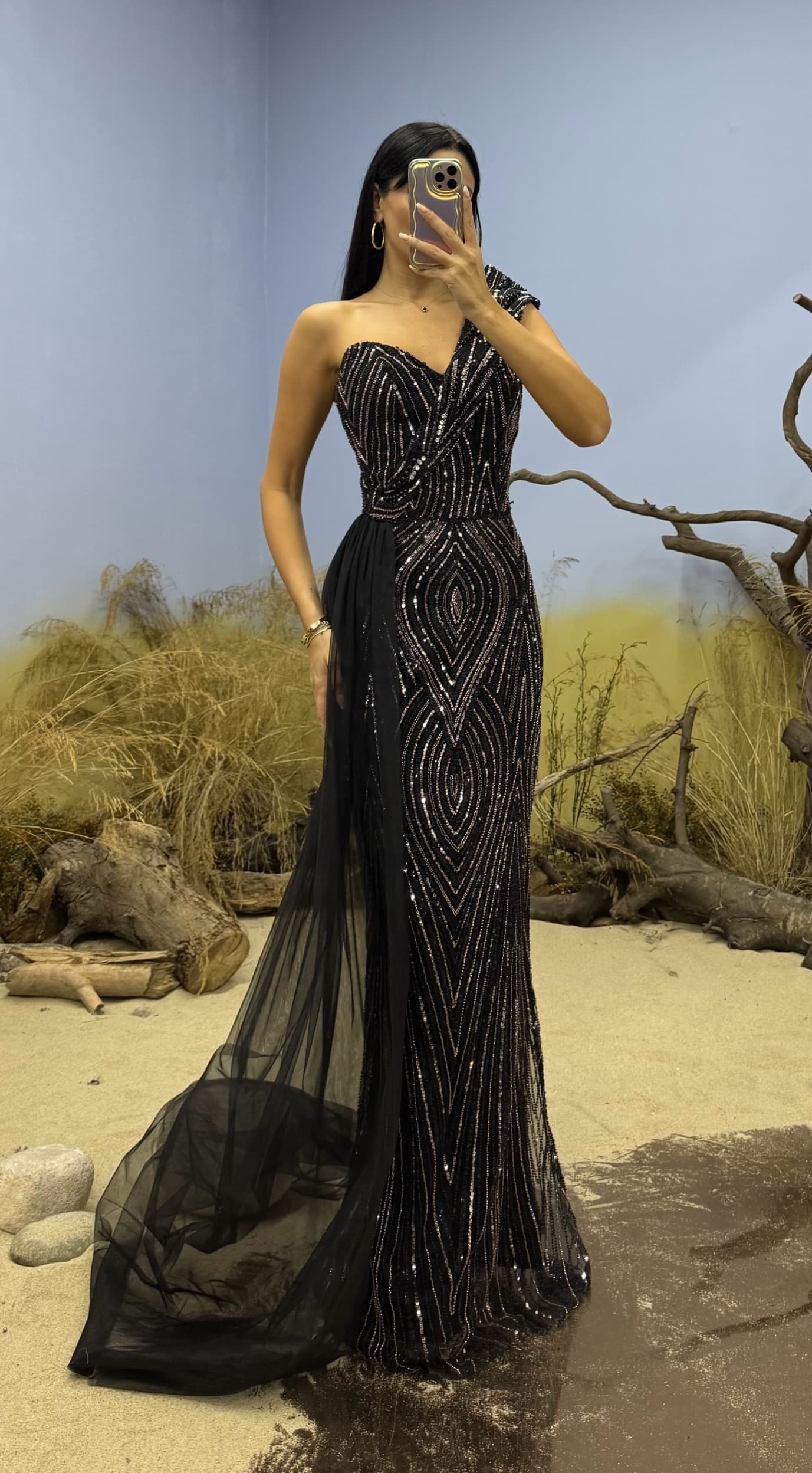 Robe de soirée longue noire asymétrique ornée de perles