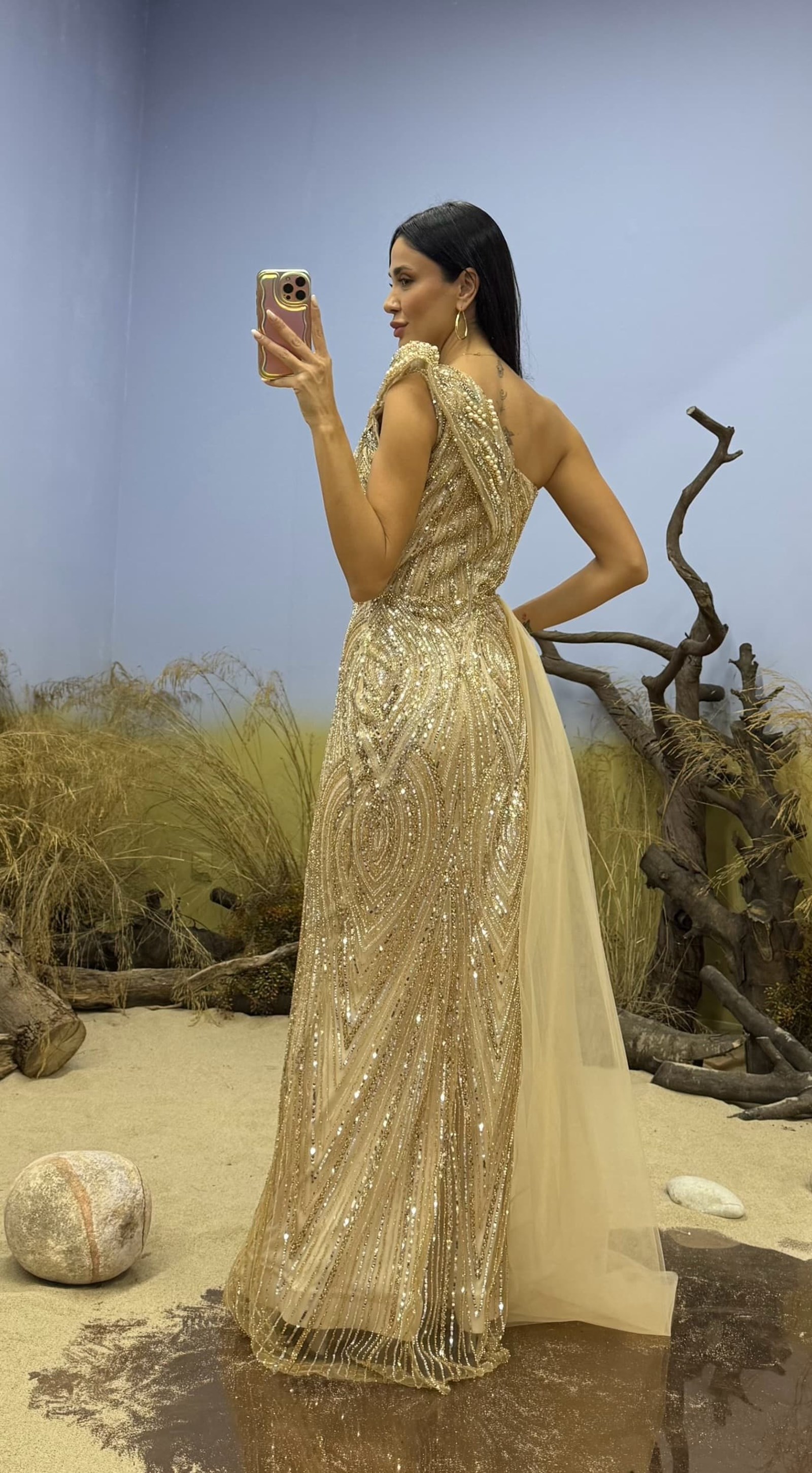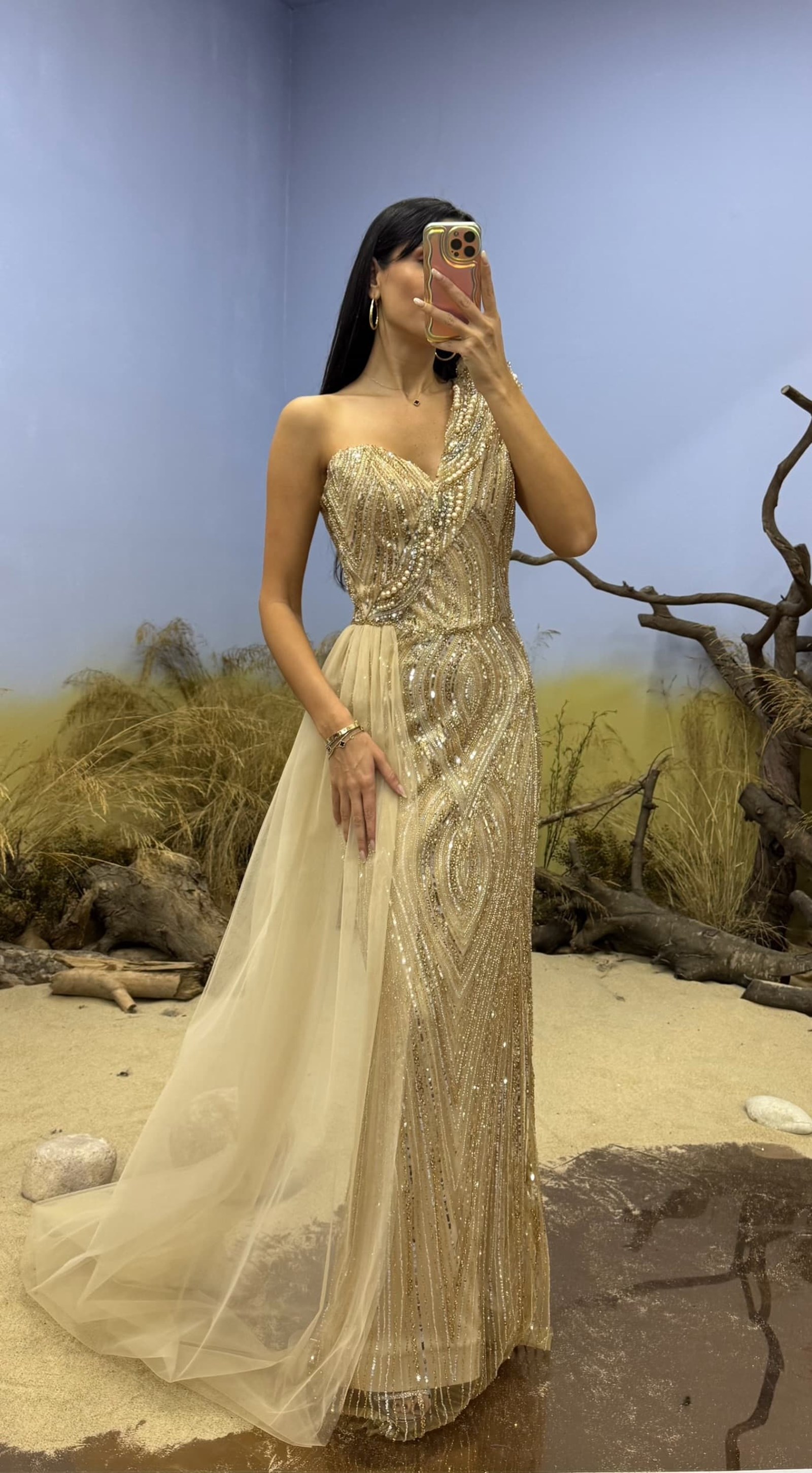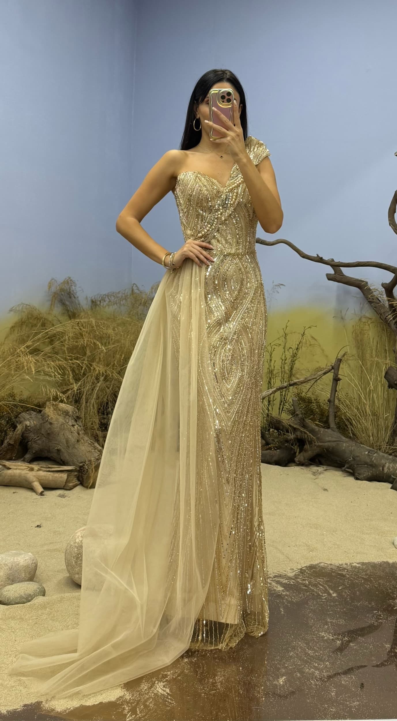 • Bej Tek Omuz Boncuk İşlemeli Uzun Abiye Elbise