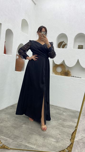 • yeni-gelen-it.png Abito da sera in raso con dettagli ricamati neri