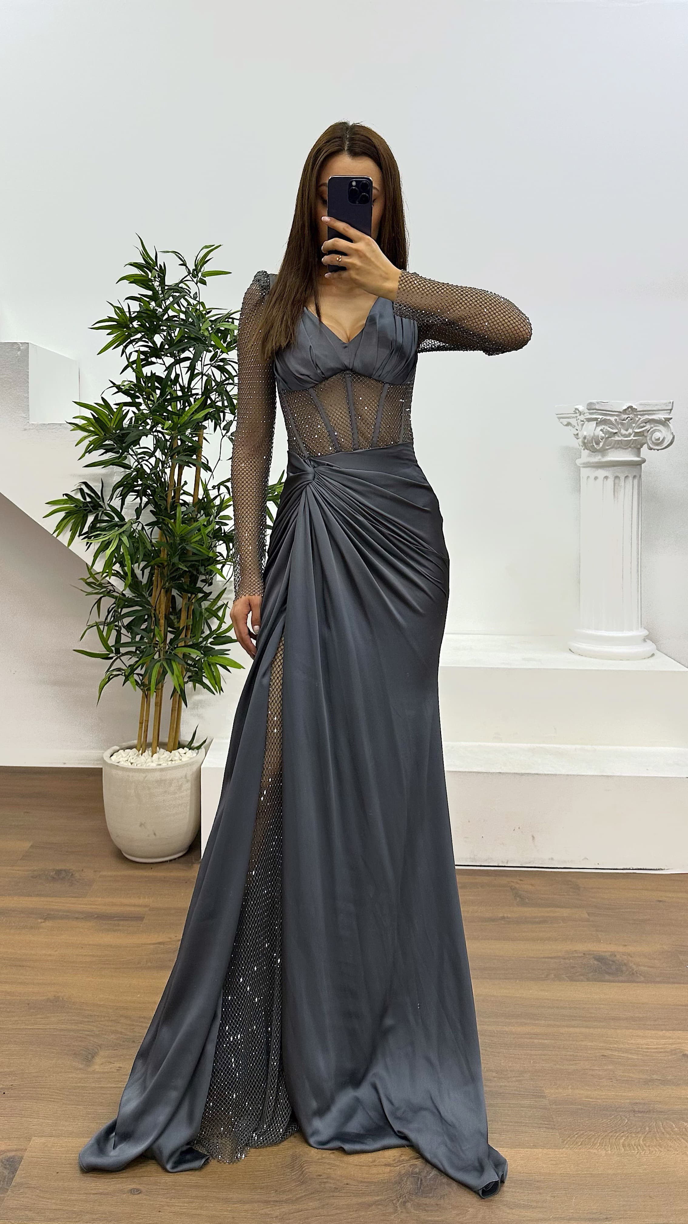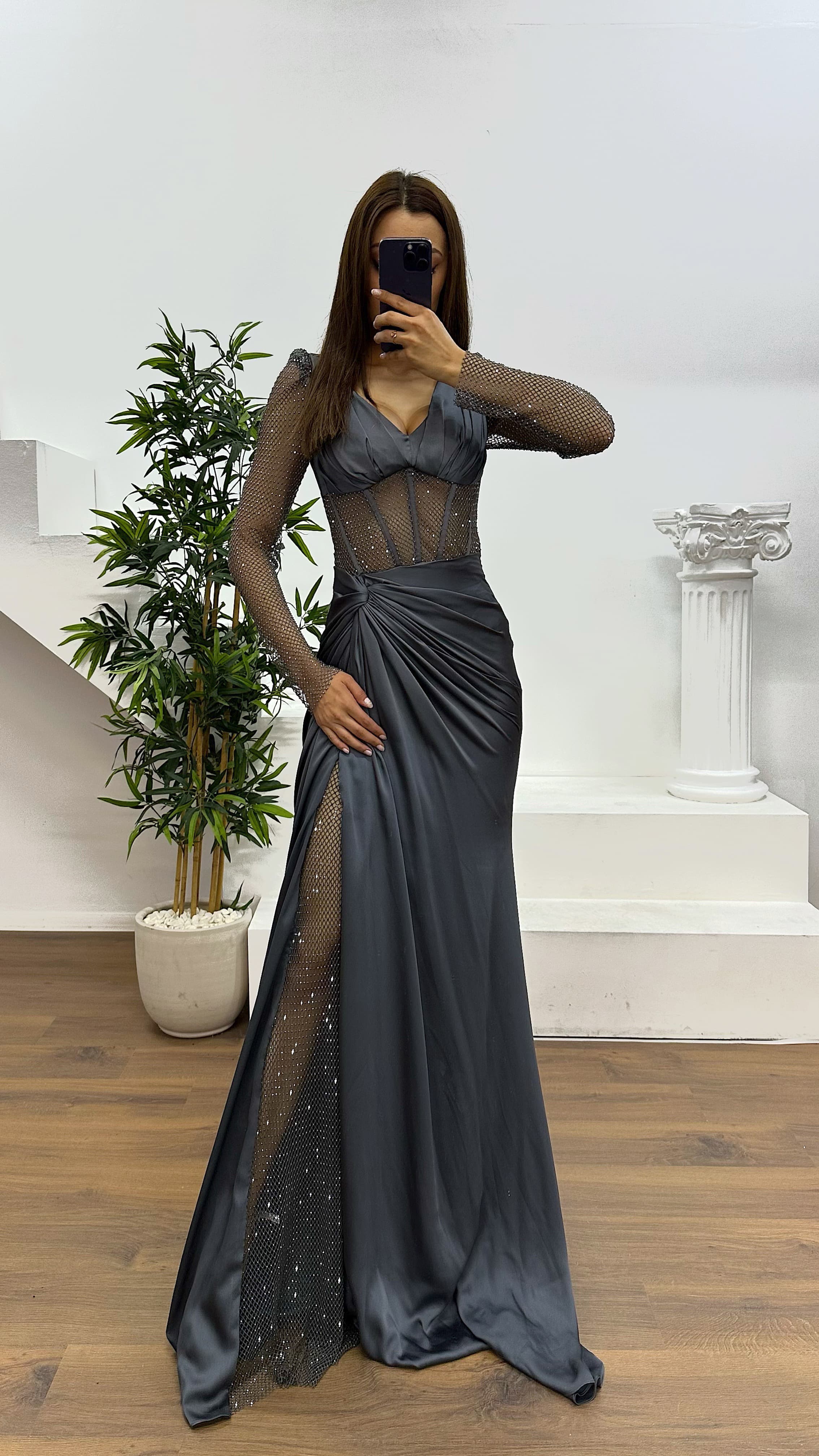 Abito da sera con dettagli in tulle Il prodotto è progettato come abito da sera con dettagli in tulle, adatto per taglie dalla 36 alla 44, con coppe al seno, foderato, chiusura con zip posteriore e spacco. Lunghezza del prodotto: Può variare tra 175-170 cm. Lunghezza manica: 60 cm. Tipo di tessuto: Raso di poliestere, viscosa.