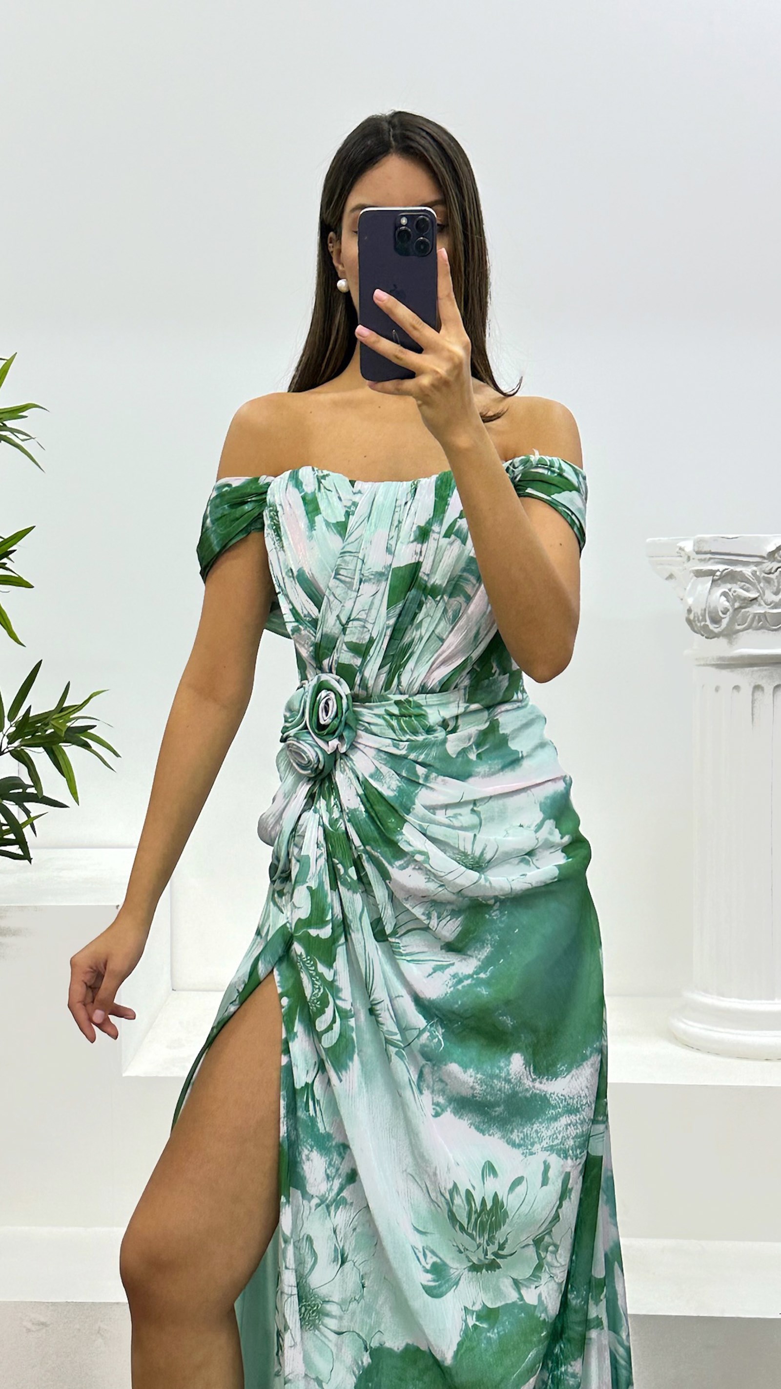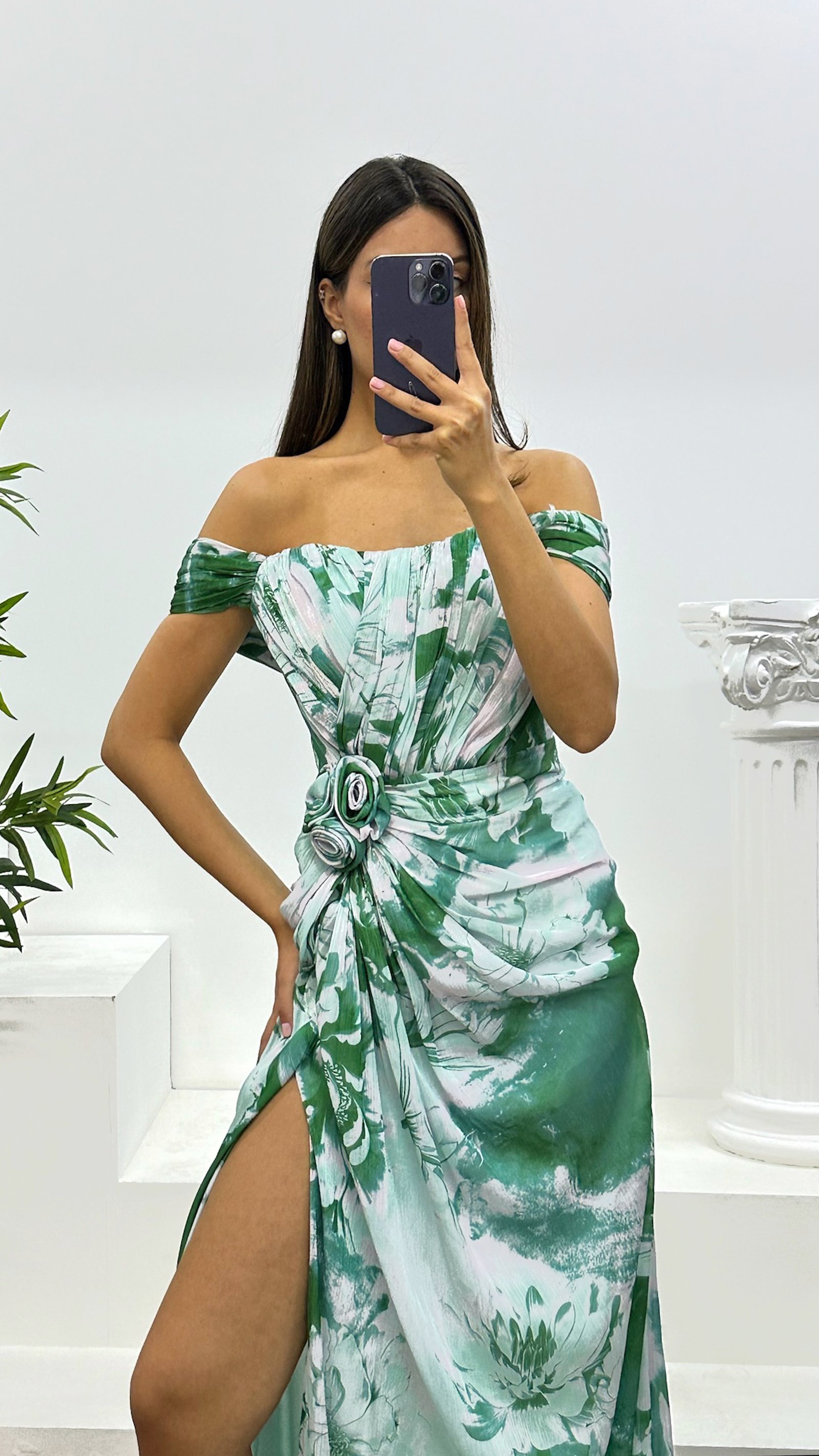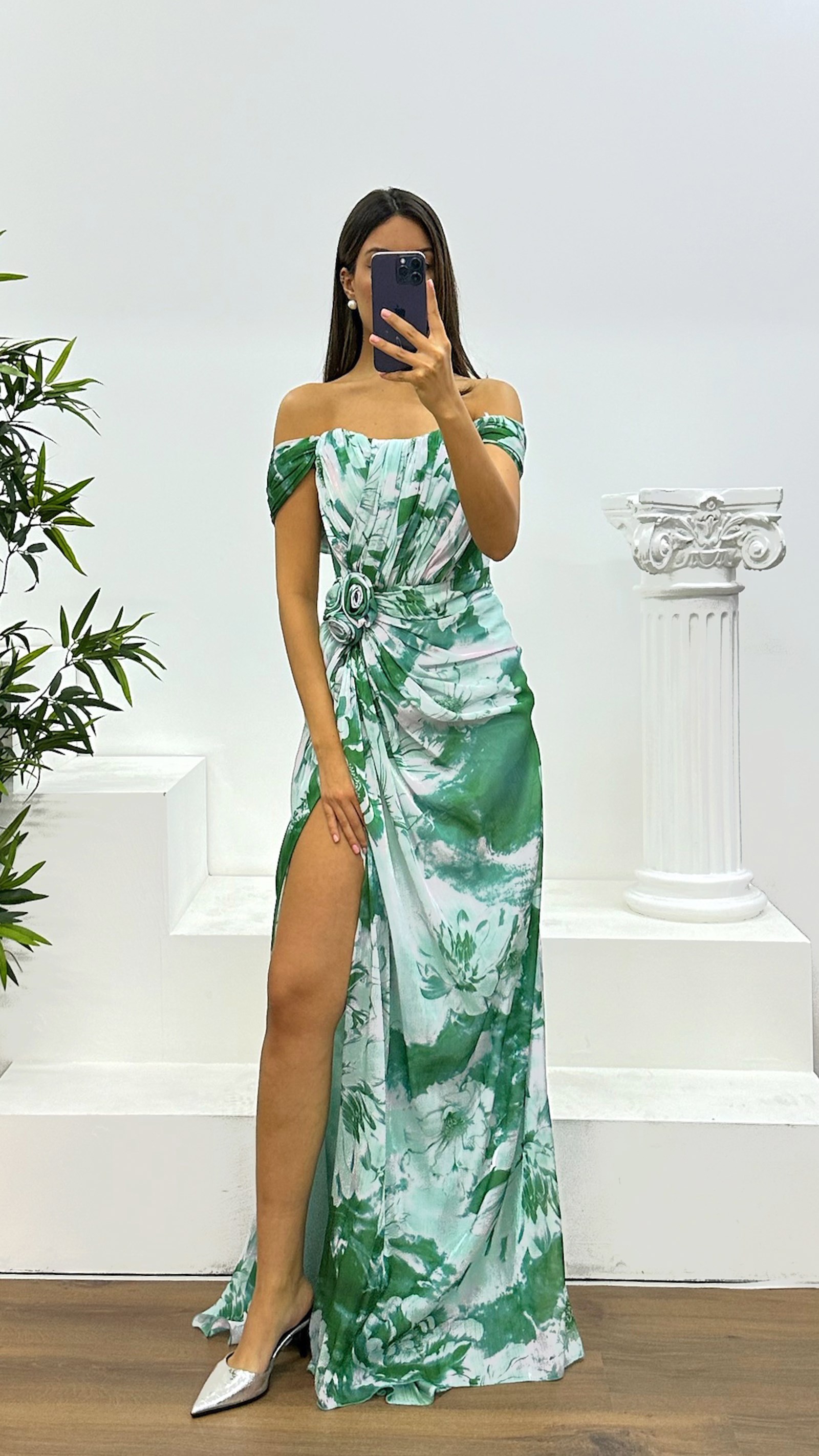 Abito da sera con dettagli floreali Adatto per taglie dalla 36 alla 44, con coppe imbottite, foderato, chiusura con zip posteriore e spacco. Progettato con dettagli floreali. Lunghezza del prodotto: può variare tra 170 e 175 cm. Tipo di tessuto: chiffon, 66% viscosa, 34% poliestere.