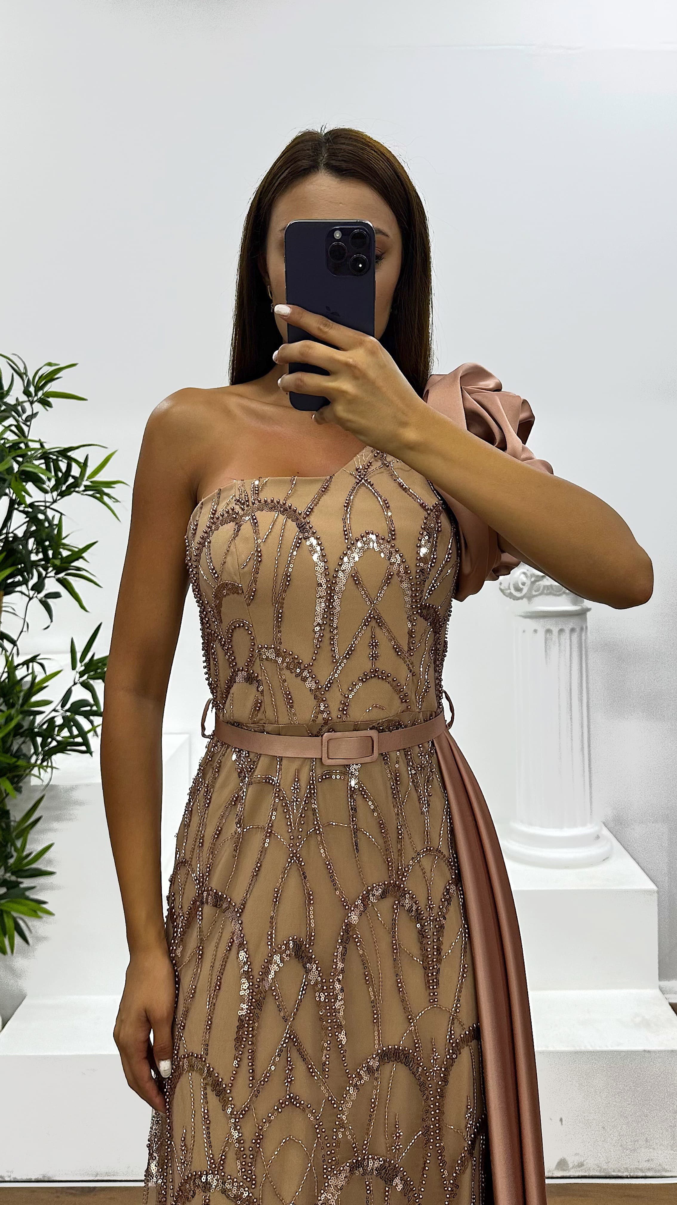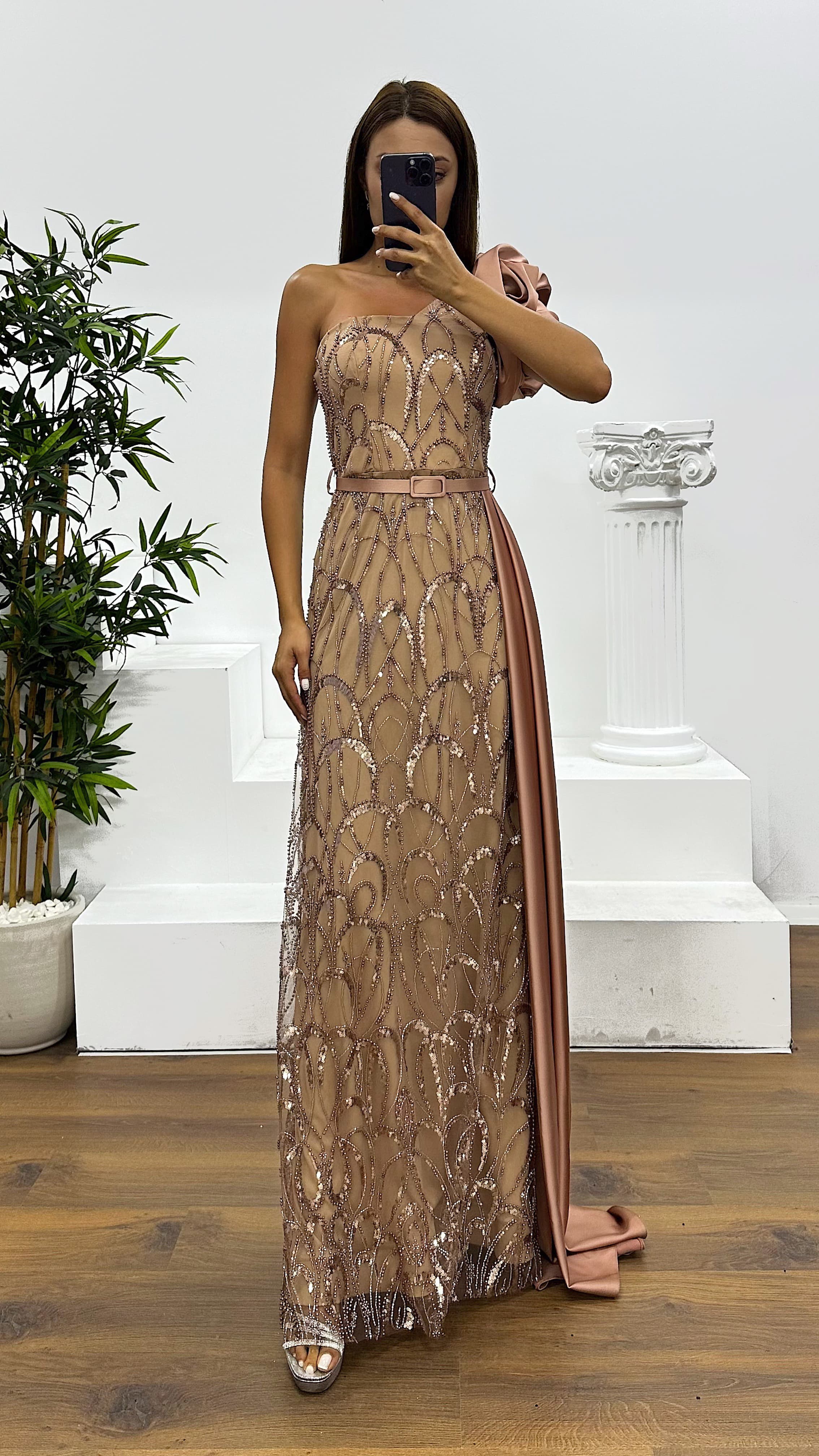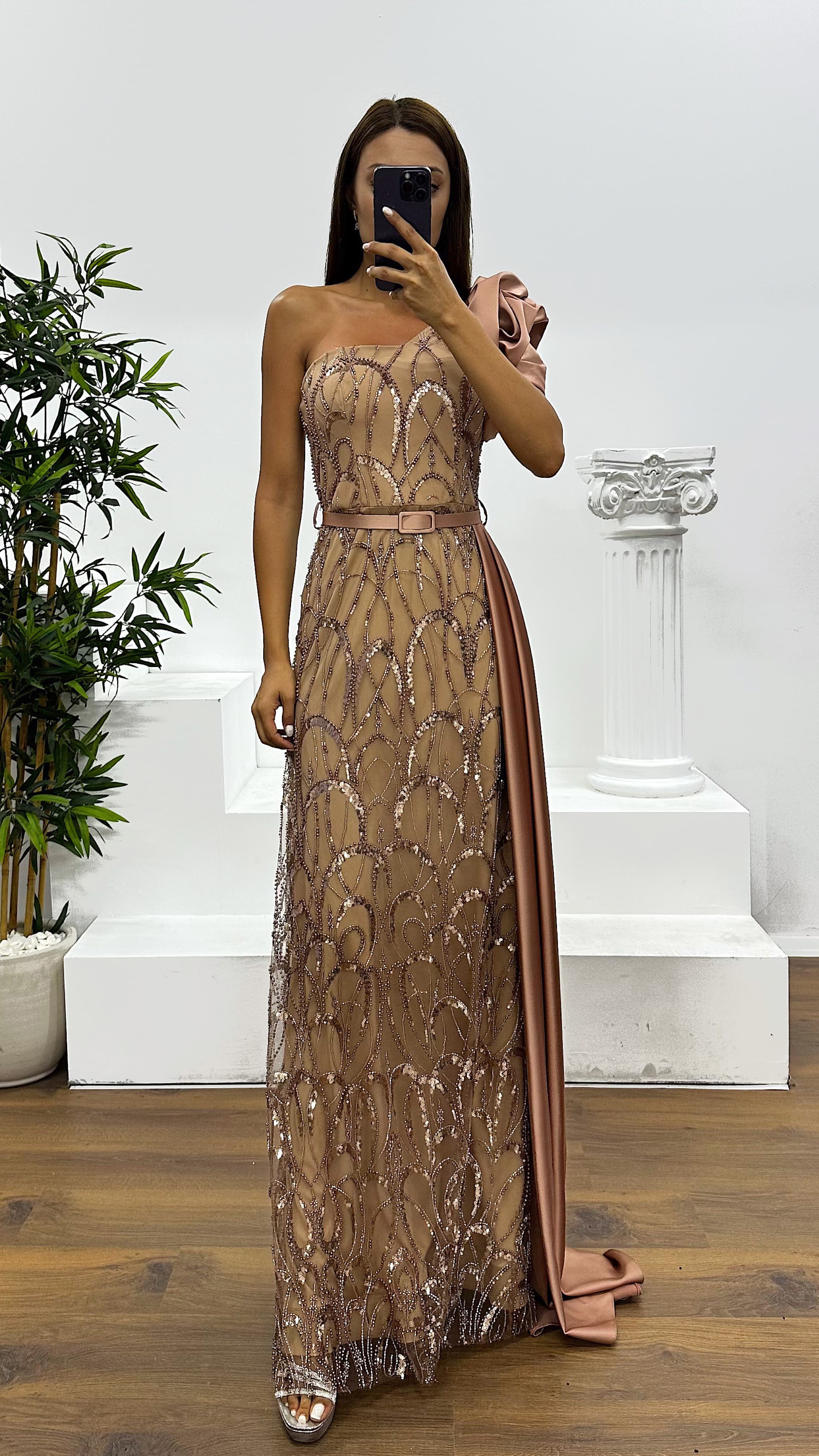 Abito da sera ricamato Il prodotto è progettato come un abito da sera ricamato, adatto alle taglie dalla 36 alla 42, con coppe nel petto, fodera e cintura. Lunghezza del prodotto: Può variare tra 170 e 175 cm. Tipo di tessuto: paillettes (100% poliestere), raso di poliestere, viscosa.