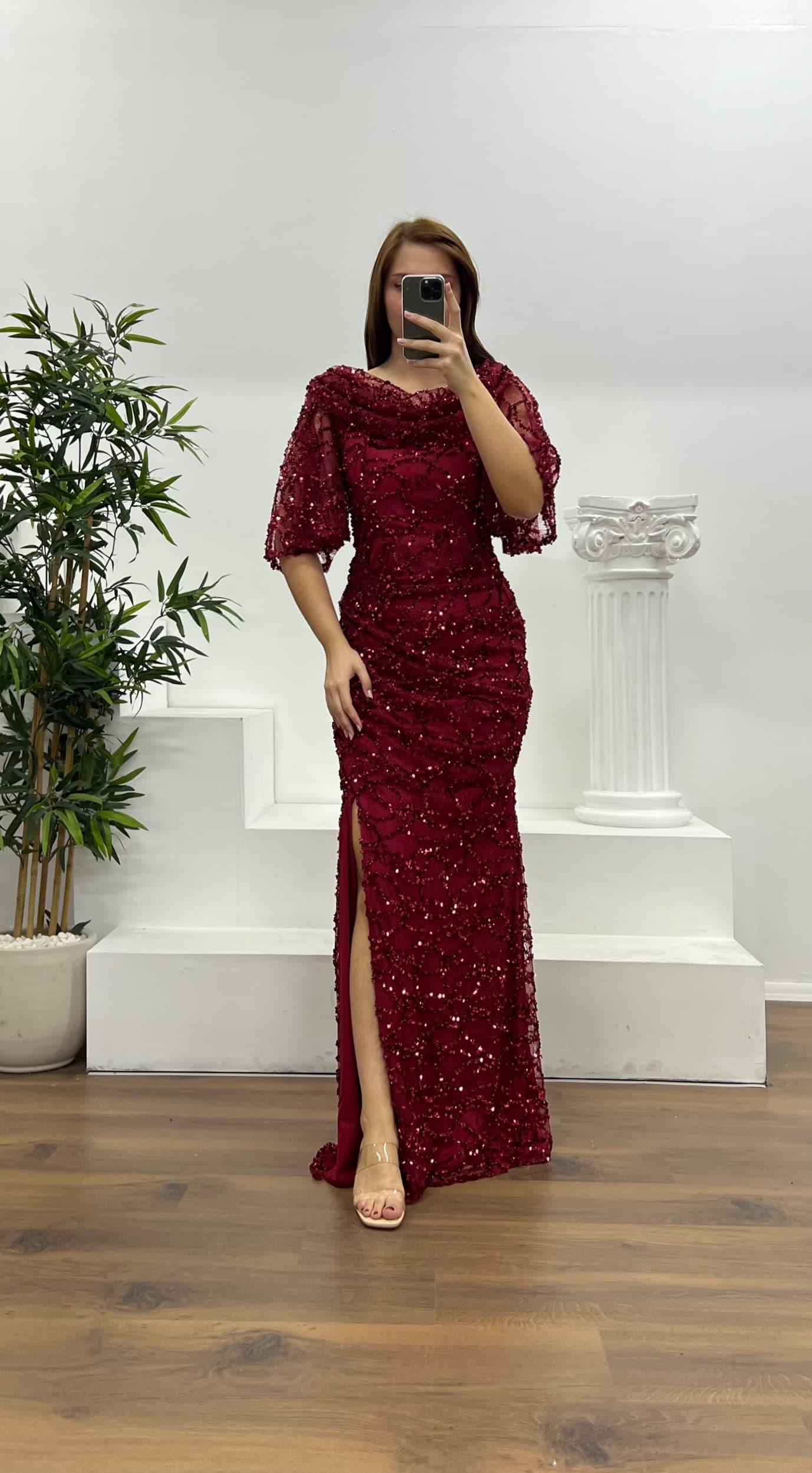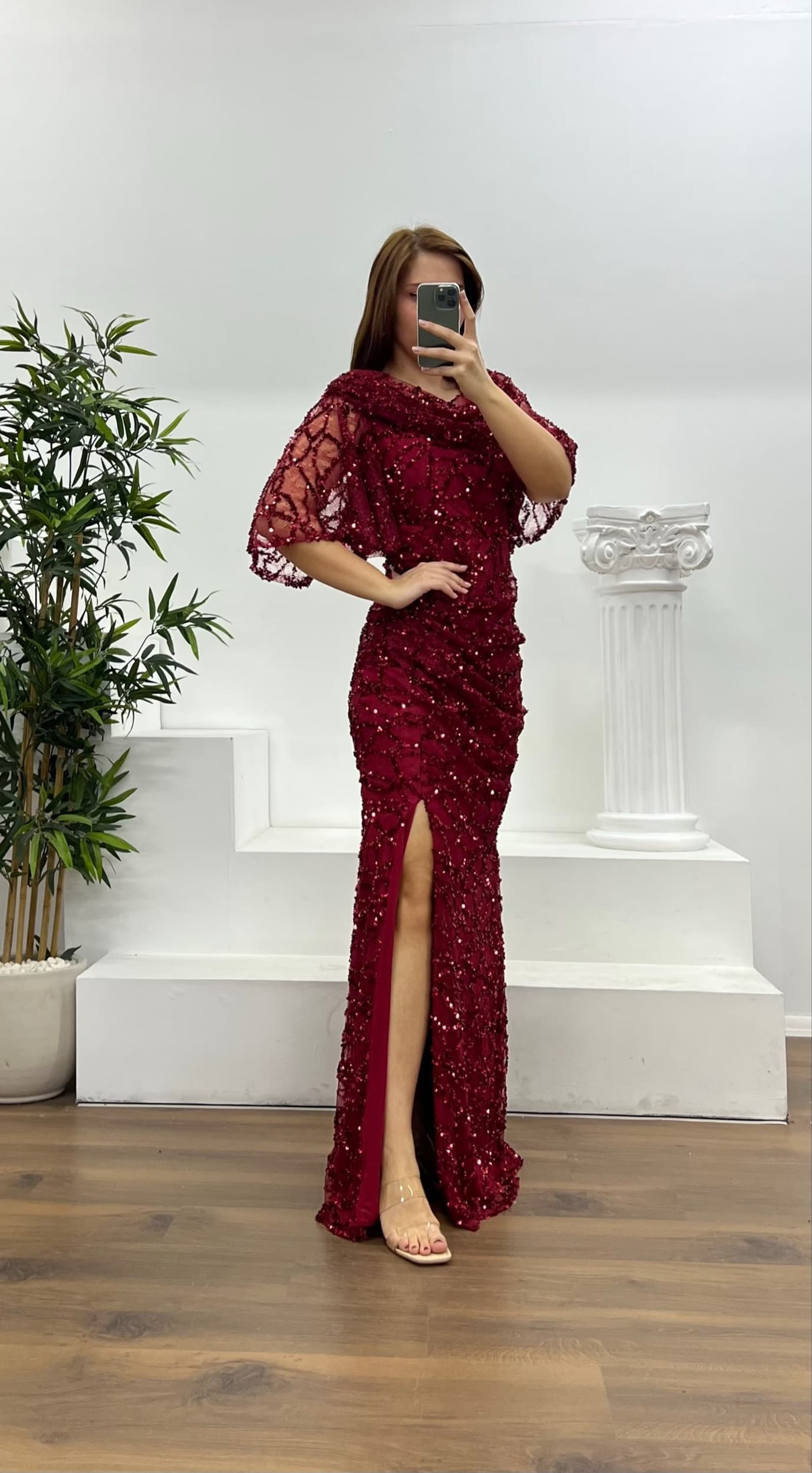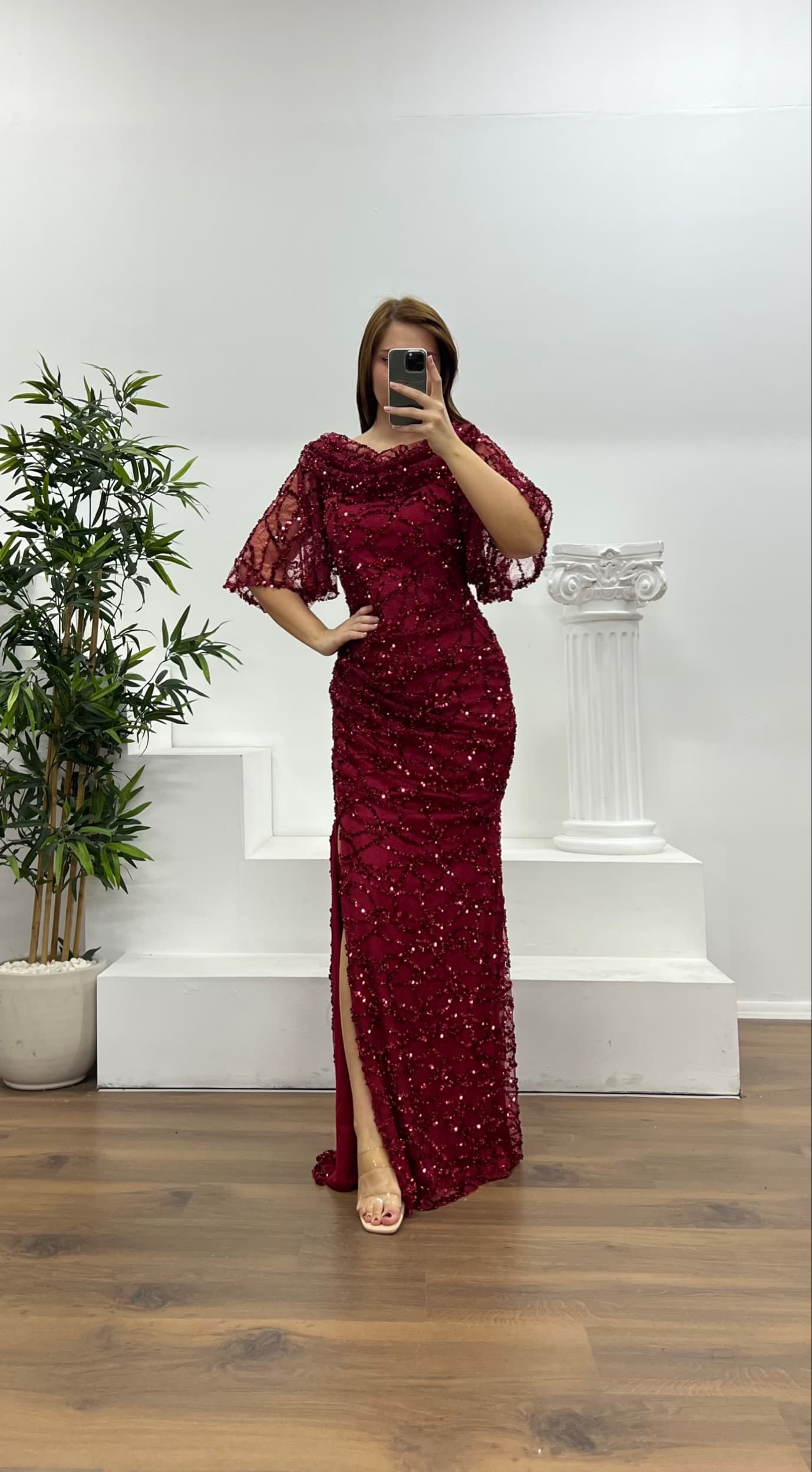 • Bordo Dökümlü Boncuk İşlemeli Büyük Beden Abiye Elbise