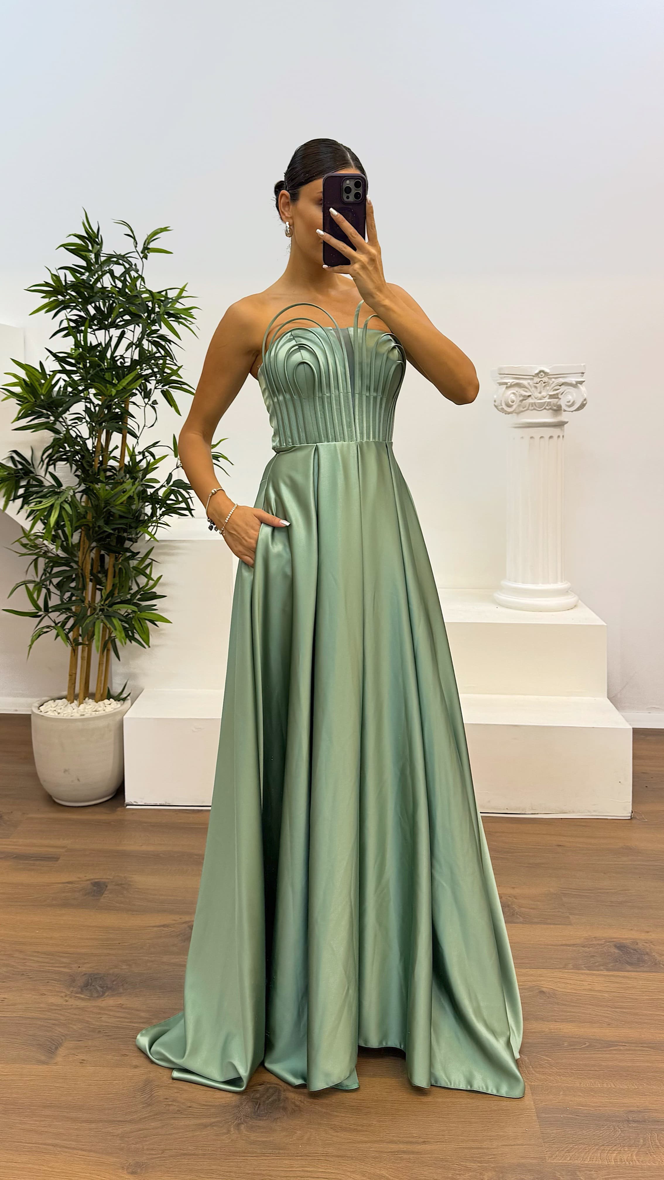 • Kemik Straplez Göğüs Detay Abiye Elbise