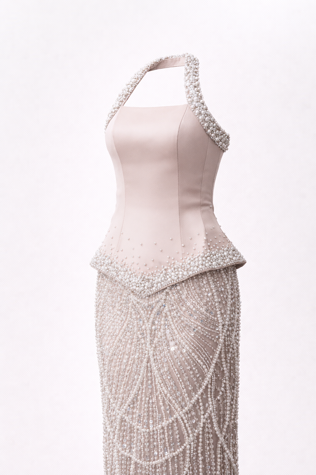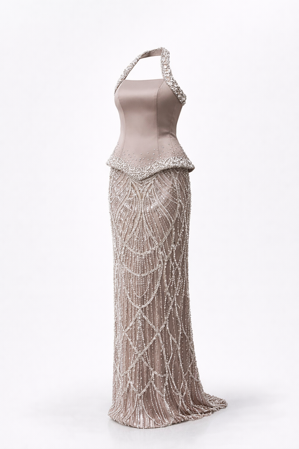 • Bej Halter Yaka İnci Detay  Abiye Elbise