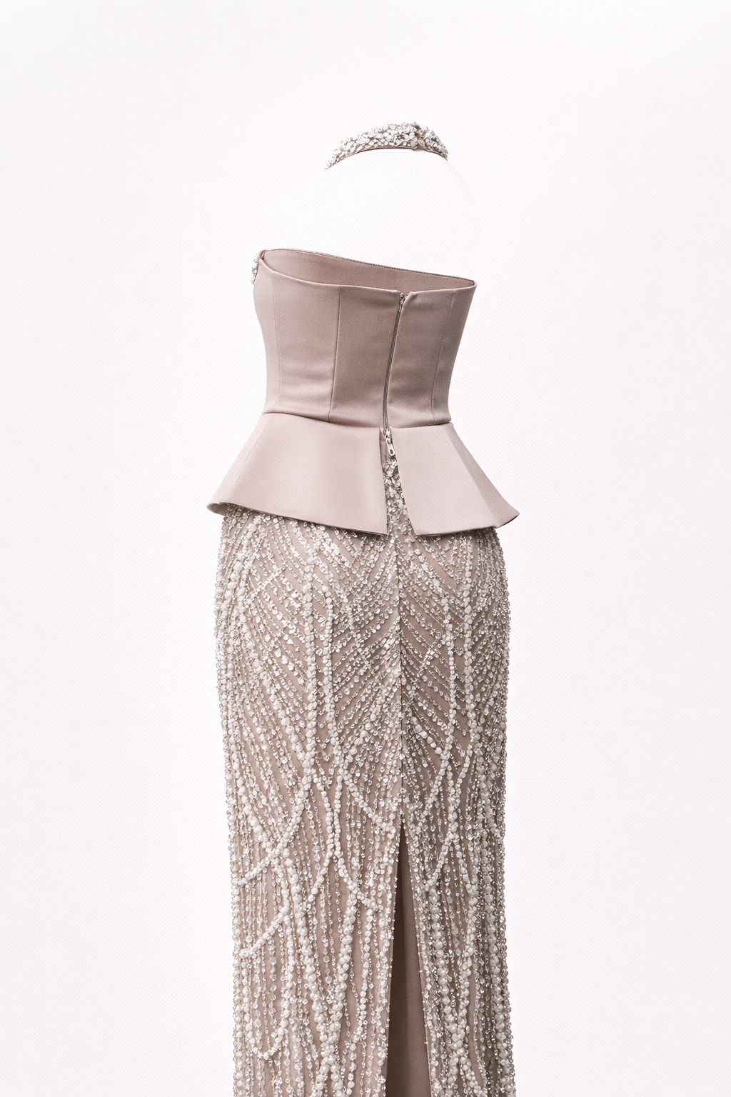 • Abito da sera color cappuccino con scollo all'americana e dettagli in perle