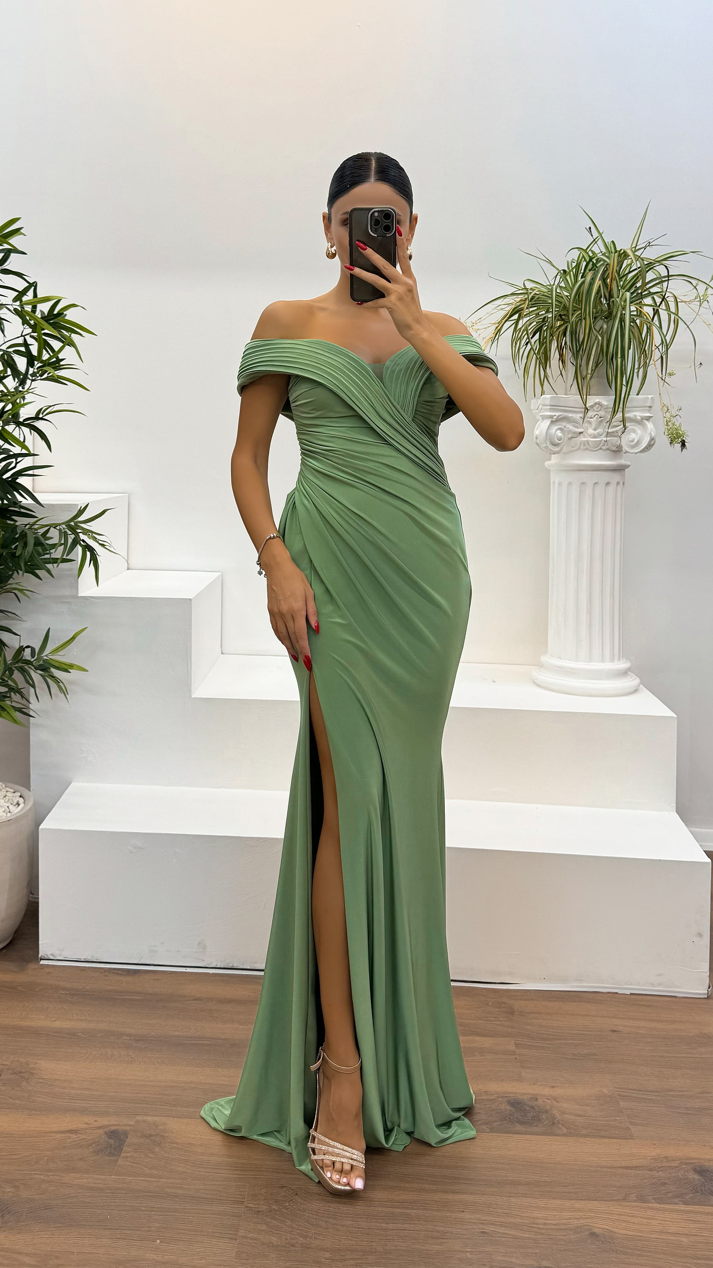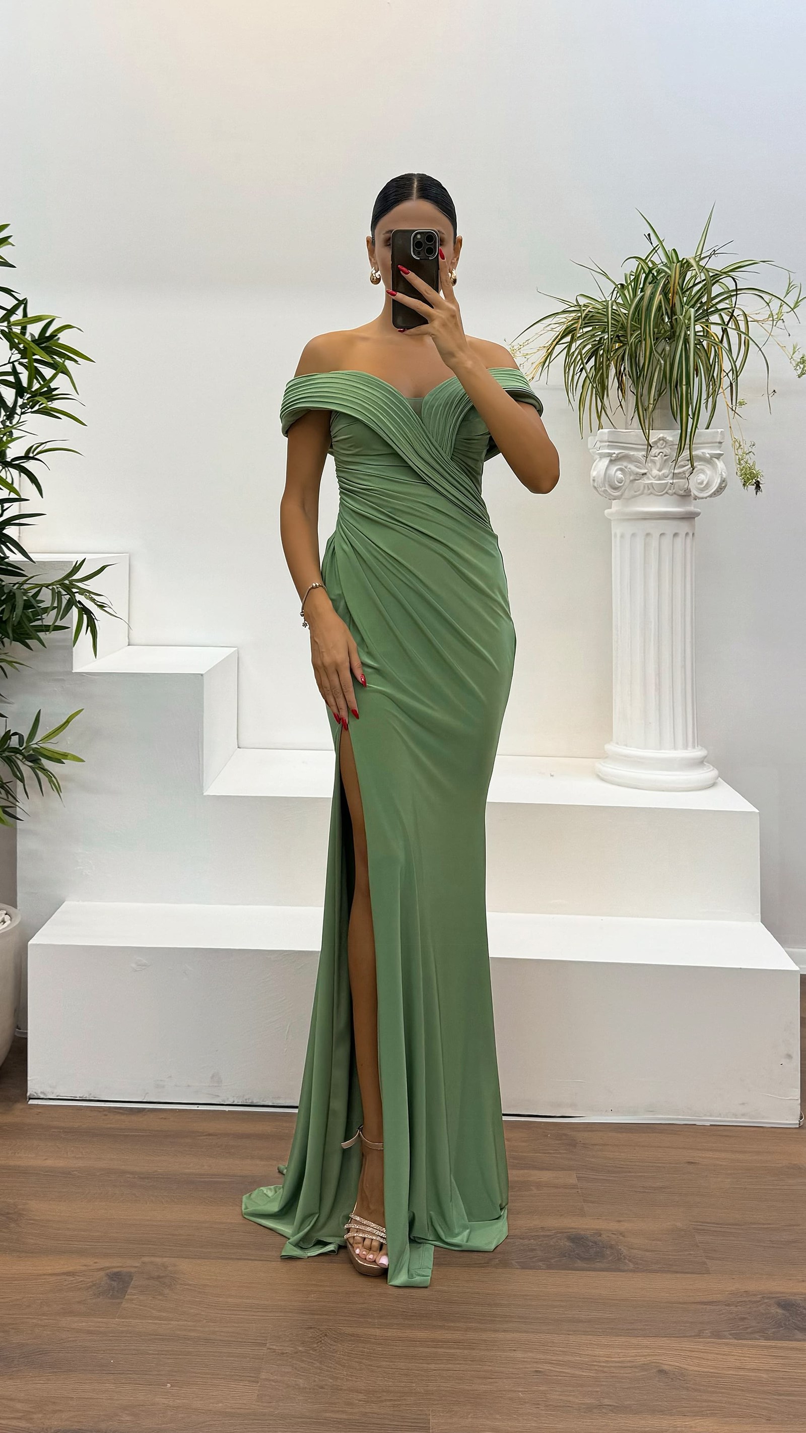 Abito da sera drappeggiato con scollo a barca Il prodotto è adatto alle taglie dalla 36 alla 44, con coppe preformate, foderato, con spacco, chiusura posteriore con cerniera, progettato come un abito da sera drappeggiato. Lunghezza del prodotto: 160 cm. Tipo di tessuto: Jersey Lycra, Poliestere.