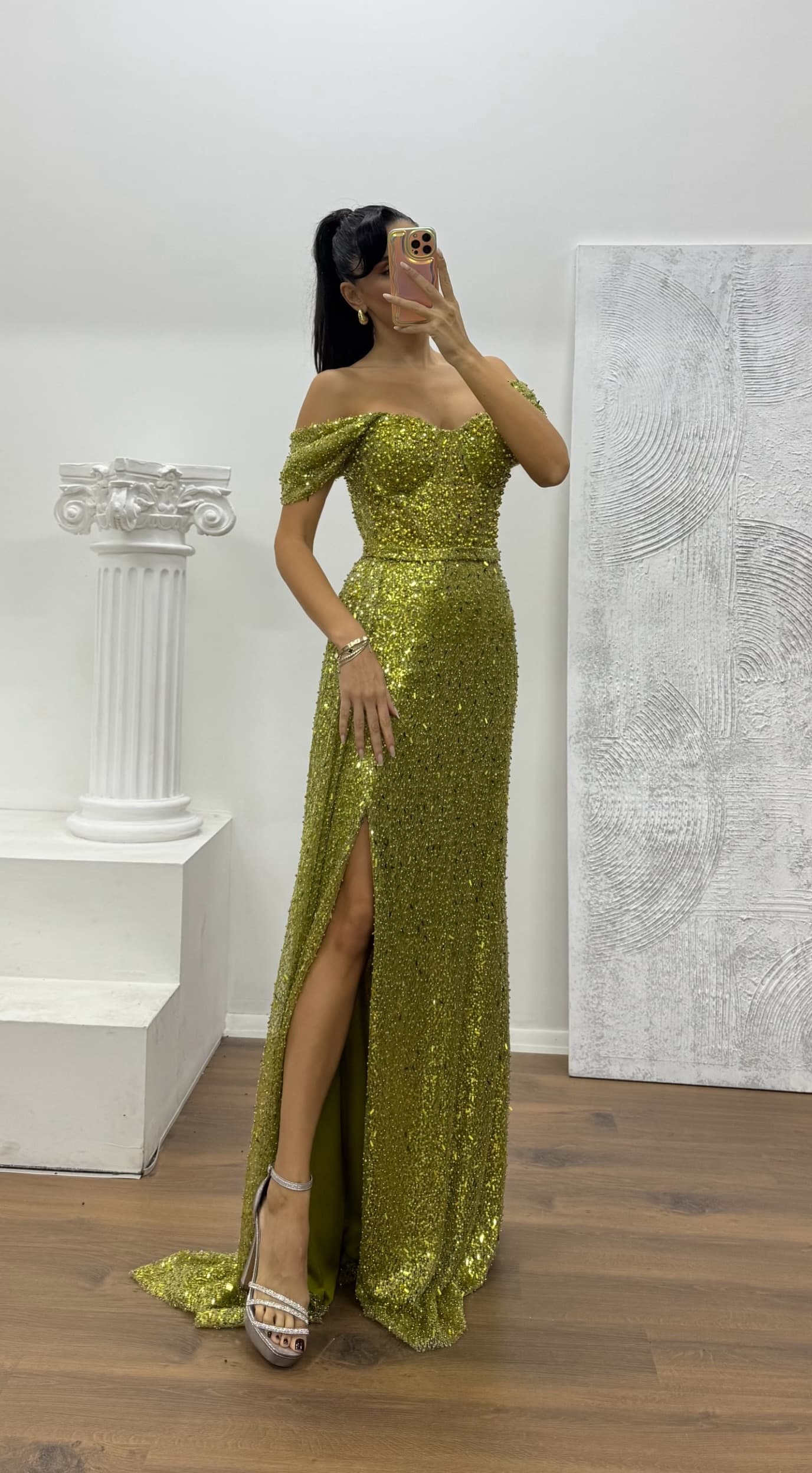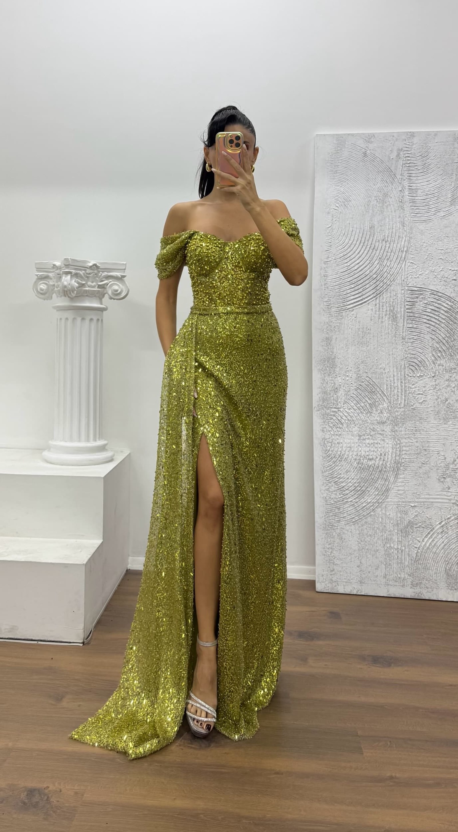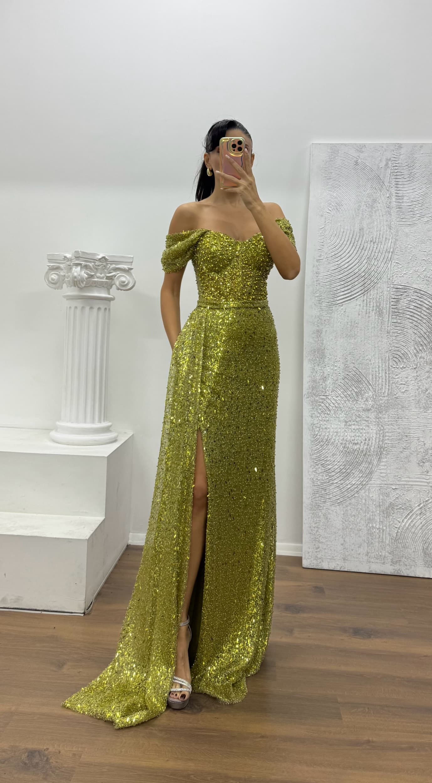 Abito da sera con scollo a barca e dettaglio trasparente in vita Il prodotto è adatto alle taglie 36–44, ha coppe integrate, è foderato, presenta una chiusura con zip sul retro ed è progettato con uno spacco. Lunghezza del prodotto: può variare tra 170 e 175 cm. Tipo di tessuto: tessuto paillettes, 100% poliestere. Una scelta ideale per distinguerti con eleganza a matrimoni, fidanzamenti, lauree o eventi speciali.